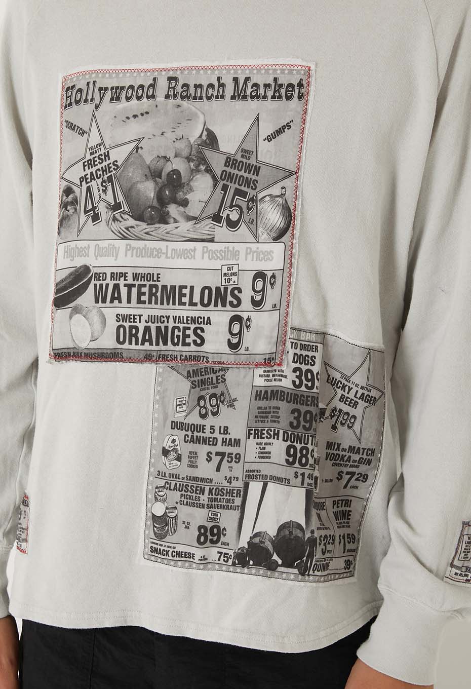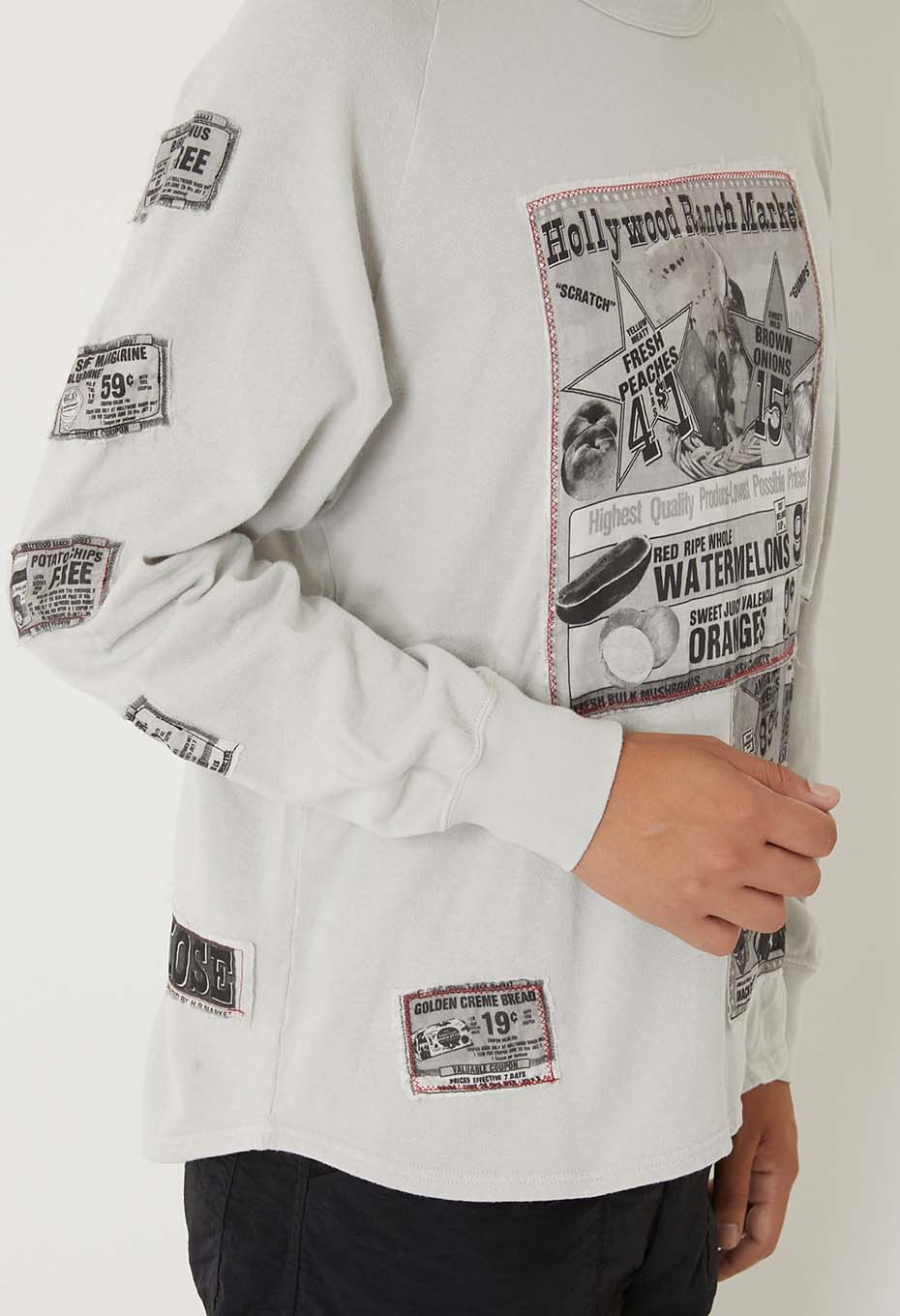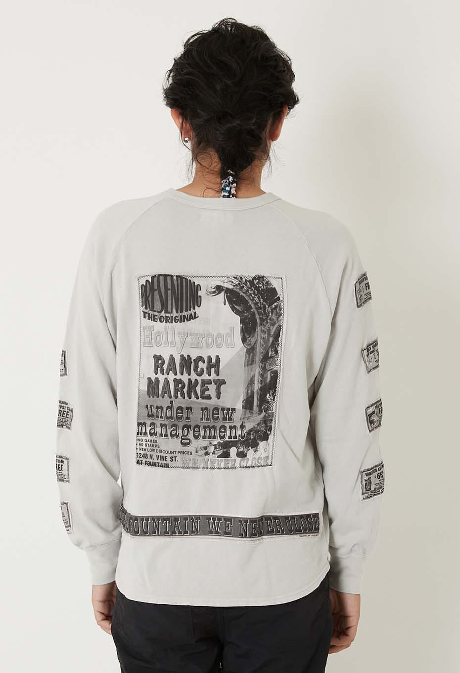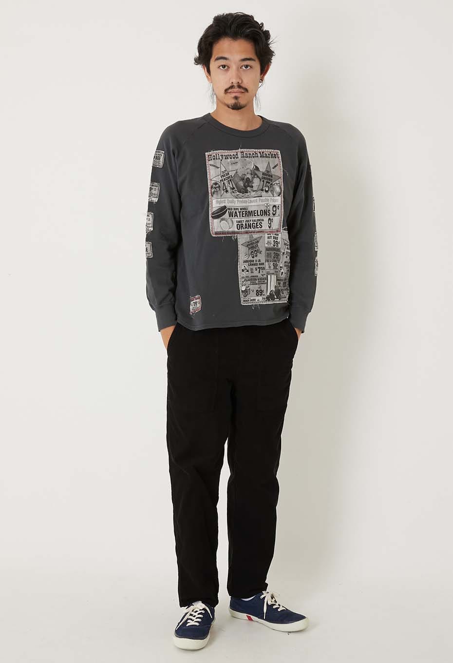 古い広告をモチーフとしたオリジナルプリント生地に、大胆なステッチワークでパッチワークを施したスウェットです。