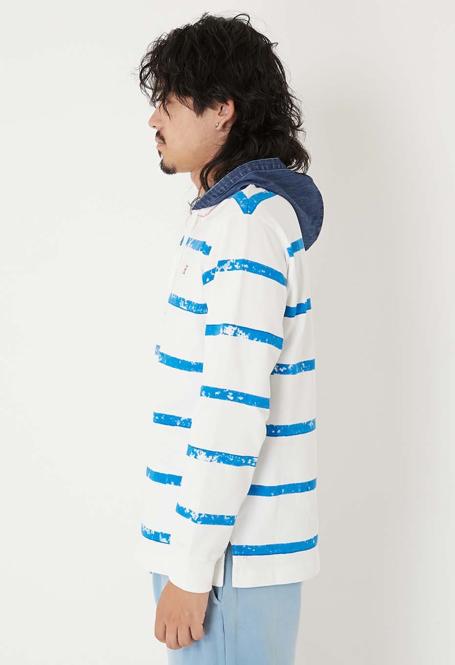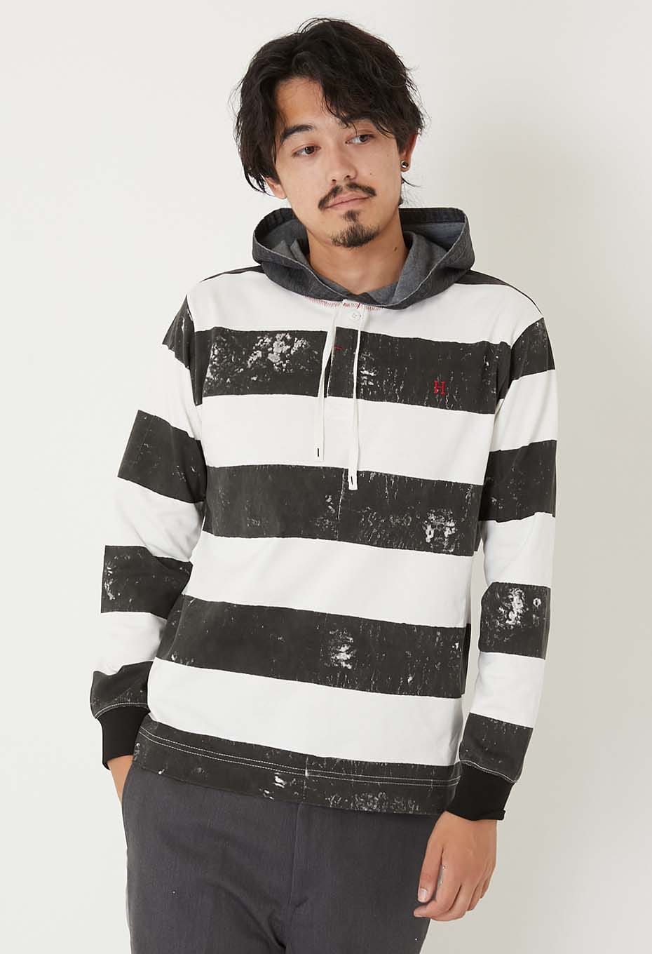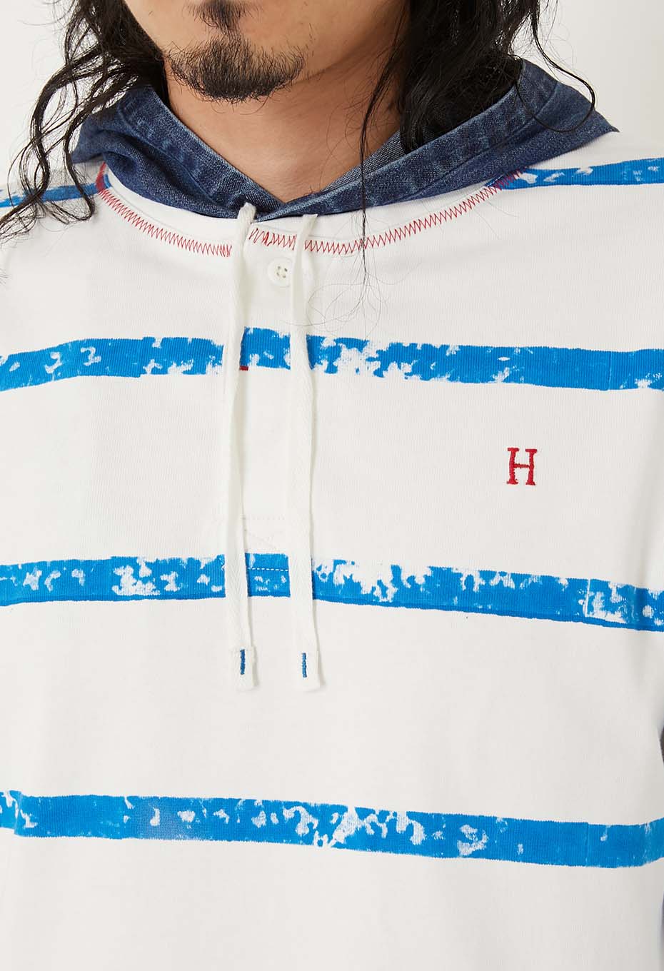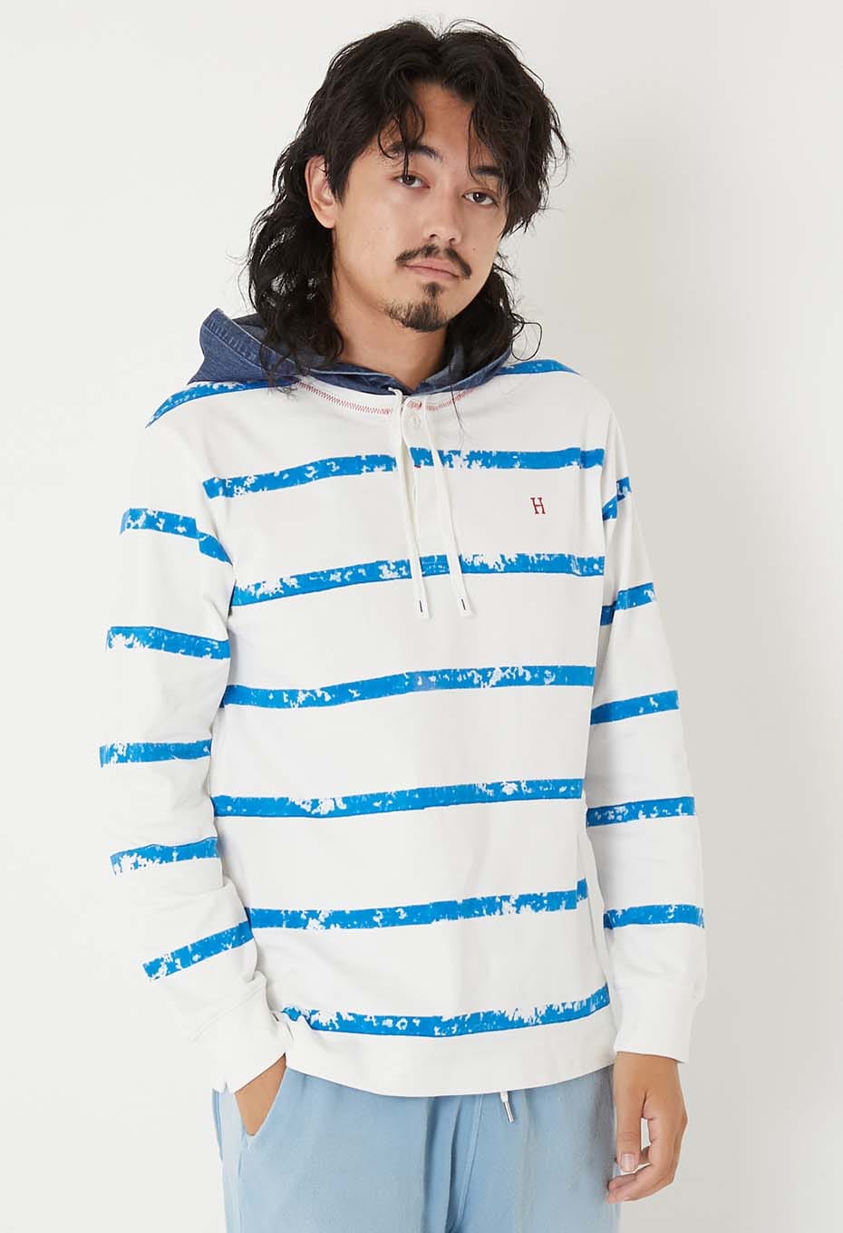 レイヤードしたようなデニムのフードと胸に施したH刺しゅうがポイントで、ゆとりある着こなしをお楽しみいただけます。
