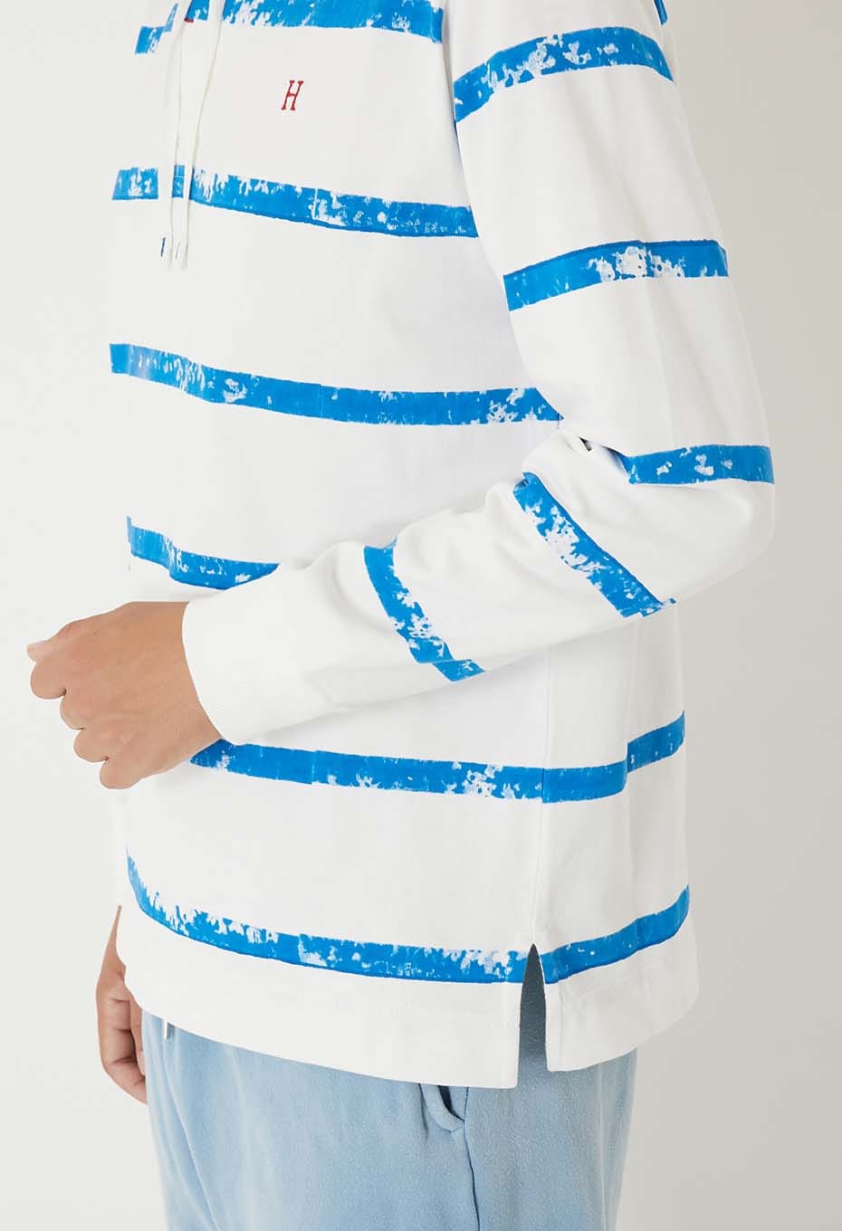 インドの伝統技法であるブロックプリントを用いボーダーを表現したラガーシャツです。