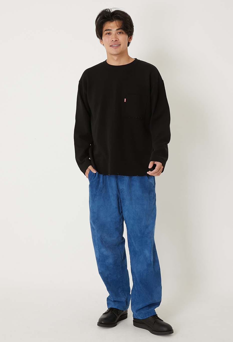 製品をINDIGOの染料のムラ染めを施しており、深い味わいを醸し出しています。洗いざらしを心地よく着ていただきたいドライタッチな質感、INDIGOの経年変化を楽しんで頂きたい商品です。