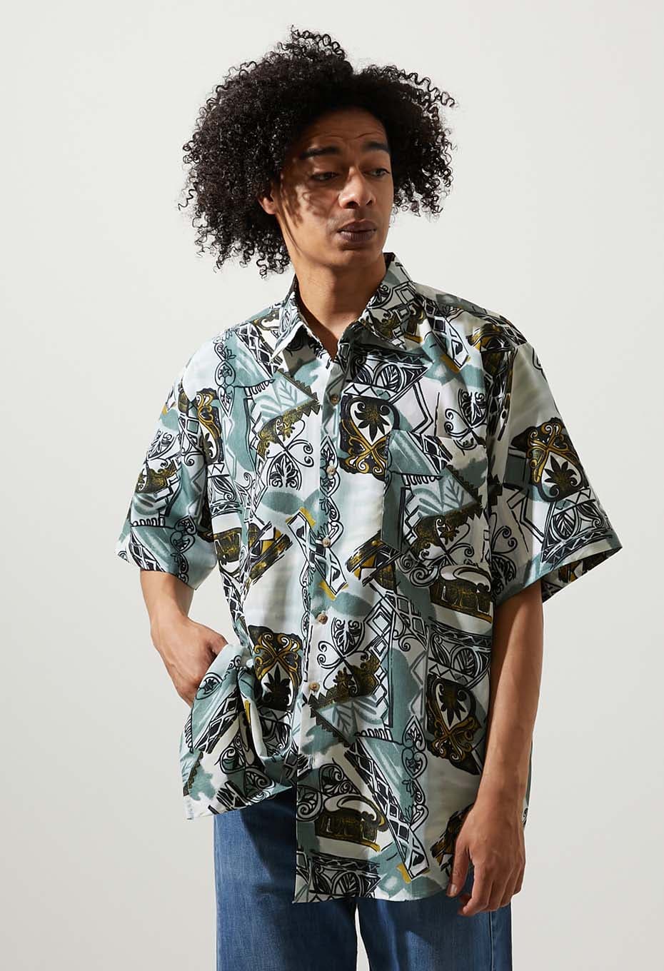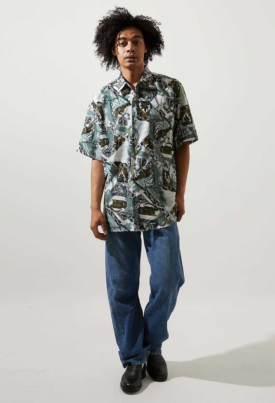 - ヨーロッパ企画のプリントシャツです。ハンドドローイングのようなタッチの線や、陰影をイメージしたような配色でプリントされたデザインが特徴です。あえて柄を合わせていないせいか、面白いまとまり方に仕上がっている一着です。