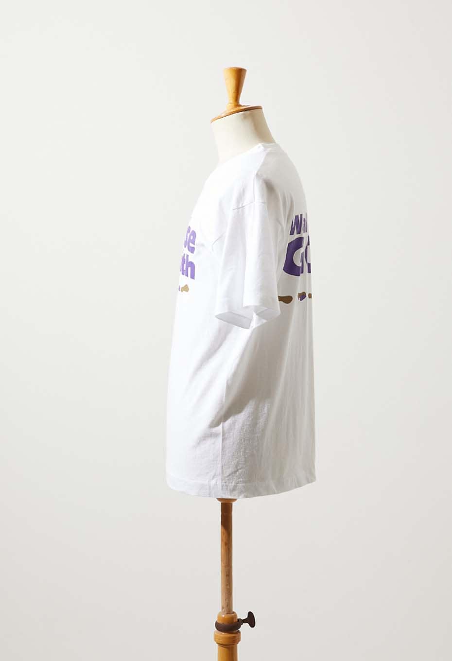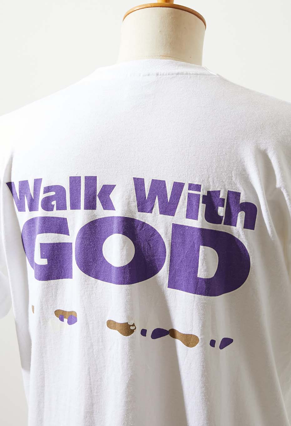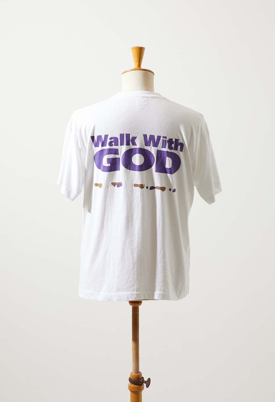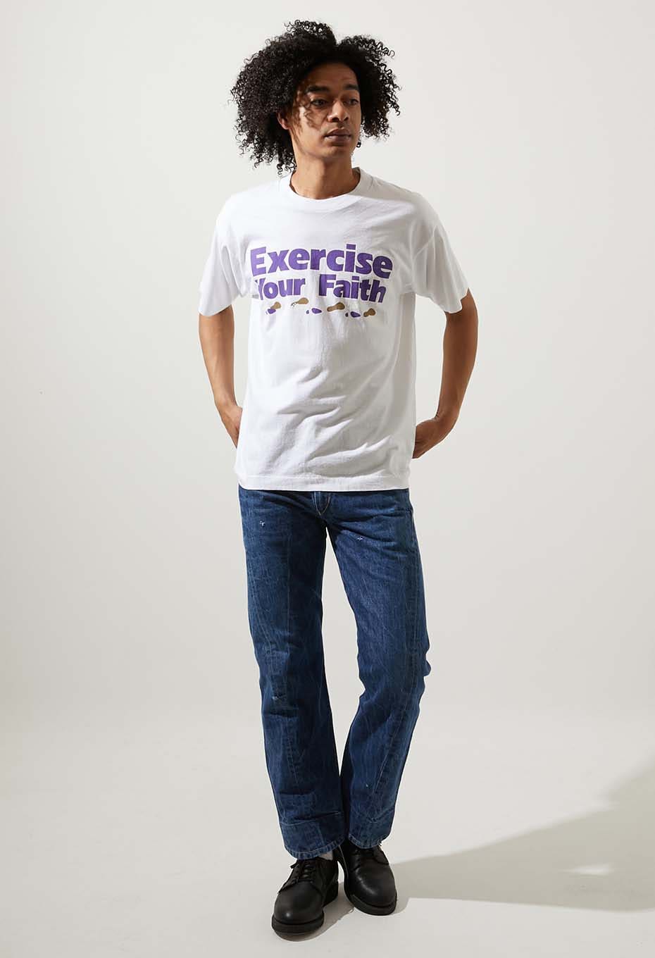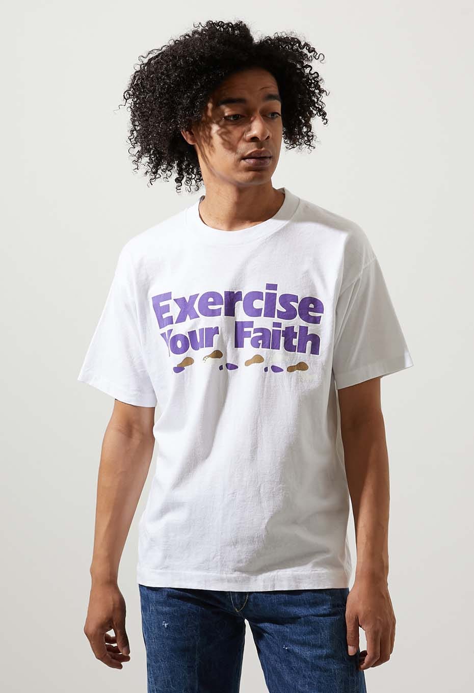 - 前後にプリントが施されたTシャツです。前面の「EXERCISE YOUR FAITH」を直訳すると「信仰を実践する」ですが、「祈りを捧げる」や「誠実である」という意味にもなります。背面の「WALK WITH GOD」というプリントは「神とともに歩む」という直訳に加えて「正義」、「慈悲」、「正直さ」など「神が求める価値基準に基づいて行動する」とも言い換えられます。