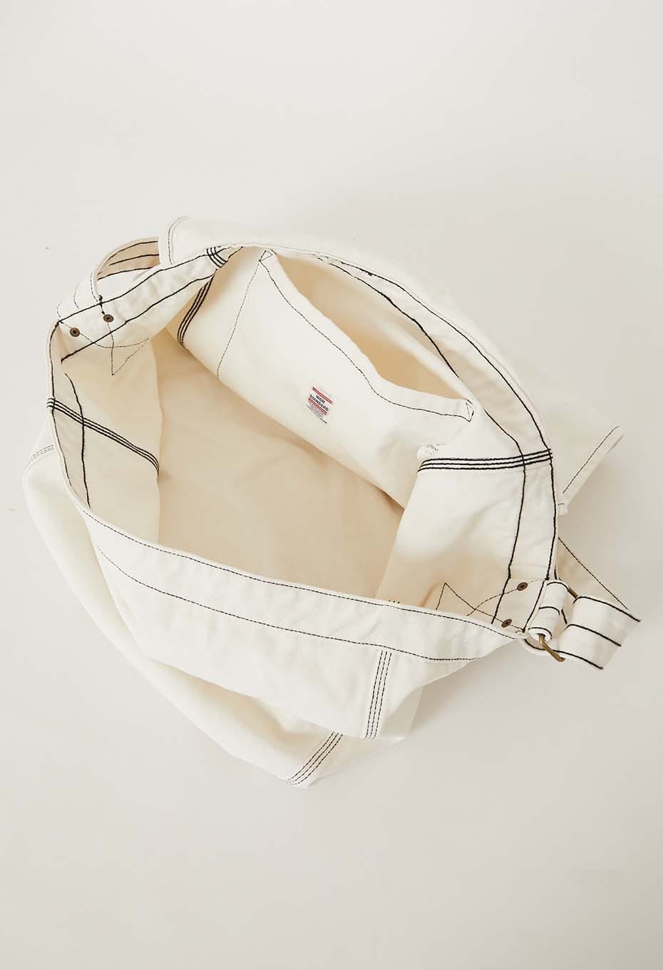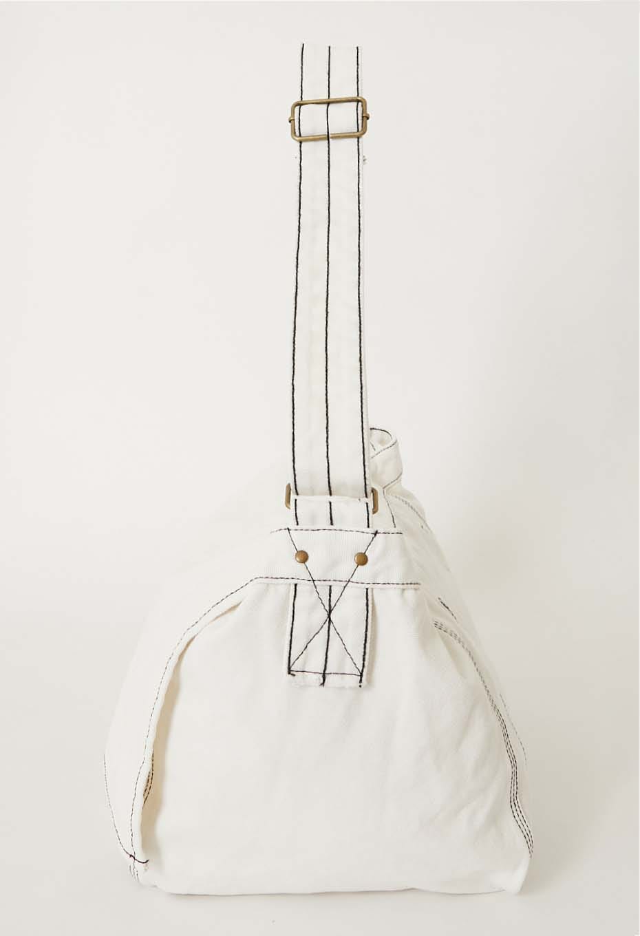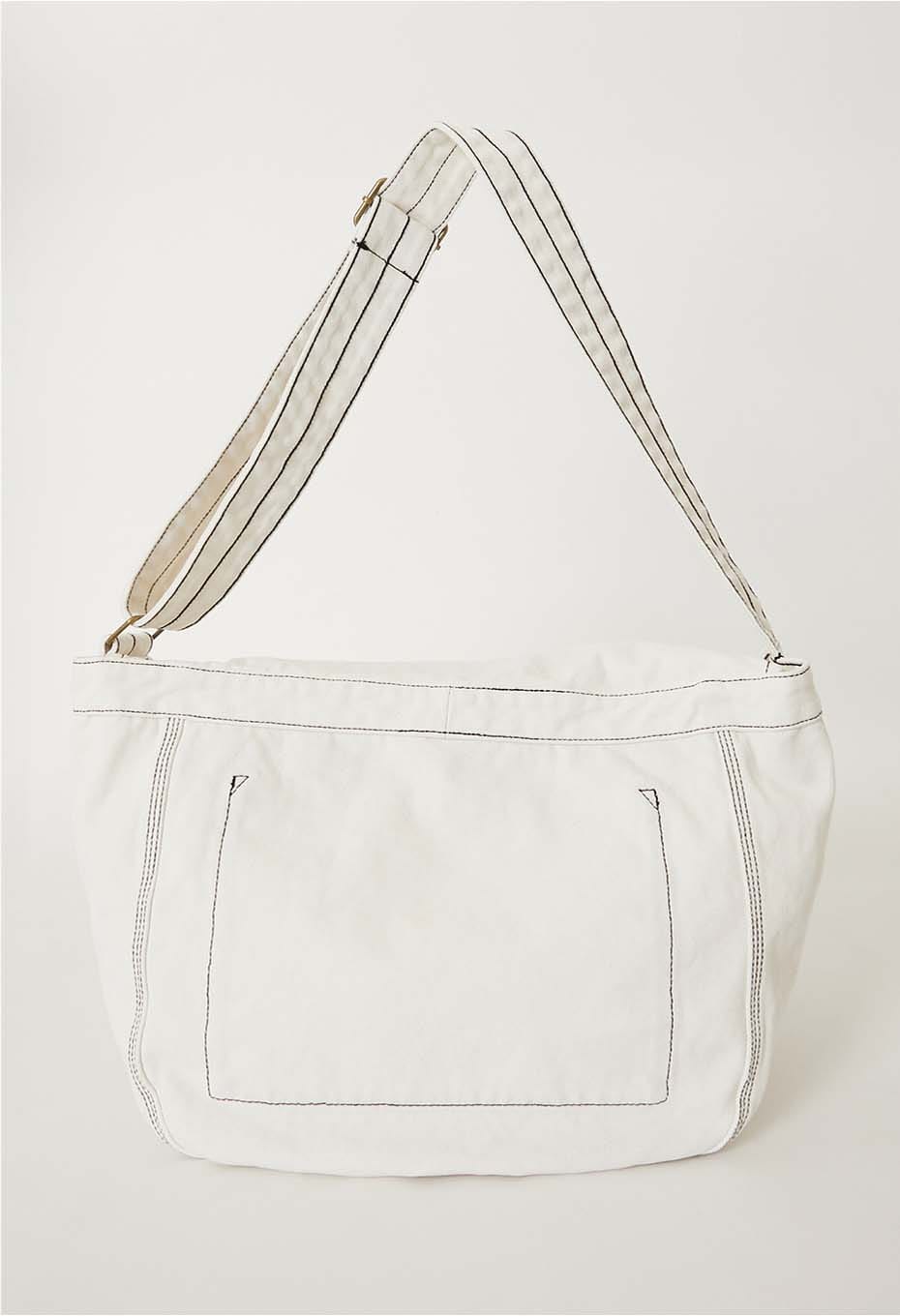 ボディとステッチの配色やチェーンステッチなど、細部のディテールが特徴のニュースペーパーバッグです。