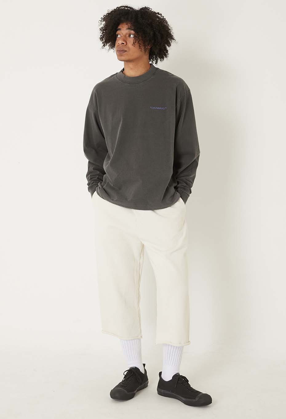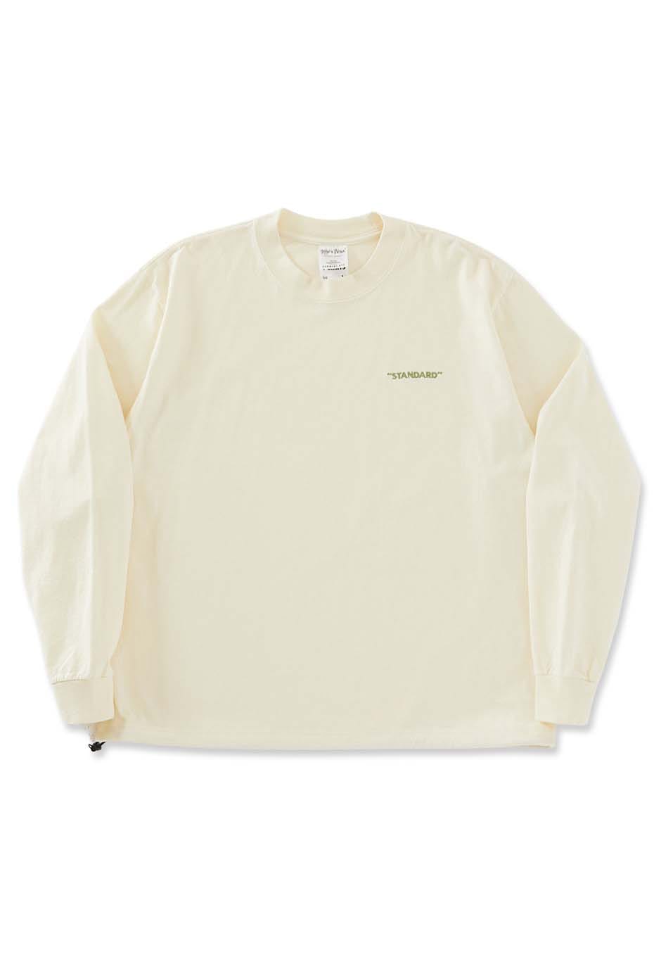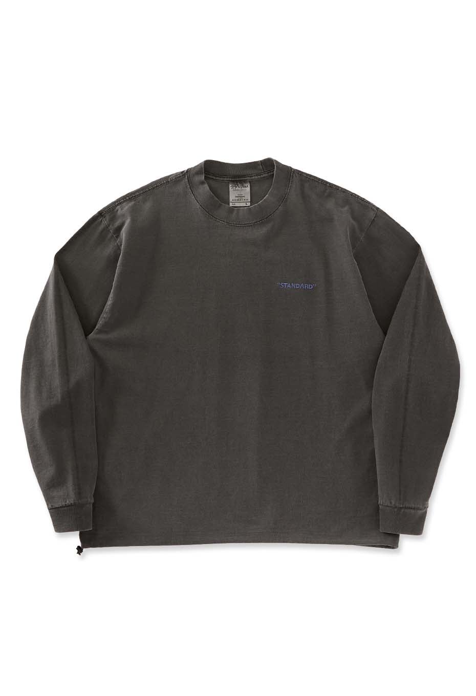 SHAKAWEARのガーメントダイシリーズの長袖Tシャツに「STANDARD」の刺しゅうを施し、裾にはドローストリングを配しています。スウェットのような丸みのあるシルエットに変化させることができます。