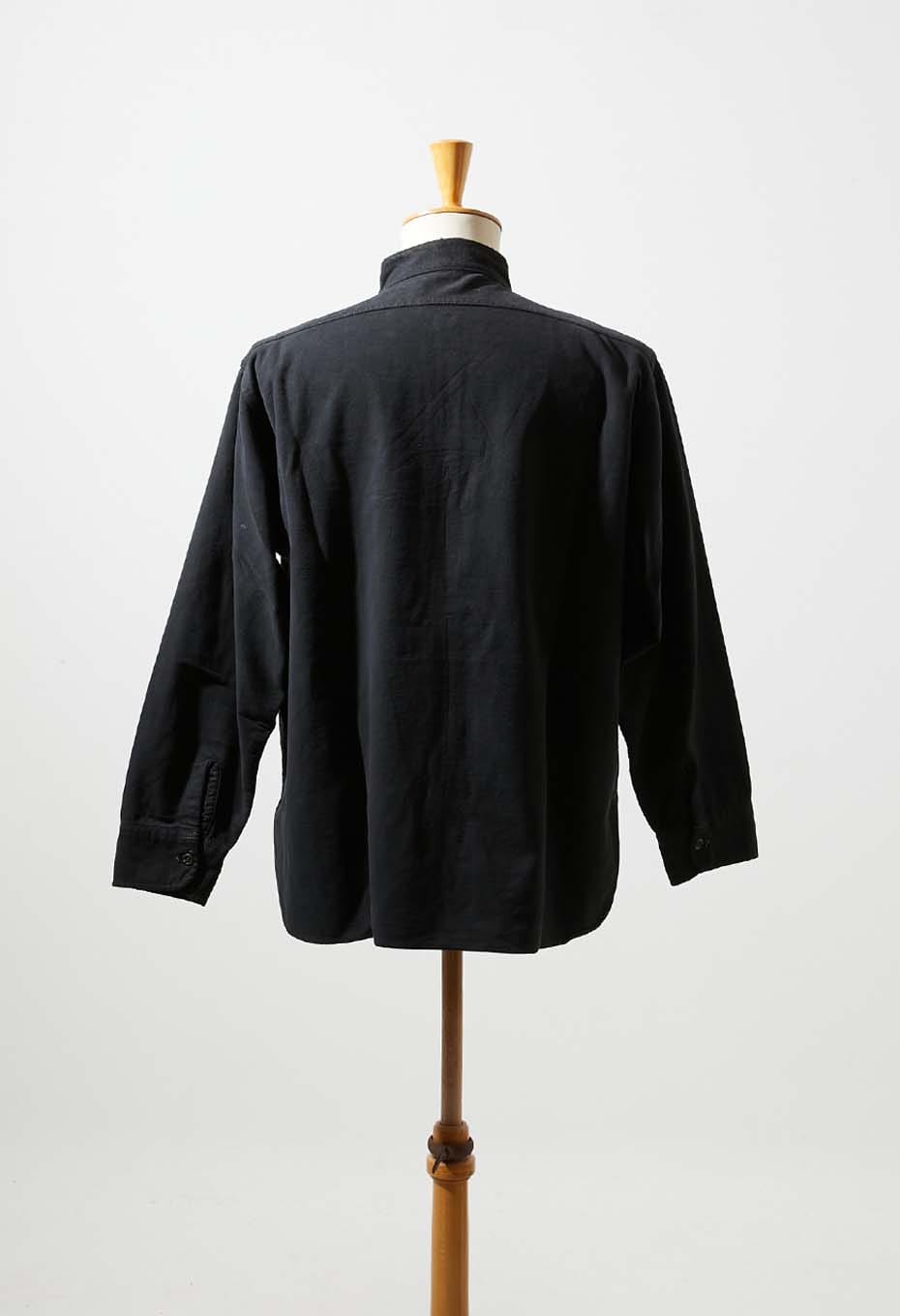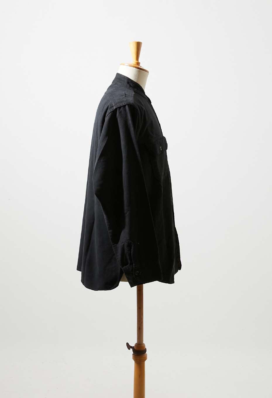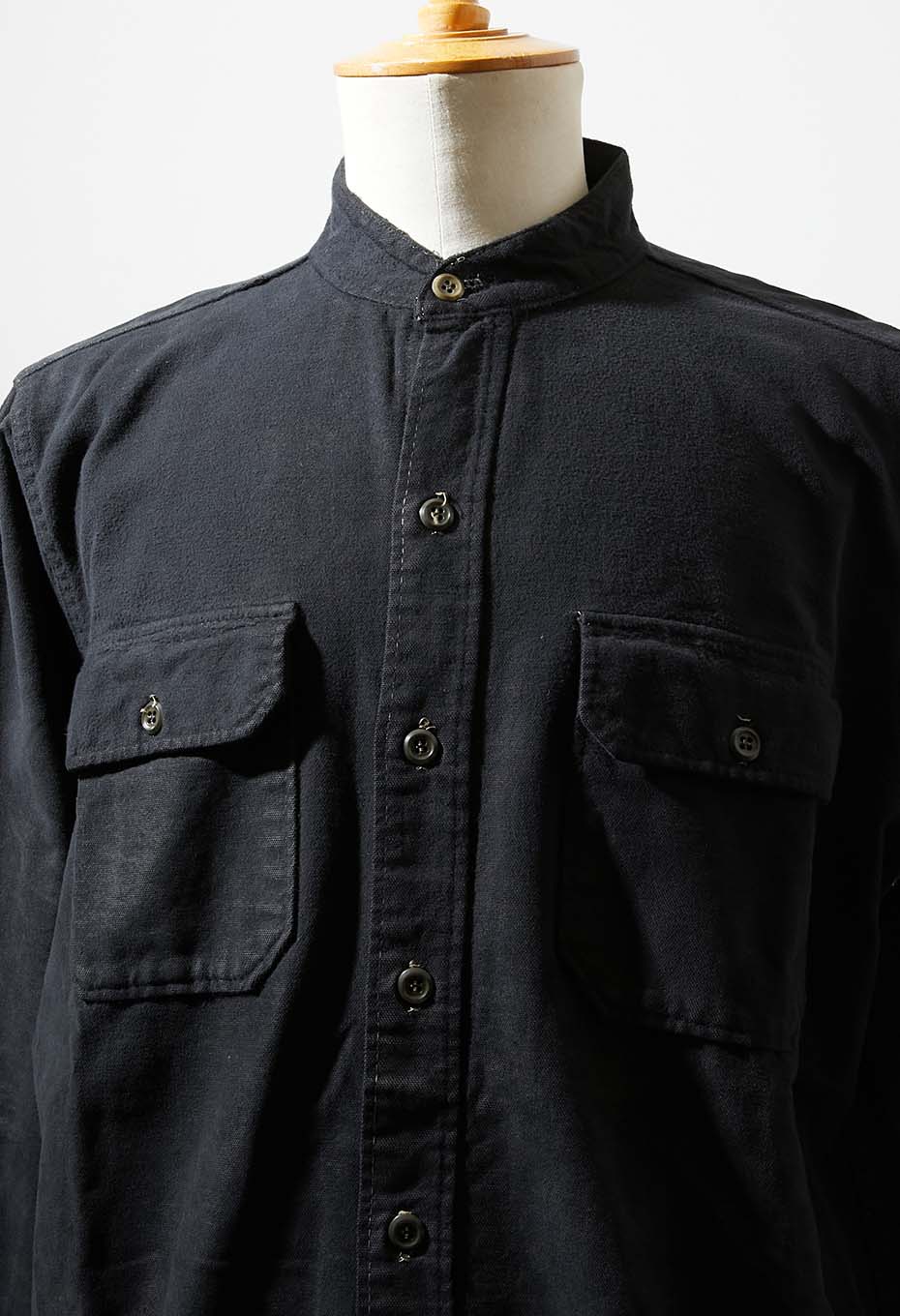 - 1980年台のWOOL RICH社のフランネルシャツです。襟をカットオフし、スタンドカラーにしました。両胸にダブルフラップを配したベーシックワークシャツスタイルで、後染めならではのチャコールグレーのような色味が特徴です。