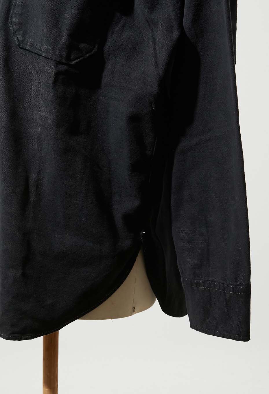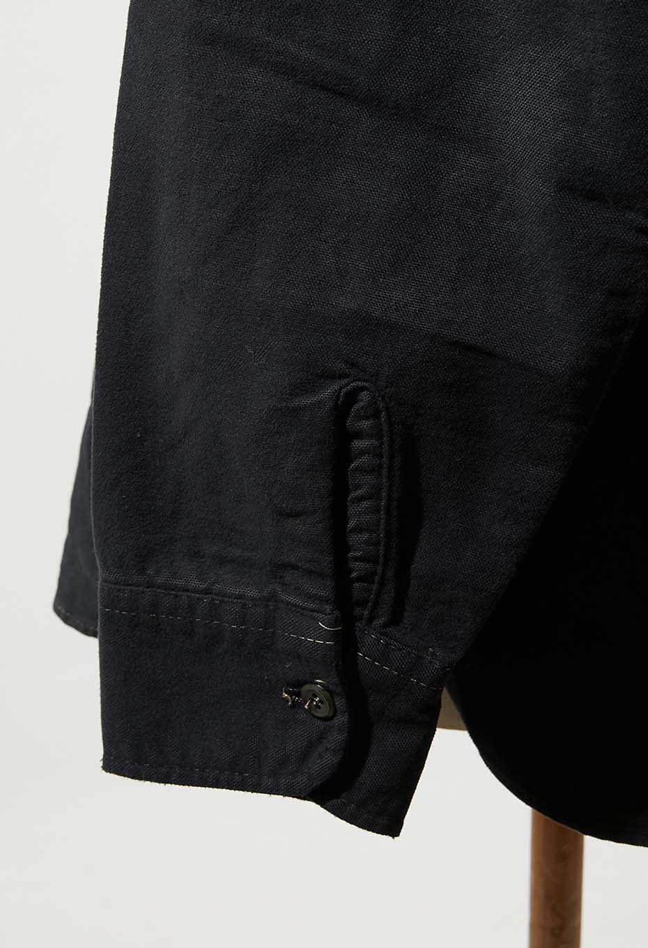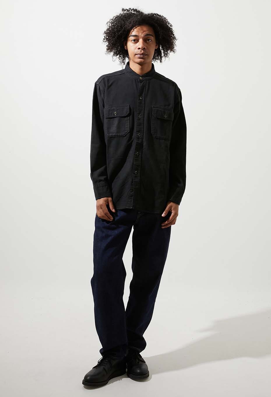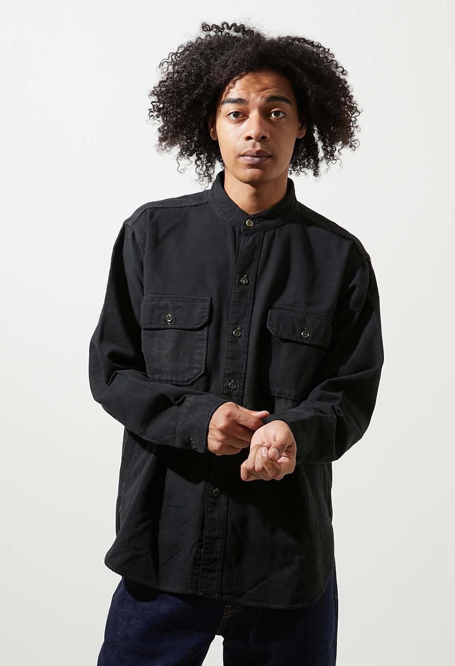 - 1980年台のWOOL RICH社のフランネルシャツです。襟をカットオフし、スタンドカラーにしました。両胸にダブルフラップを配したベーシックワークシャツスタイルで、後染めならではのチャコールグレーのような色味が特徴です。