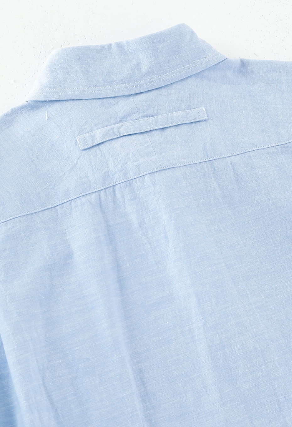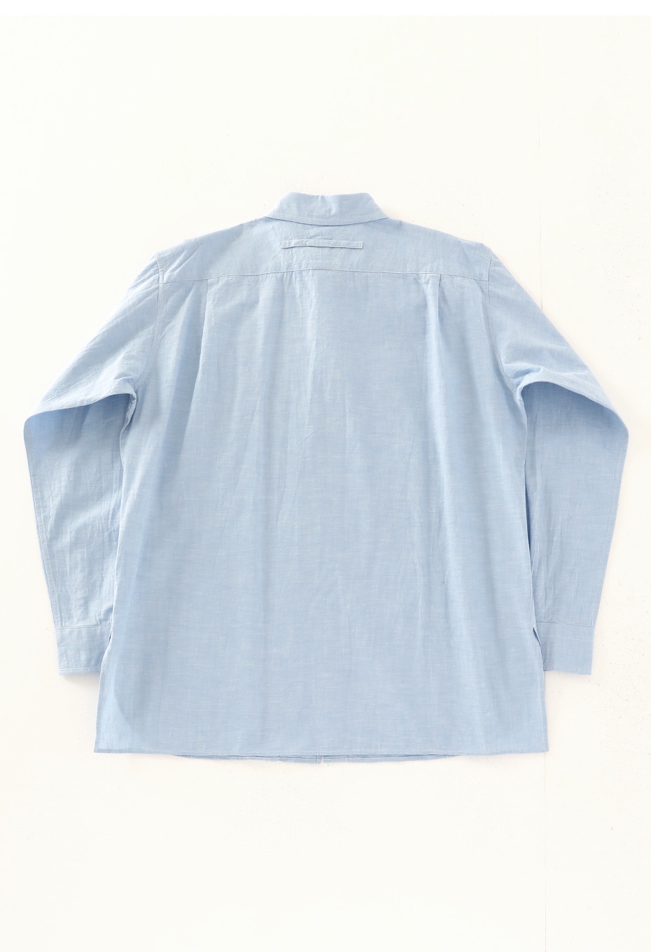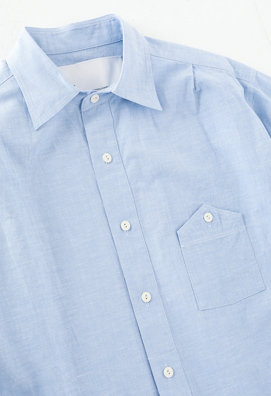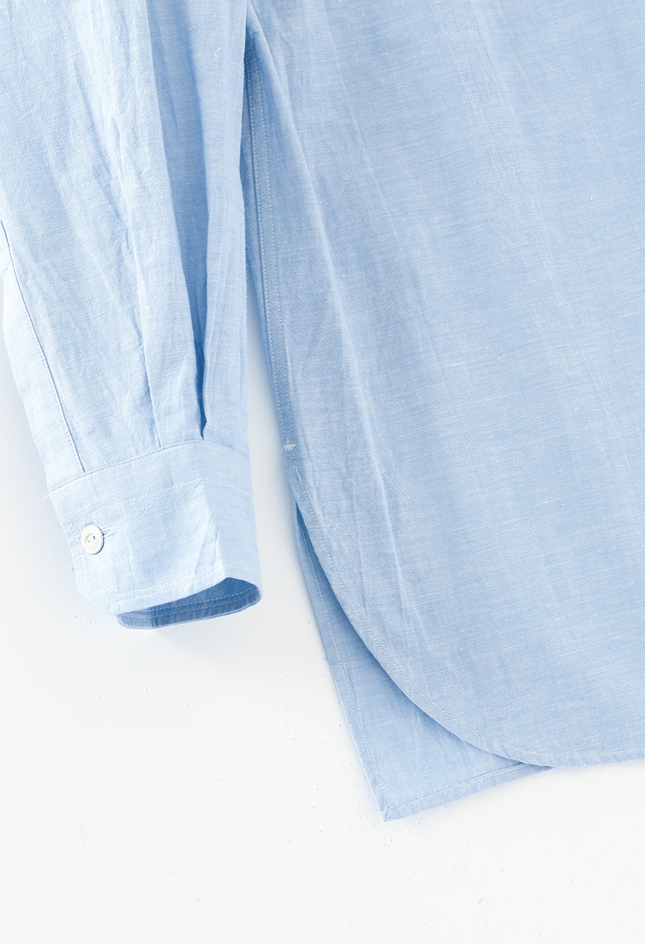 超長綿を原料としたマナプール糸を用い、タテ糸とヨコ糸を色差のある別色に染めたシャンブレー生地を採用しています。90年代ヨーロッパ製デニムを思わせる紫がかったインディゴブルーと、自然な色落ち感を表現しています。化学溶剤を使わず強めの洗いで仕上げることで、やわらかな風合いと奥行きのある上品さを感じていただけます。コンパクトなシルエットで、きれいめにもラフにも合わせやすいデザインです。