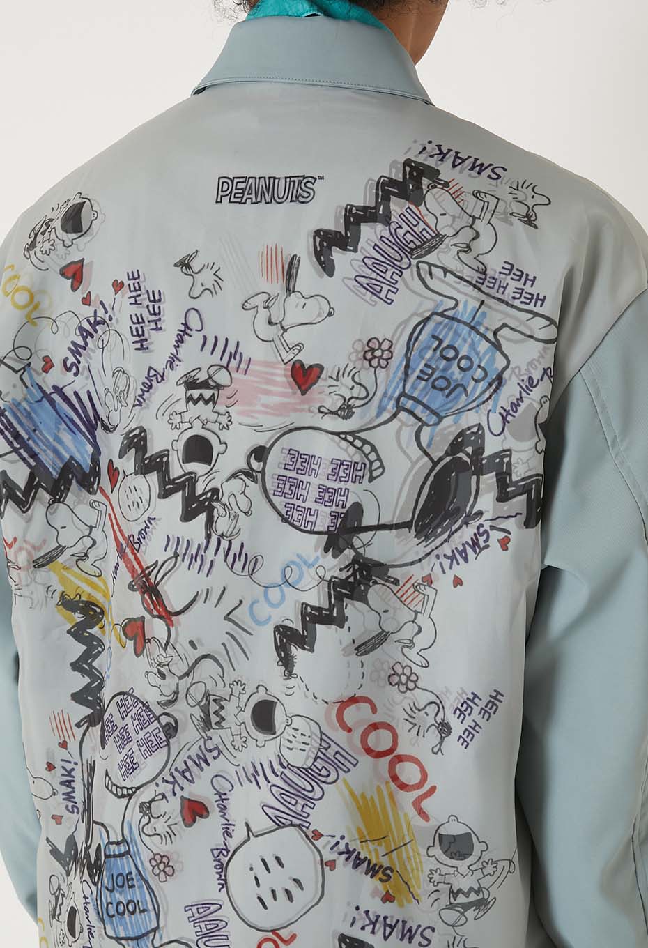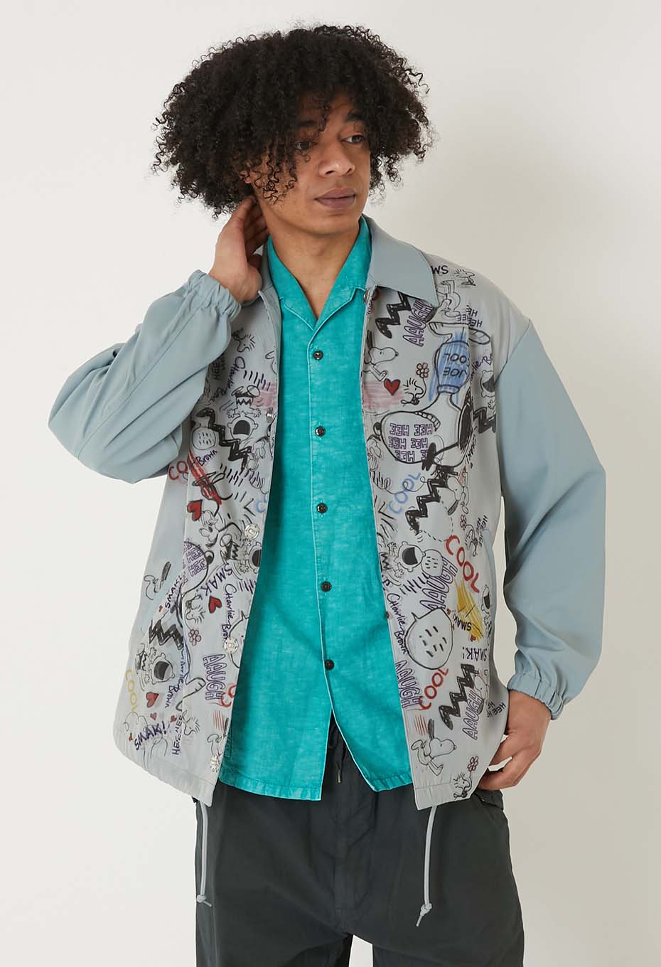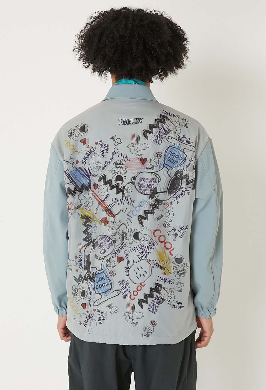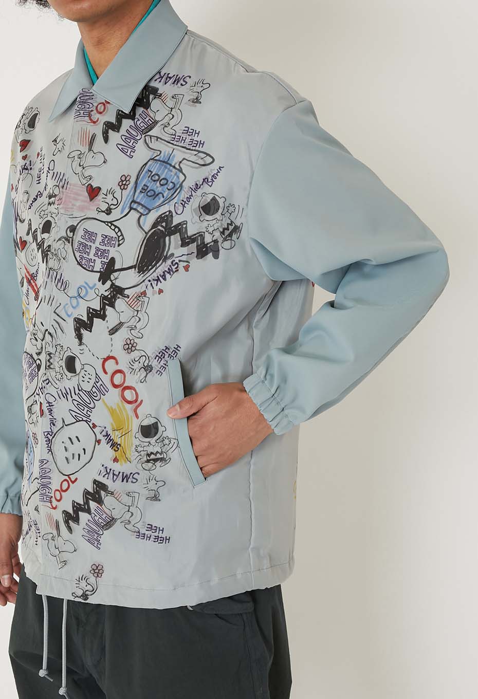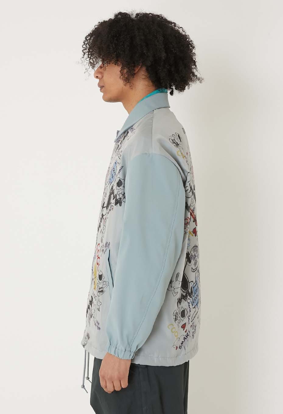 - ストリートなスヌーピーのグラフィックが全面に表現されたコーチジャケットです。前身頃が二重構造で立体的にグラフィックを表現しています。