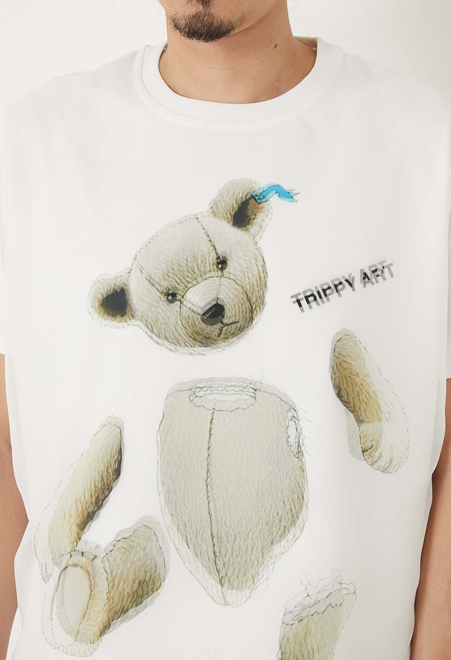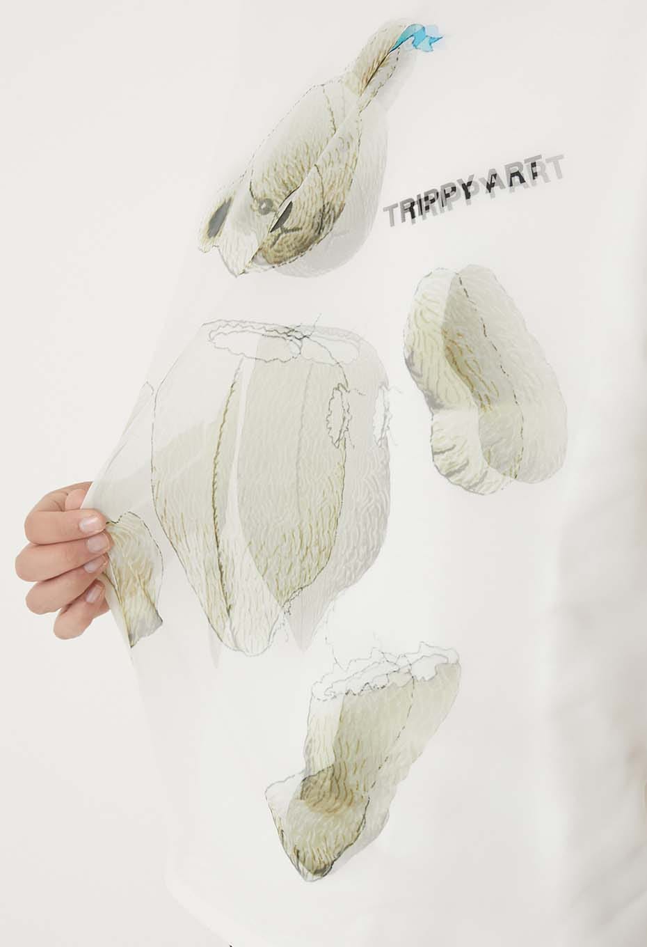 - 壊れてしまったテディベアを水彩絵の具で描いたデザインで、前身頃がオーガンジーとの二重構造で立体的にグラフィックを表現した一枚です。オリジナルアートを3Dで表現する特殊な技法で仕上げています。素材は着心地が良くシワになりにくいオリジナル生地を使用しています。ボディ前面は透明な生地と二重になっており、視覚的に揺らぎと立体感を与えます。