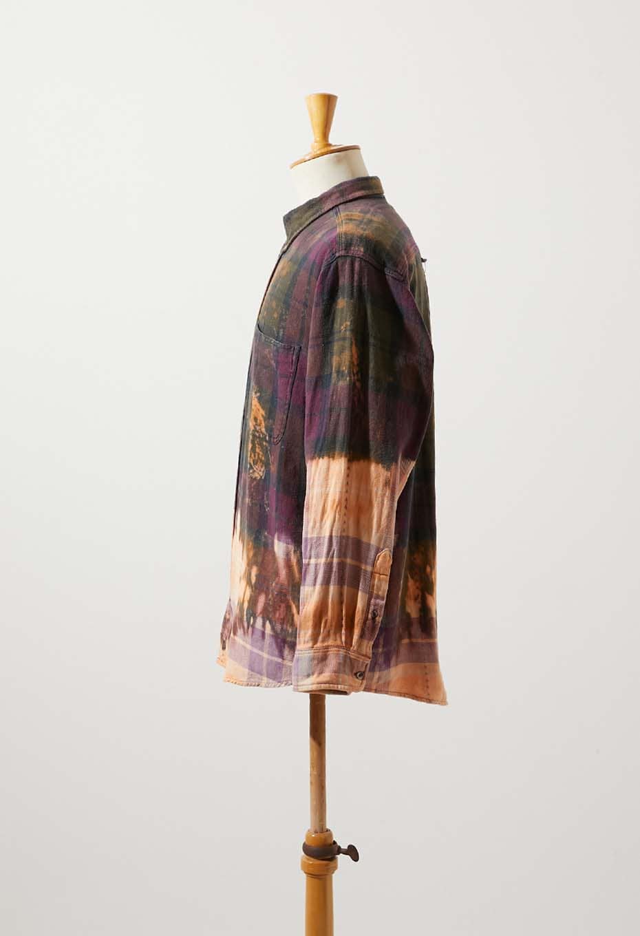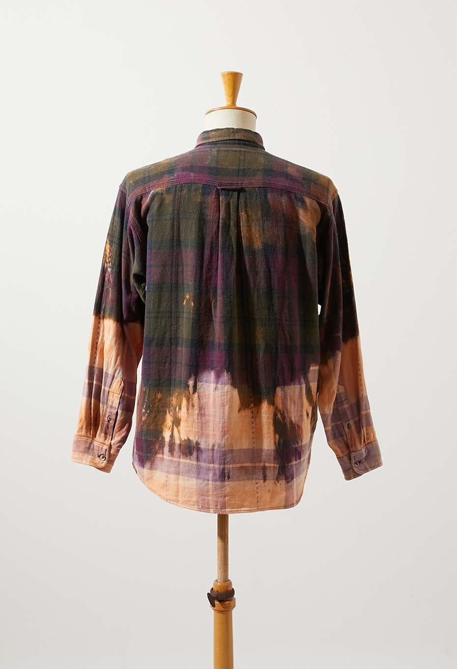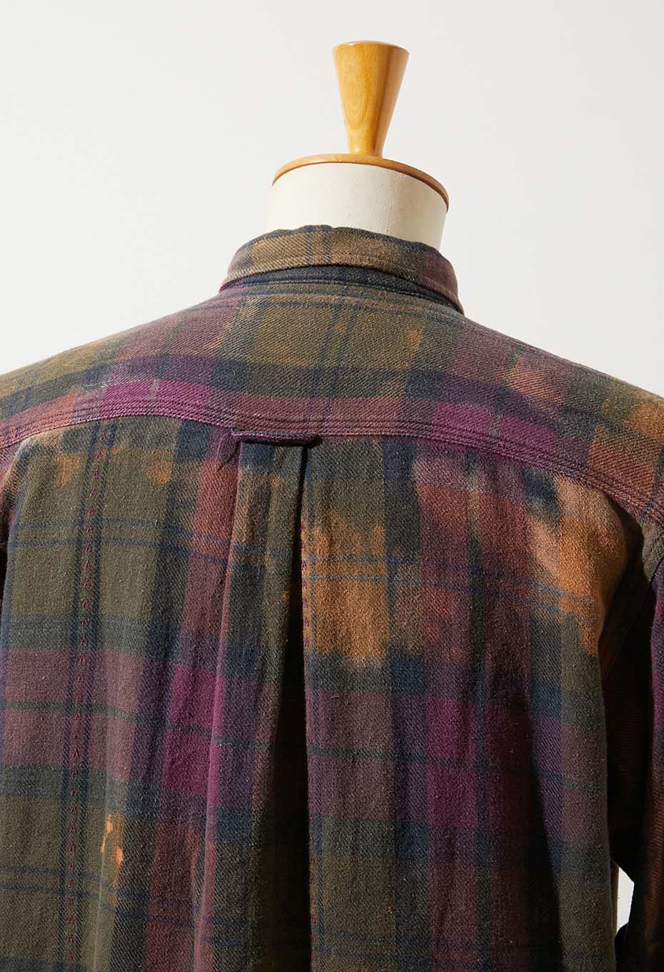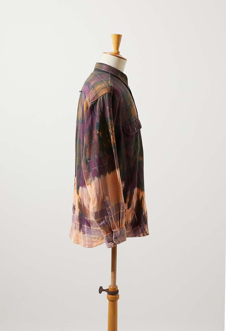 - JOHN ASHFORD SPORTの中肉生地を使用したフランネルチェックシャツです。紫と緑ミックスのチェック柄に、部分的にステッチが施されています。手作業でブリーチ加工を施したアイテムです。袖先と裾を絞りブリーチ剤に漬け込む「DIP BLEACH」という手法を用いています。。ソリッドではスタンダードすぎるアイテムですが、ブリーチを施すことでデザイン性が増します。偶然の産物で生まれた一点ものの柄や色味をお楽しみください。