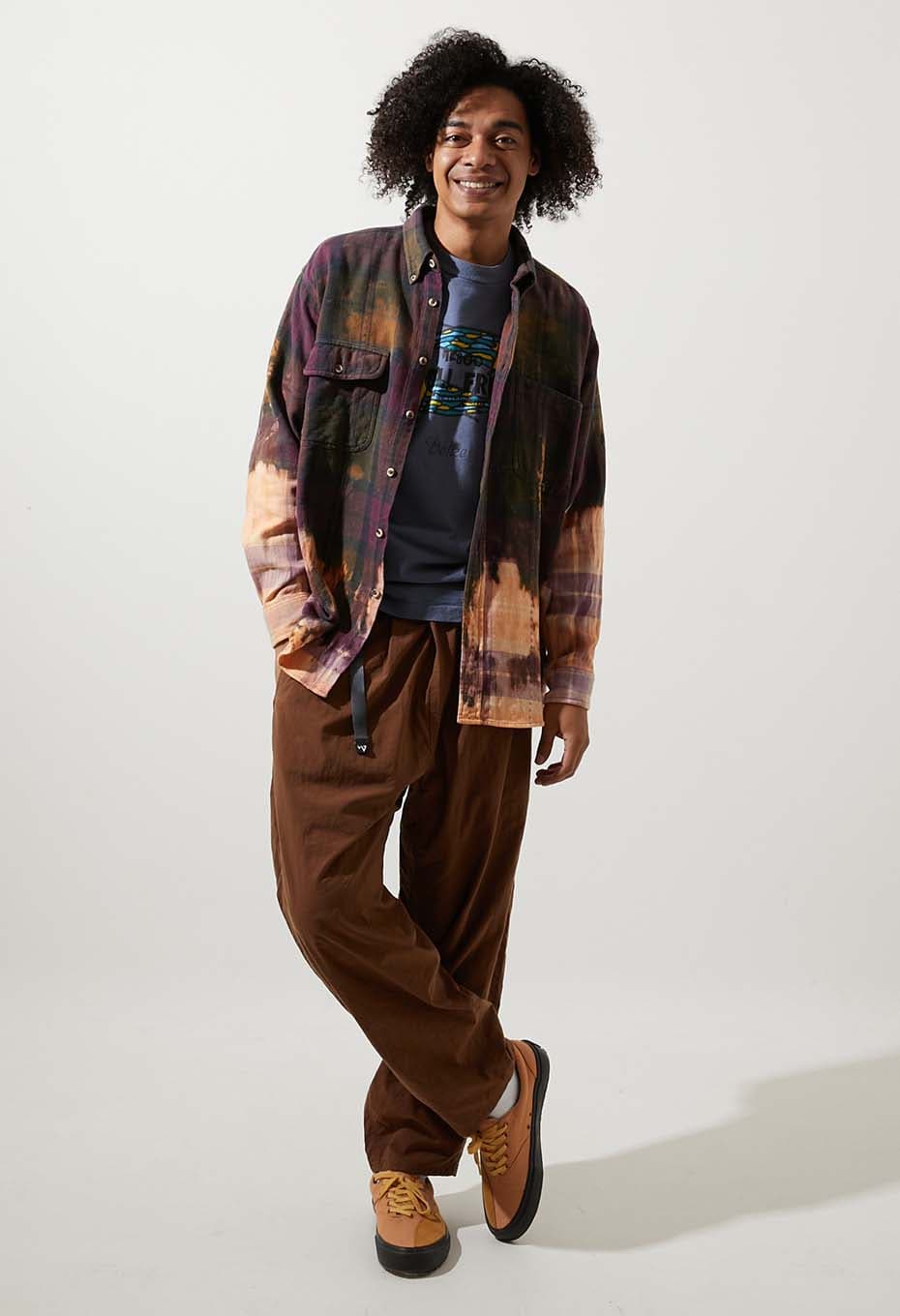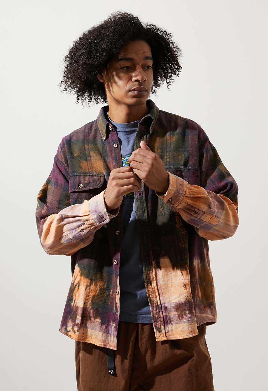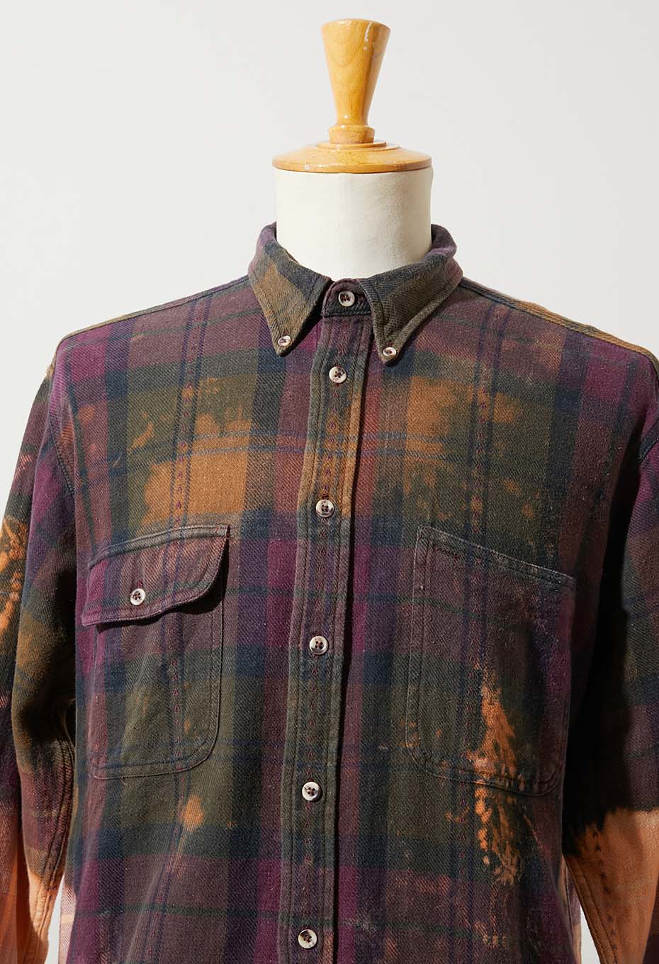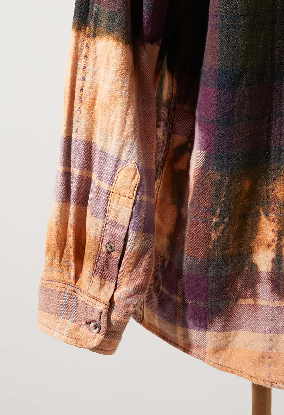 - JOHN ASHFORD SPORTの中肉生地を使用したフランネルチェックシャツです。紫と緑ミックスのチェック柄に、部分的にステッチが施されています。手作業でブリーチ加工を施したアイテムです。袖先と裾を絞りブリーチ剤に漬け込む「DIP BLEACH」という手法を用いています。。ソリッドではスタンダードすぎるアイテムですが、ブリーチを施すことでデザイン性が増します。偶然の産物で生まれた一点ものの柄や色味をお楽しみください。