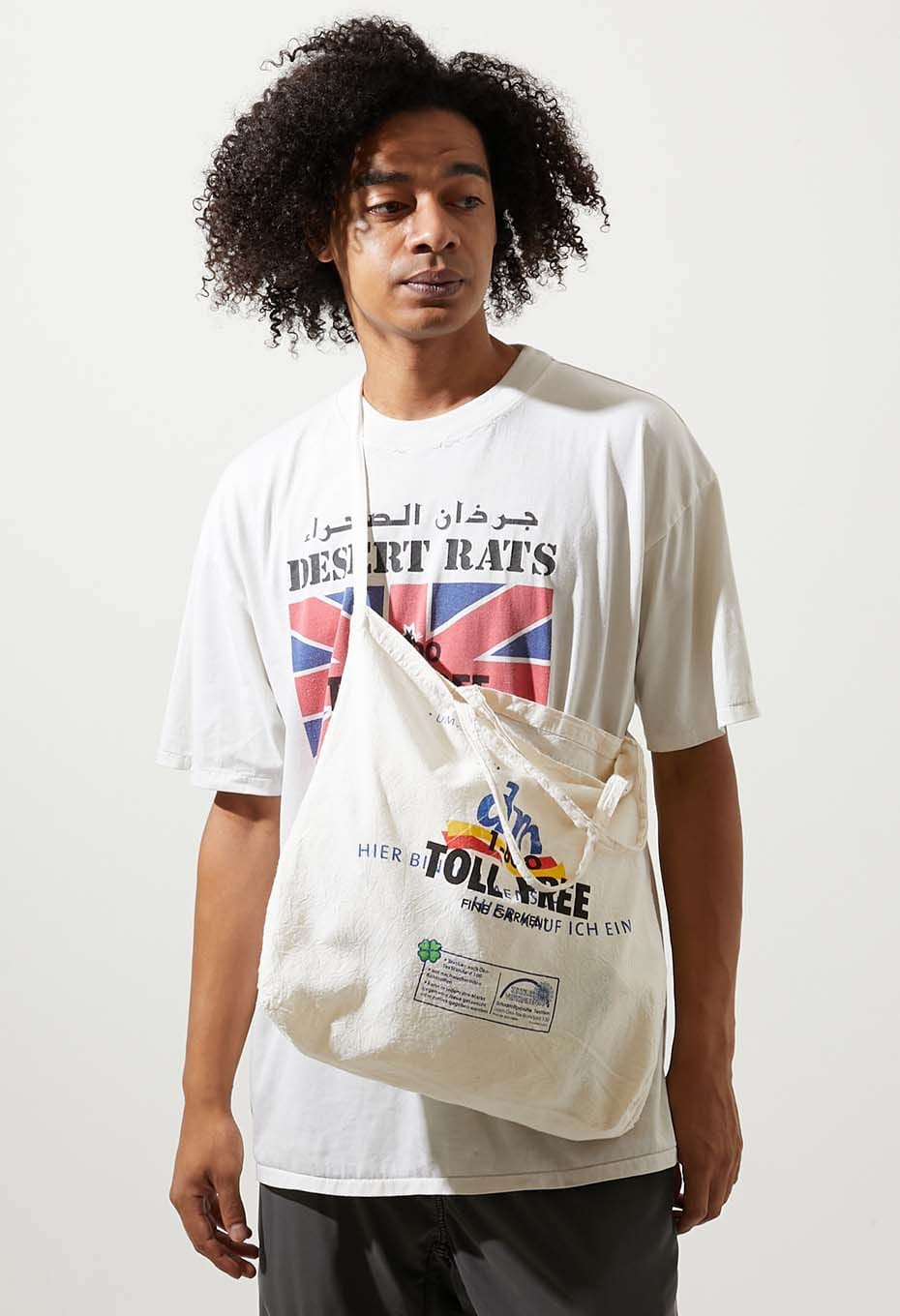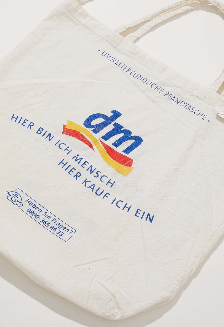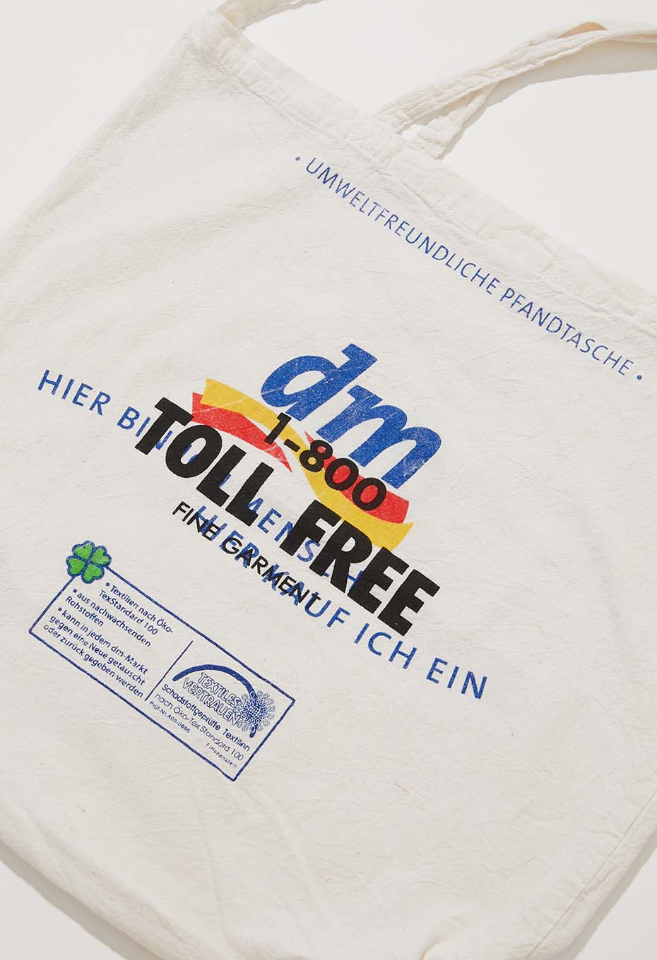 - ドイツに本社を置くヨーロッパのドラッグストア「ドロゲリエ・マルクト」のエコバッグです。その上からTOLL FREEのオリジナルロゴを手作業でオーバープリントしました。古着らしいくたっとした生地感とプリントが相まった一点ものです。