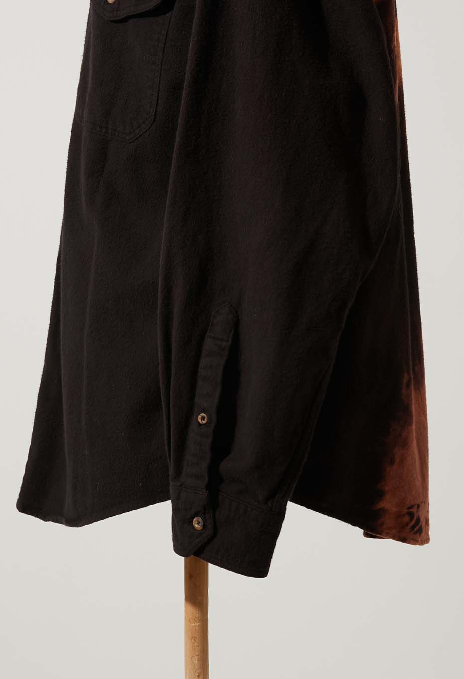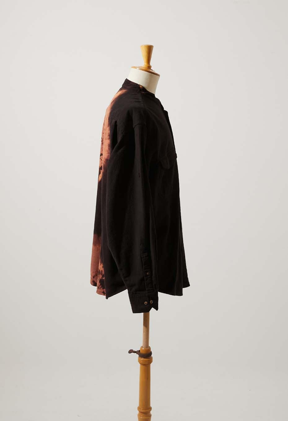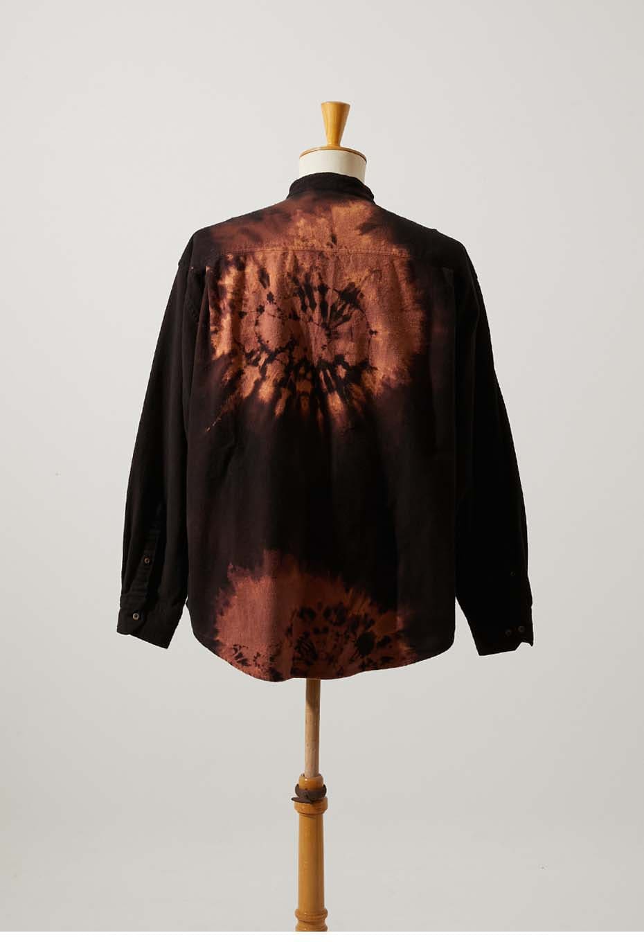 アメリカのLANDS END社製カラーフランネルシャツを黒色に後染めし、上衿をカットしたスタンドカラー仕様にカスタム。生地を強く絞ってブリーチ剤に漬け込み、大きな花火のような美しい模様を演出しています。背面および裾部分も同様の加工を施し、まるで空に打ち上げられた花火が海面に映るかのような一着に仕上げています。加工はすべてTOLL FREEスタッフによる手作業です。