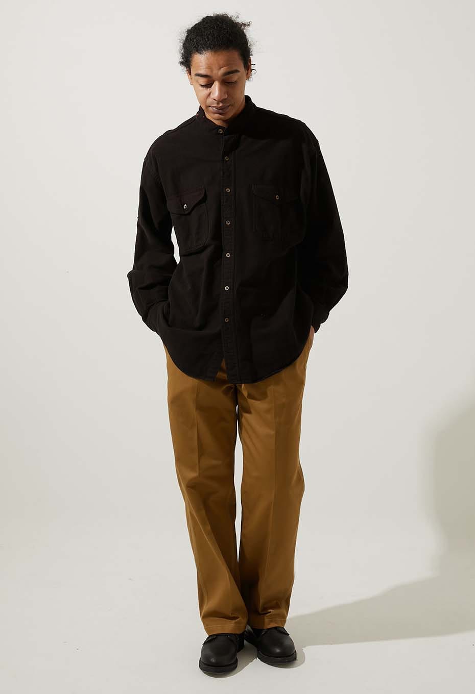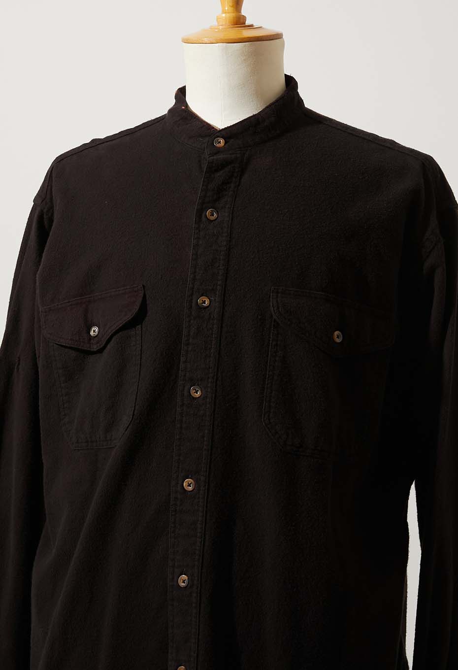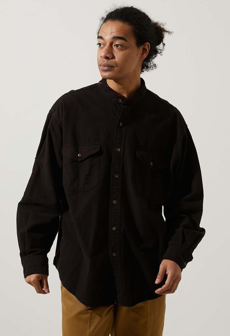 アメリカのLANDS END社製カラーフランネルシャツを黒色に後染めし、上衿をカットしたスタンドカラー仕様にカスタム。生地を強く絞ってブリーチ剤に漬け込み、大きな花火のような美しい模様を演出しています。背面および裾部分も同様の加工を施し、まるで空に打ち上げられた花火が海面に映るかのような一着に仕上げています。加工はすべてTOLL FREEスタッフによる手作業です。
