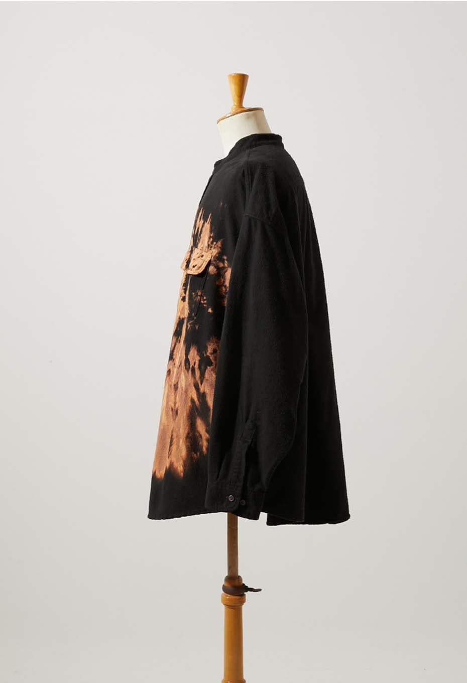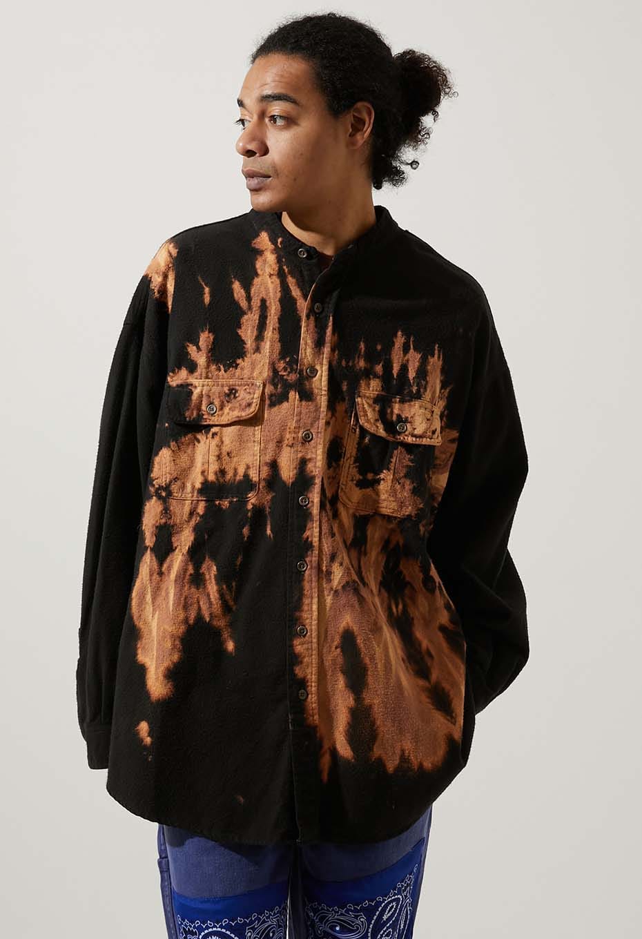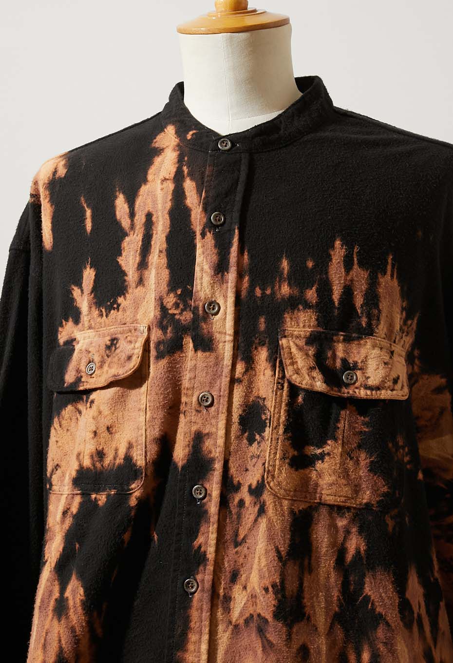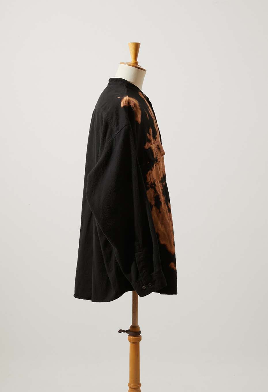 アメリカのSt Johns Bay社製カラーフランネルシャツを黒色に後染めし、上衿をカットしたスタンドカラー仕様にカスタム。フロント部分をざっくりと折りたたんで強くねじり、ブリーチ剤に漬け込むことで、不均一な絞り模様が全体に広がるインパクトある仕上がりに。加工はすべてTOLL FREEスタッフによる手作業です。