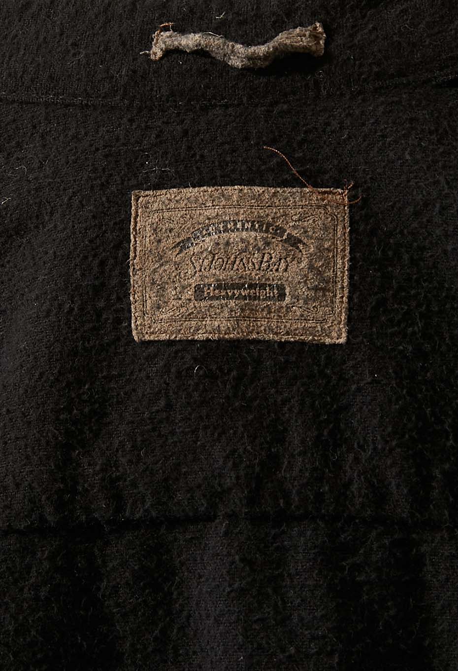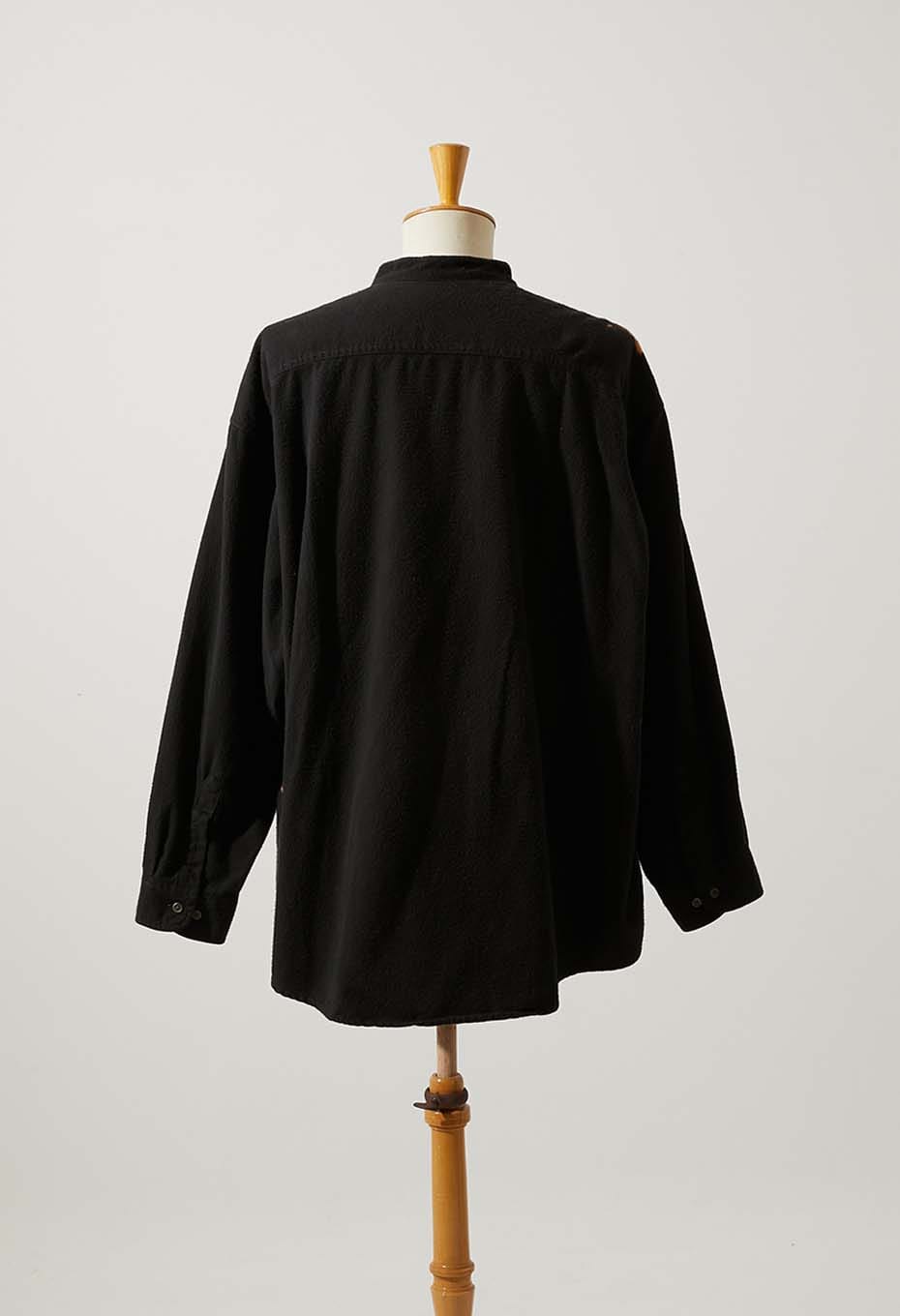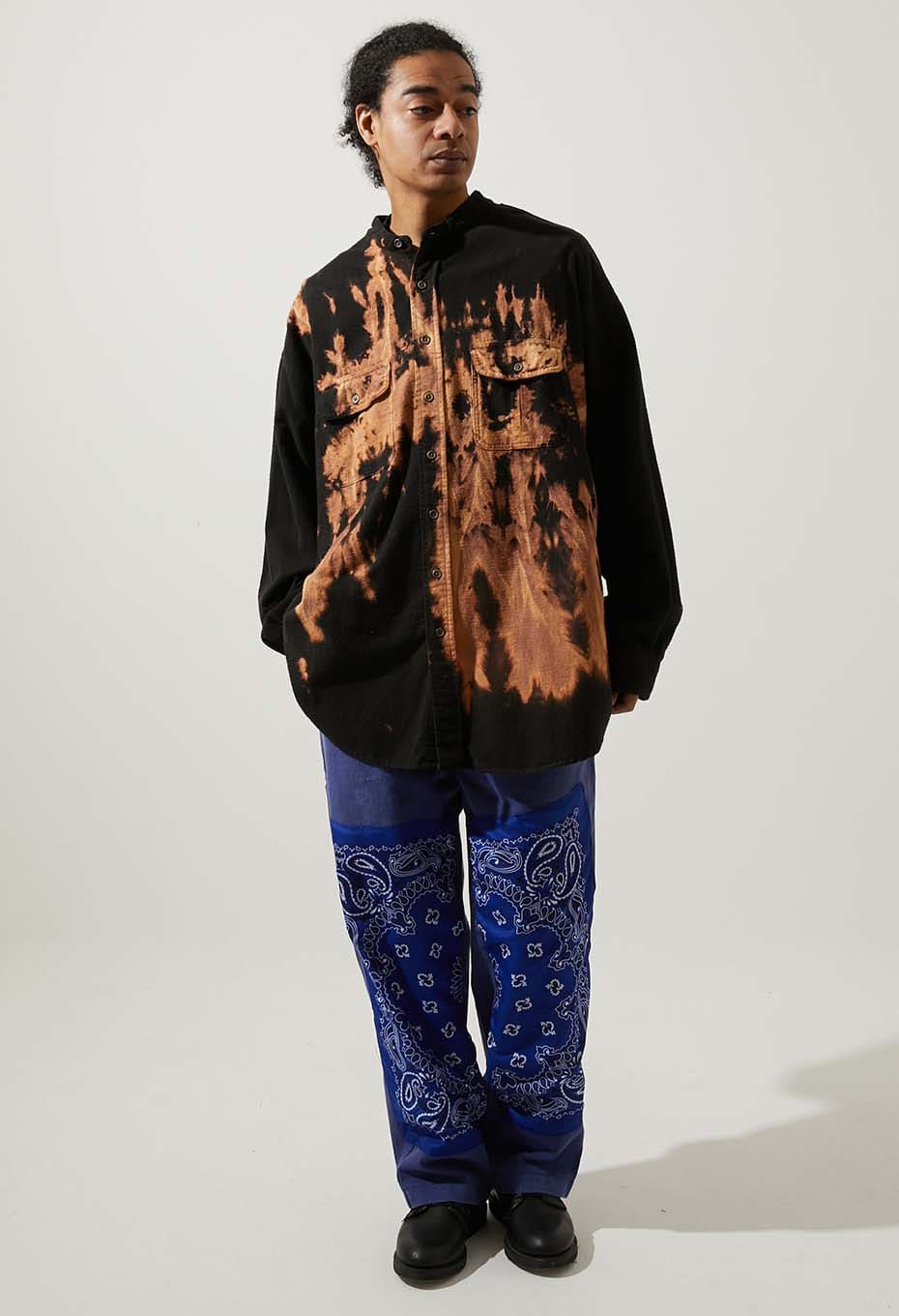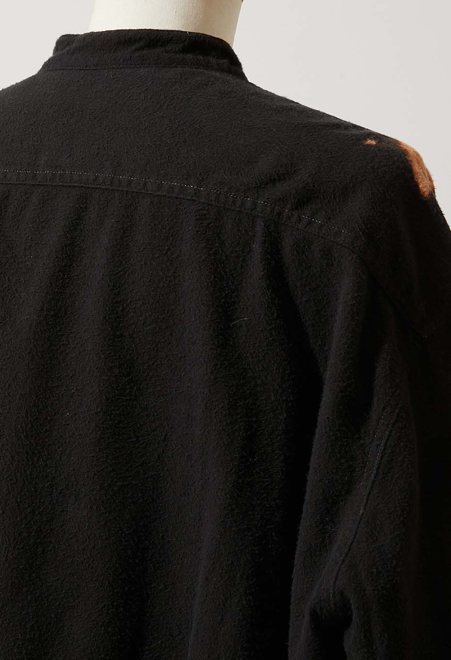 アメリカのSt Johns Bay社製カラーフランネルシャツを黒色に後染めし、上衿をカットしたスタンドカラー仕様にカスタム。フロント部分をざっくりと折りたたんで強くねじり、ブリーチ剤に漬け込むことで、不均一な絞り模様が全体に広がるインパクトある仕上がりに。加工はすべてTOLL FREEスタッフによる手作業です。