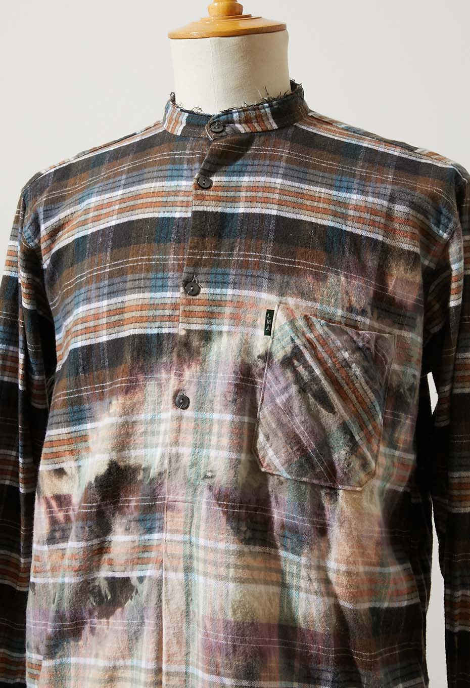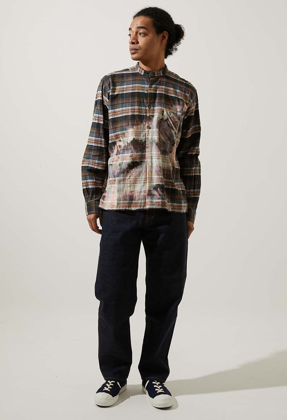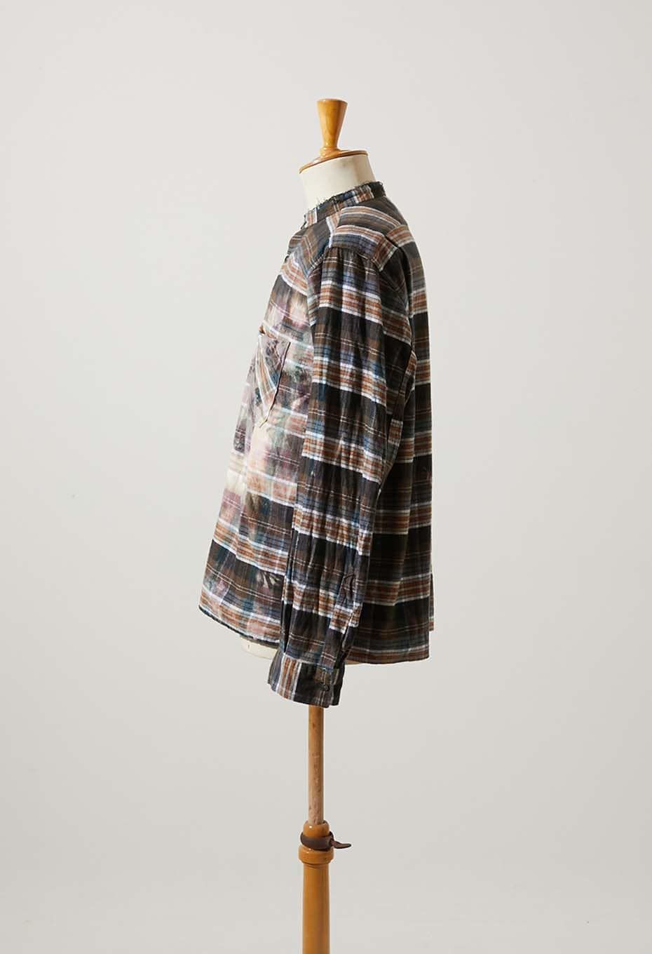中厚手のソフトフランネル素材を使用。襟はスタンドカラー仕様、裾はボックスシルエットのショート丈にカットしています。身頃下半分を斜めに折りたたんで絞りをかけ、ブリーチ剤に漬け込むことで、絞りとグラデーションのユニークな表情を実現しました。