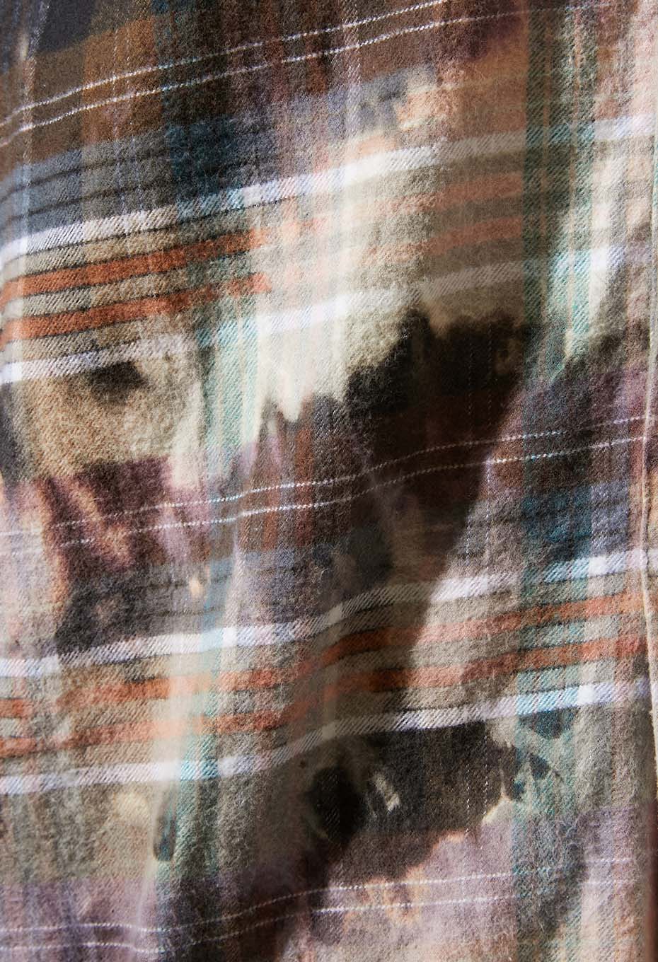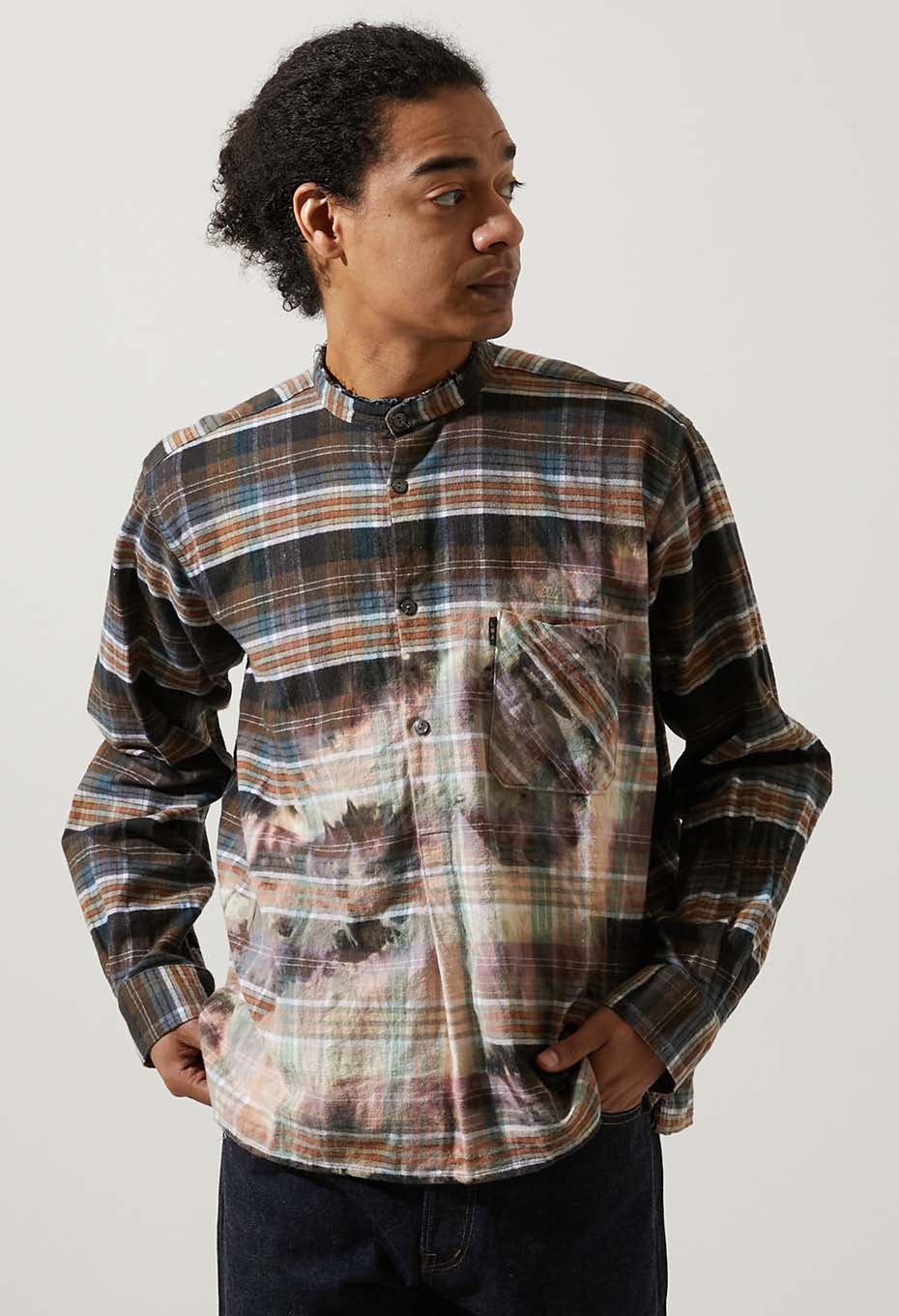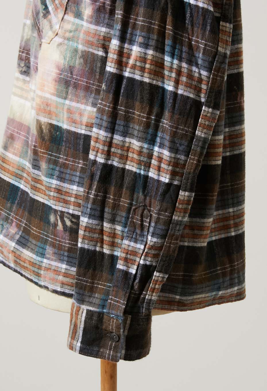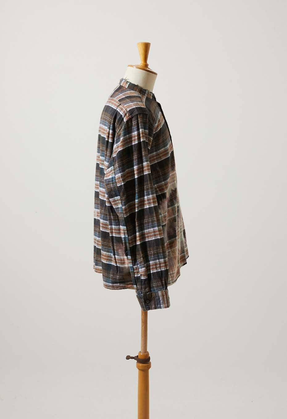 中厚手のソフトフランネル素材を使用。襟はスタンドカラー仕様、裾はボックスシルエットのショート丈にカットしています。身頃下半分を斜めに折りたたんで絞りをかけ、ブリーチ剤に漬け込むことで、絞りとグラデーションのユニークな表情を実現しました。