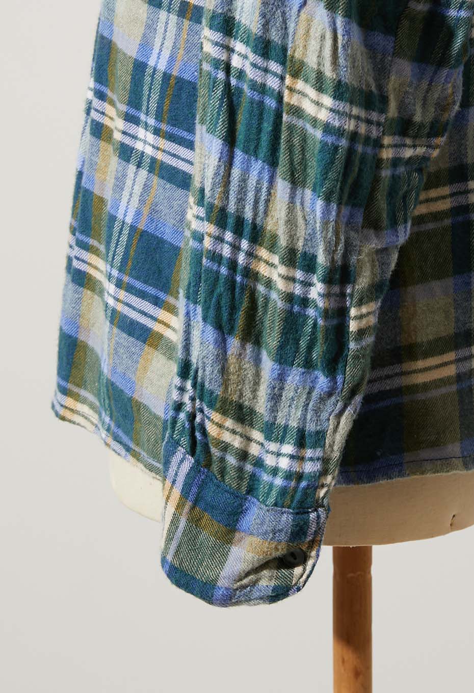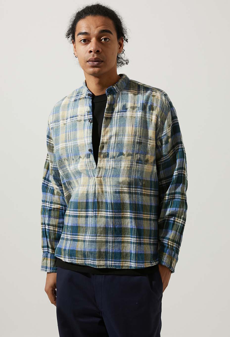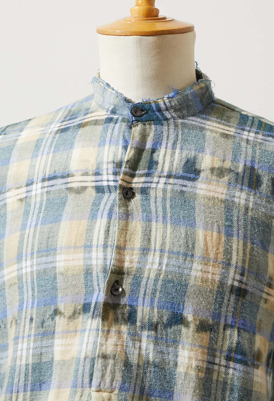 中厚手のソフトフランネル素材を使用。襟はスタンドカラー仕様、裾はボックスシルエットのショート丈にカットしています。身頃上半分を縦方向に折りたたんで絞りをかけ、ブリーチ剤に漬け込むことで、絞りとグラデーションのユニークな表情を実現しました。