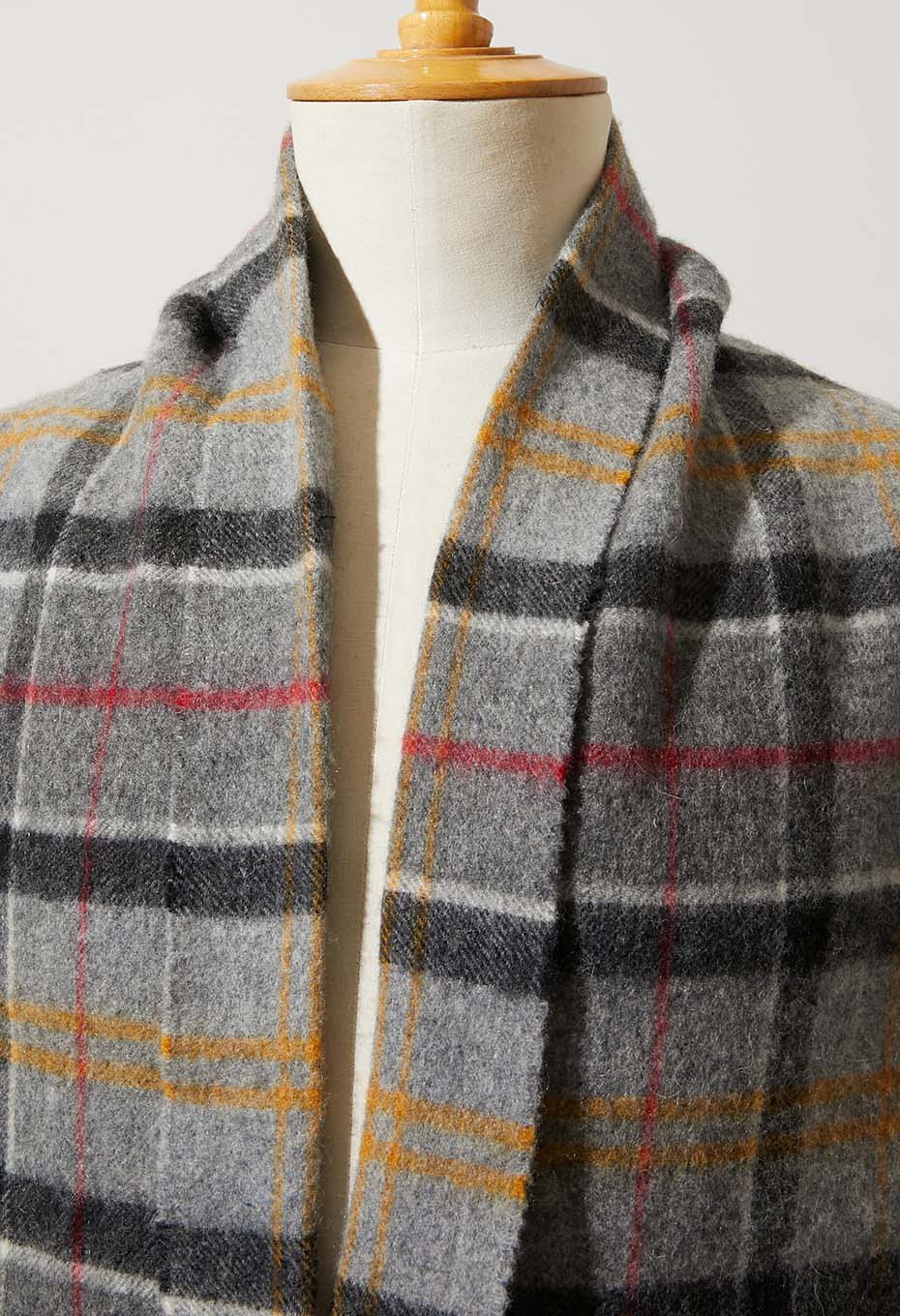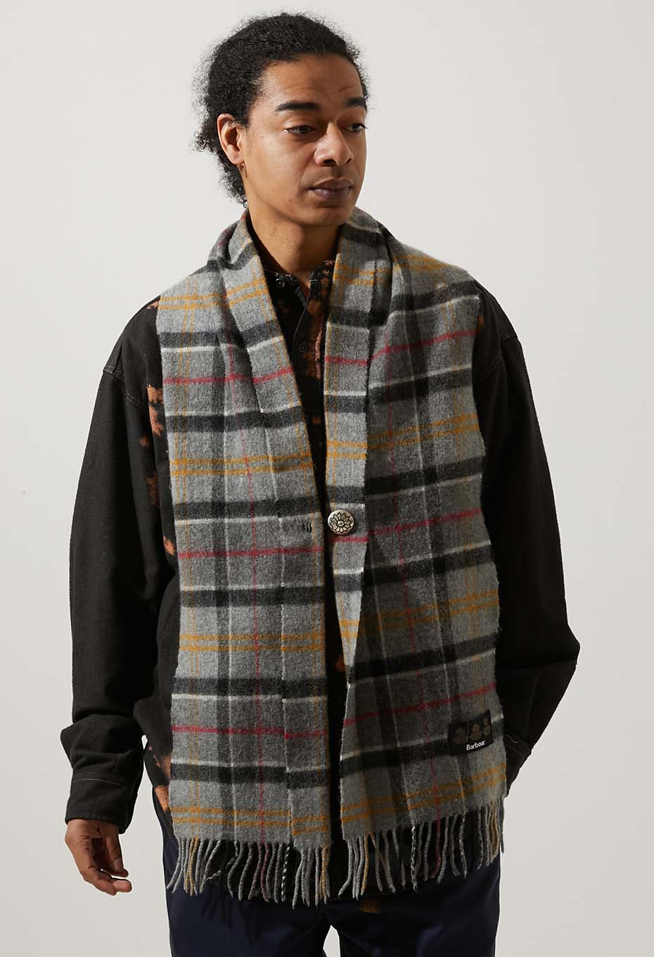 元々の細長いフリンジ部分の端を折り返し、コンチョボタンとレザーのループを取り付けることで、ショールやベストのような雰囲気での着用が可能な仕様にカスタム。ベースにはスコットランド製ウールを使用したイギリス規格のヴィンテージBARBOURを採用しています。コンチョで留めずに細幅にすると通常のマフラーとしても着用でき、ジャケットのインナーとして差すスタイルもおすすめです。