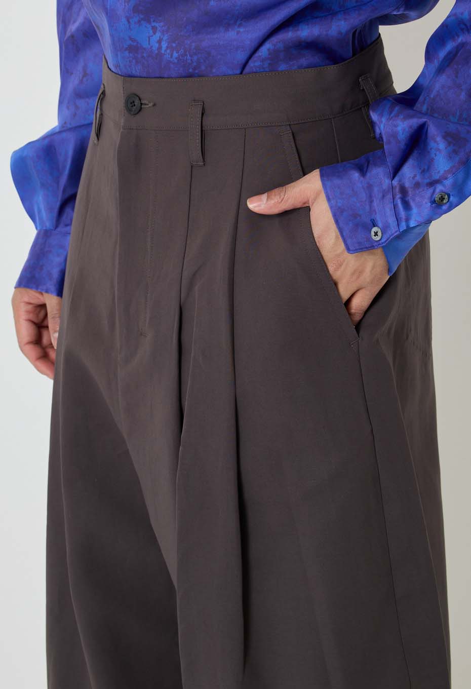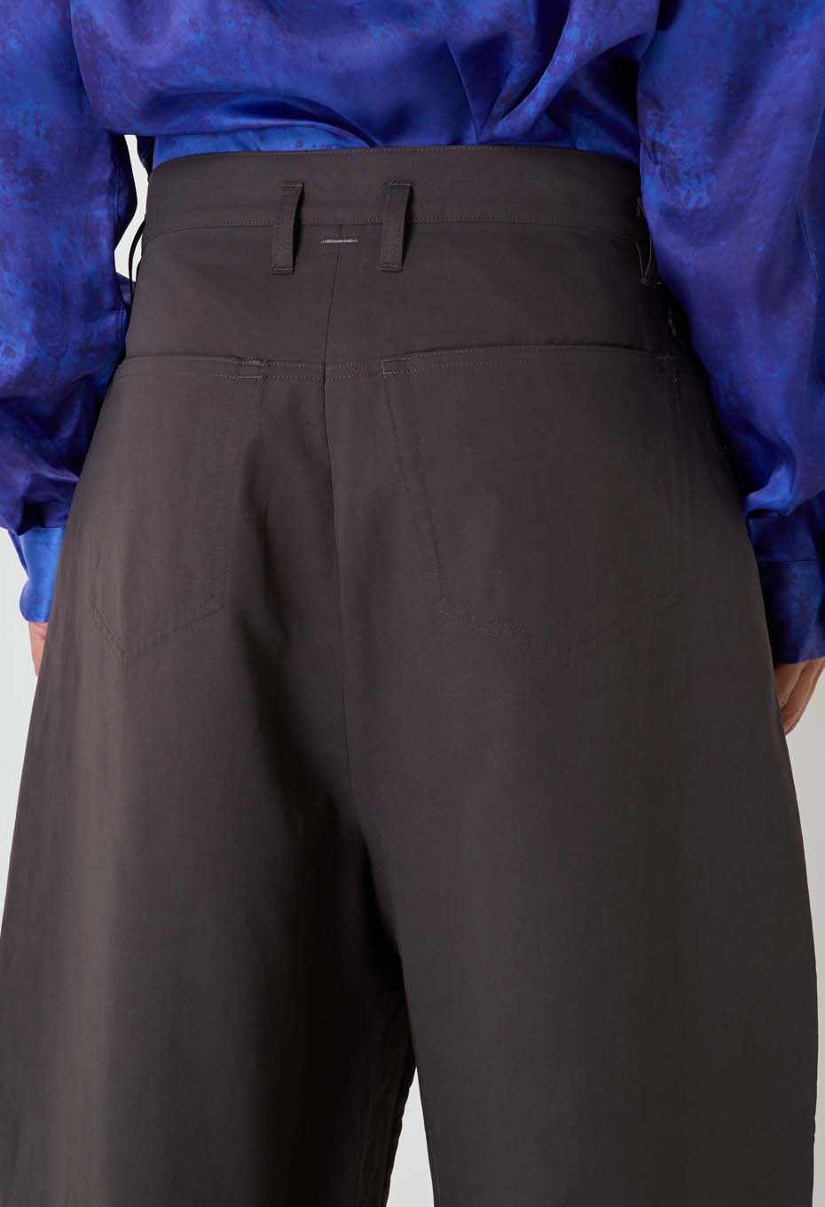バギートラウザーズ同様、切り替えを入れることで丸みを付けた独特なシルエットとなっています。丈は長めに設定することで、ボリュームを出すことができます。