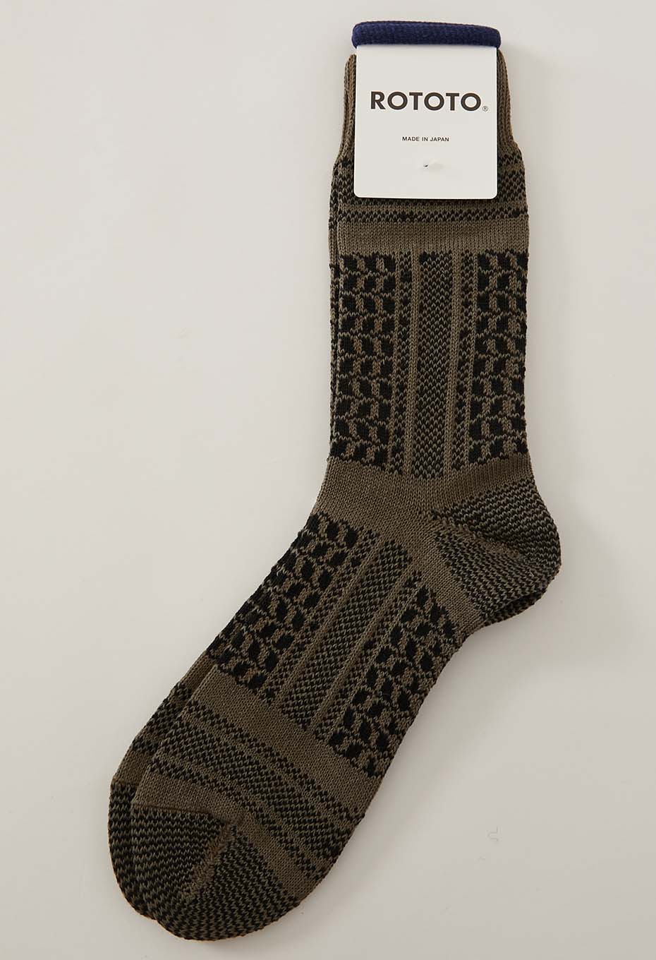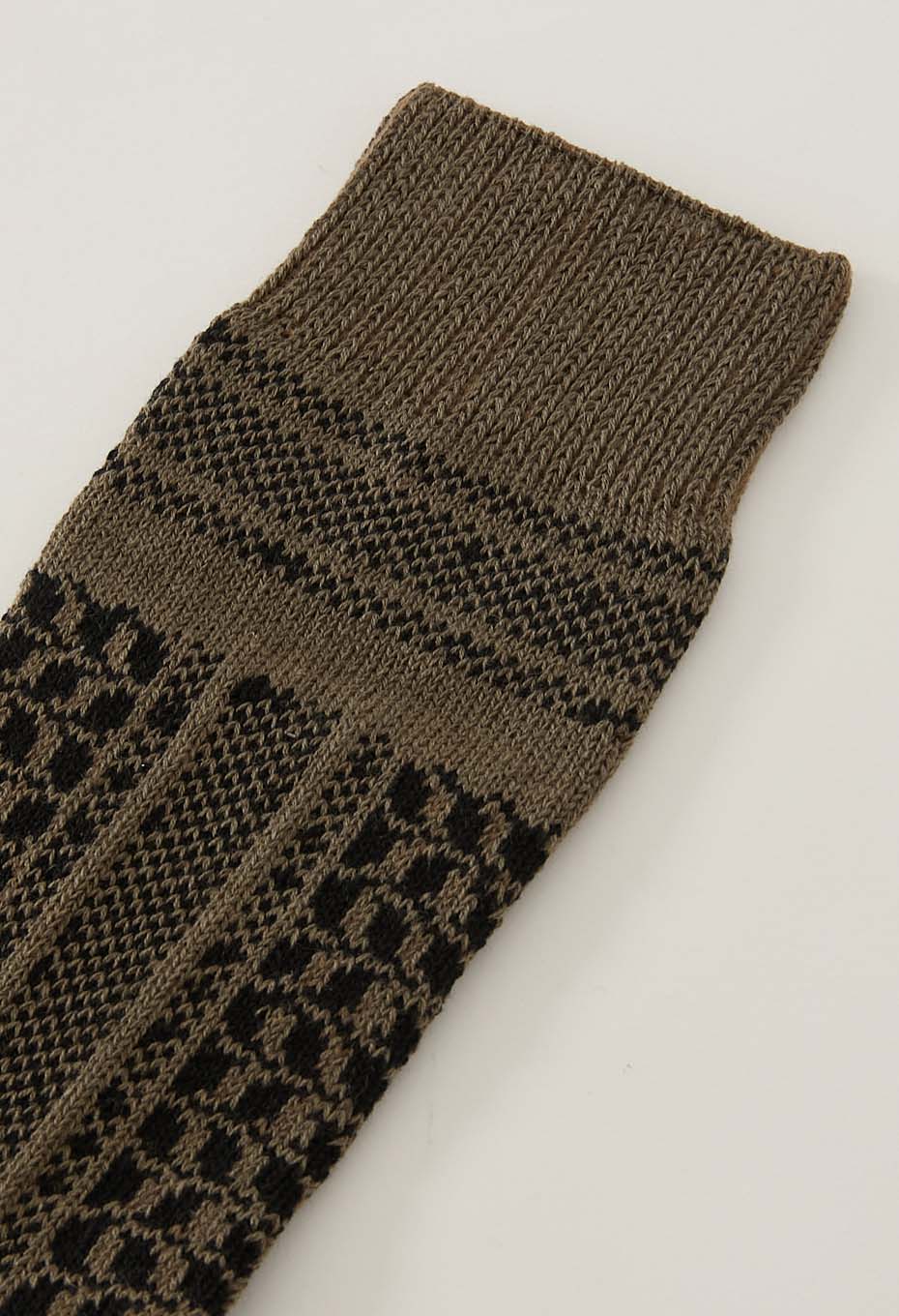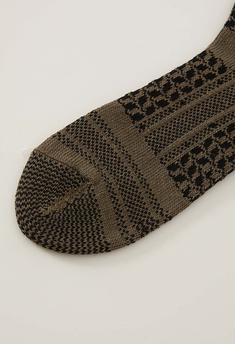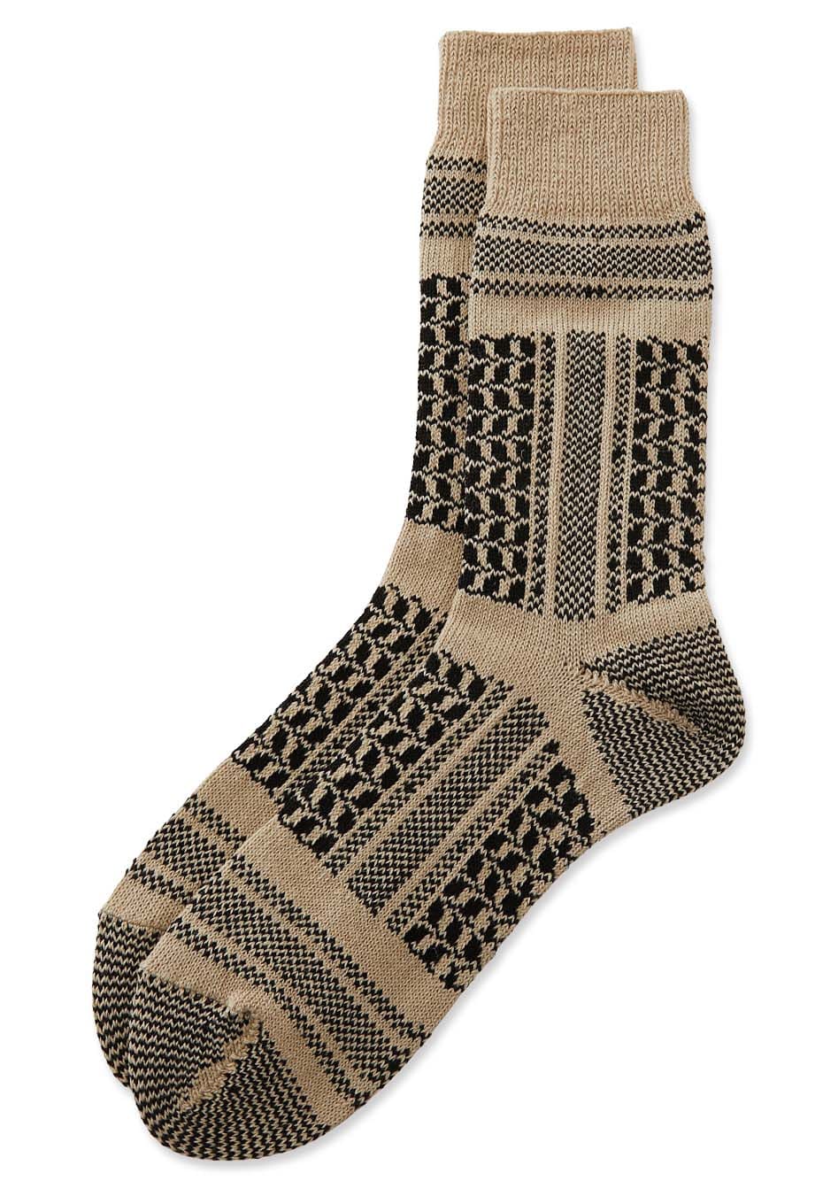 コットン、リネン、ラミー素材をバランスよくブレンドした糸を使用しています。さらりとした快適な履き心地で、自然なムラ感を持つ糸が織りなす素朴で立体的な風合いが異国の手織り布のような独特の存在感と、どこか懐かしさを感じさせるパターンとなっています。