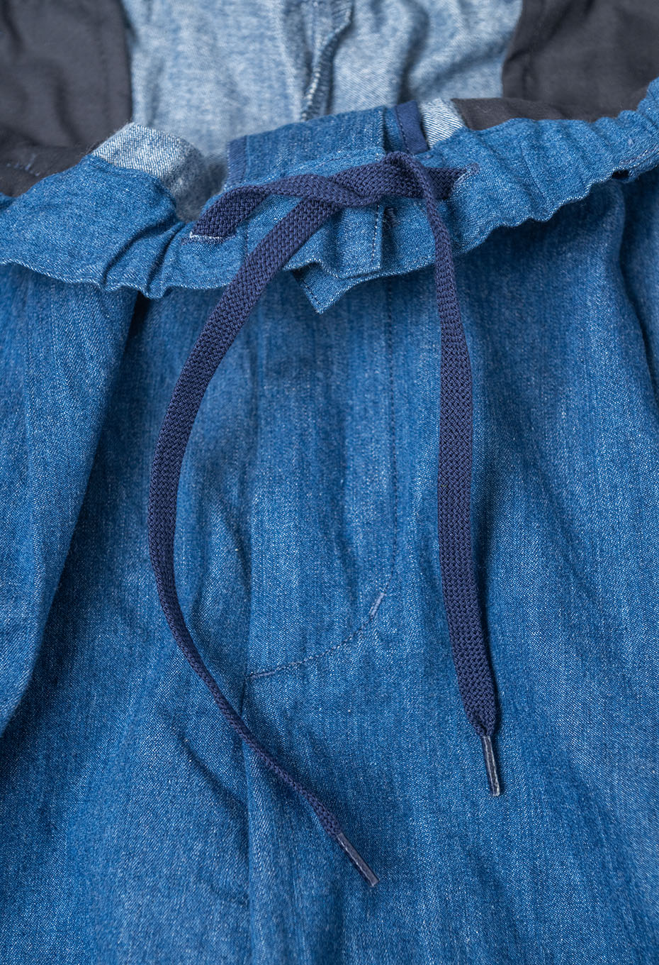 ・この製品は、インディゴ染料で染めた素材を使用しておりますので、繰り返し着たり、何度も洗濯することにより、濃いブルーから淡いブルーに移り変わっていきます。白又は淡色のものと組み合わせて着たり、重ね着をすると色が移りますので避けてください。洗濯の際は色が落ちますので単独洗いでお願いします。また、保管の際は光が当たらないように気を付けてください。また、折りたたんだ状態で放置すると、折り目が退色することがあります。
