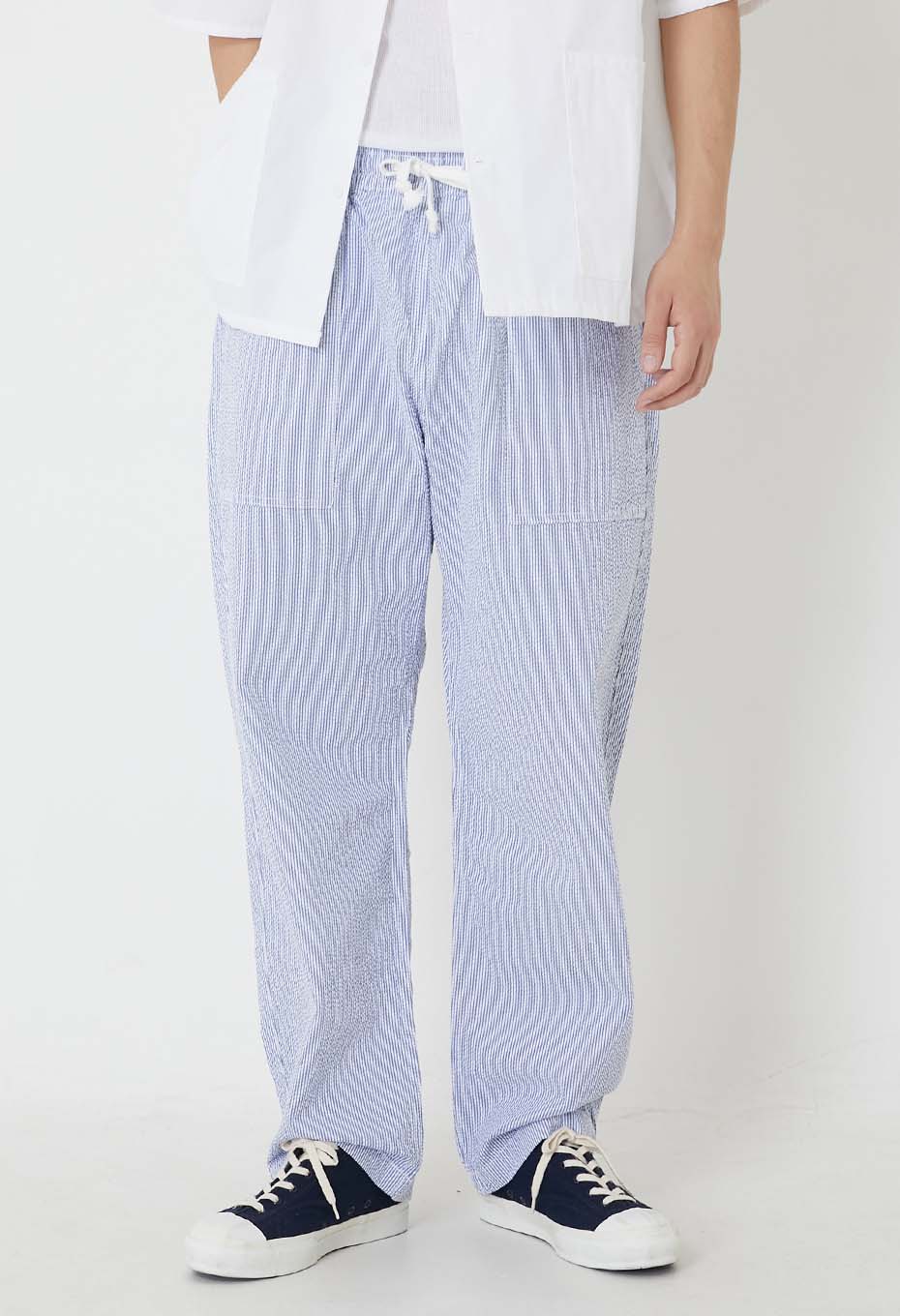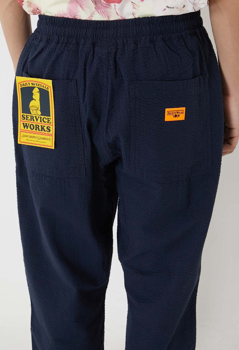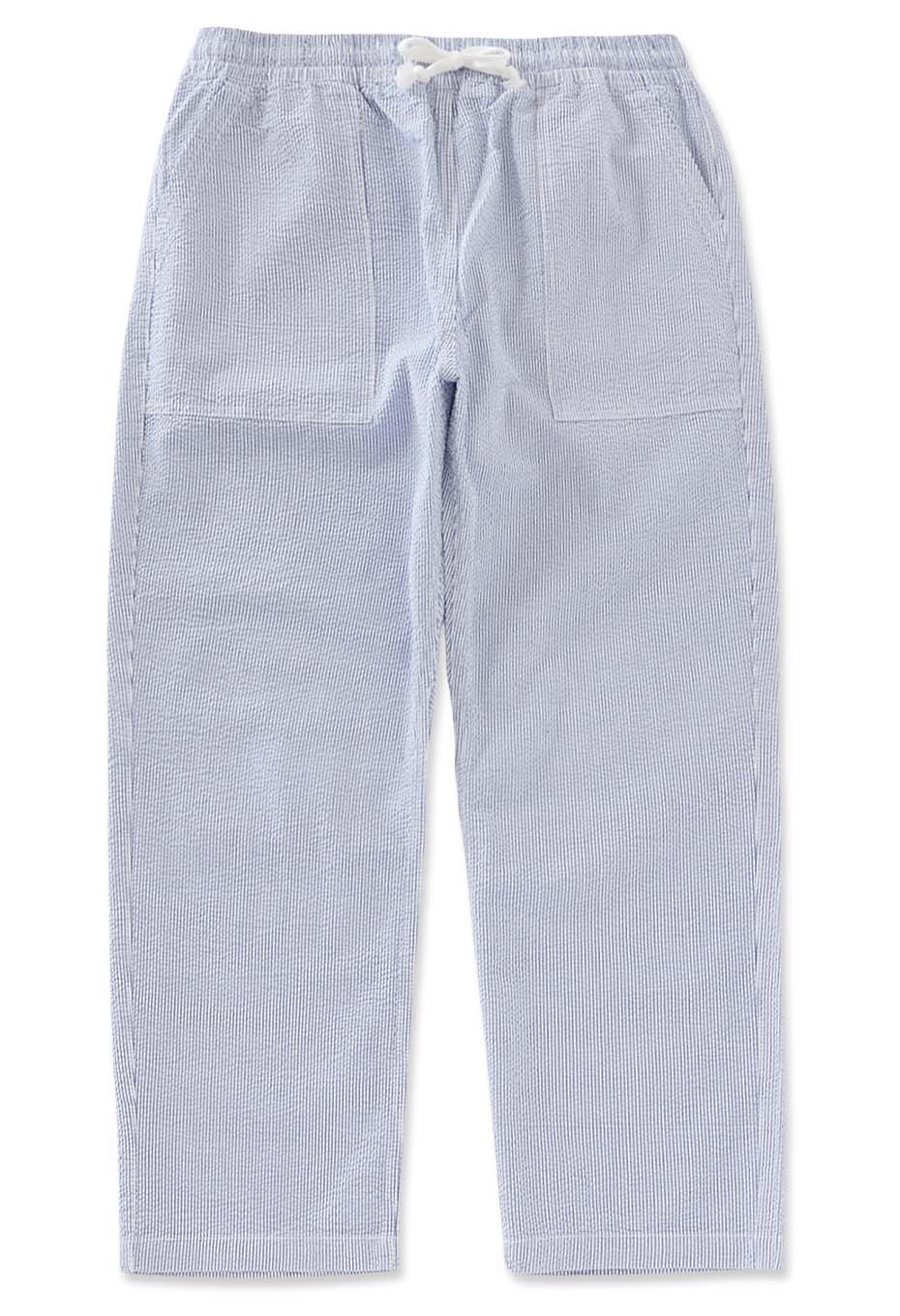 - GOTSオーガニック認証のシアサッカーコットンシェフパンツです。シルエットはゆったりとしたストレートで、ウエストバンドにはドローストリング付きによりウエスト調節が出来ます。ファティーグパンツのようなフロントポケットにバックポケットにService Worksオリジナルの織りネームを配しています。