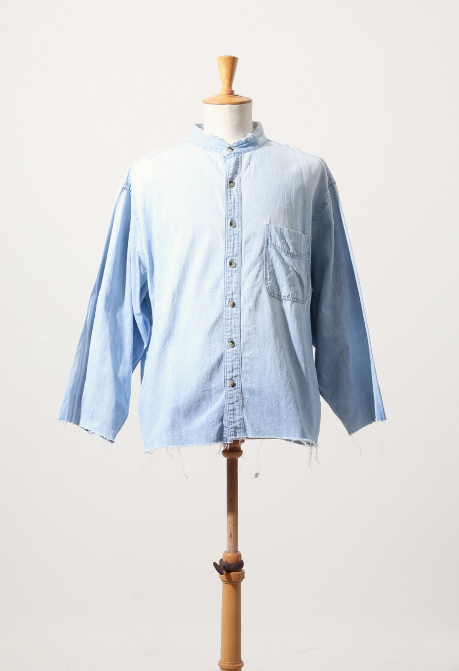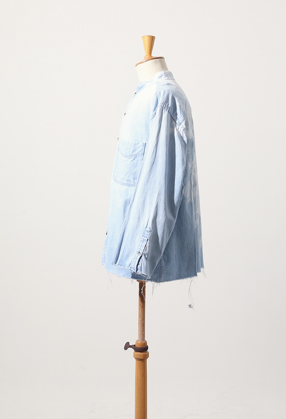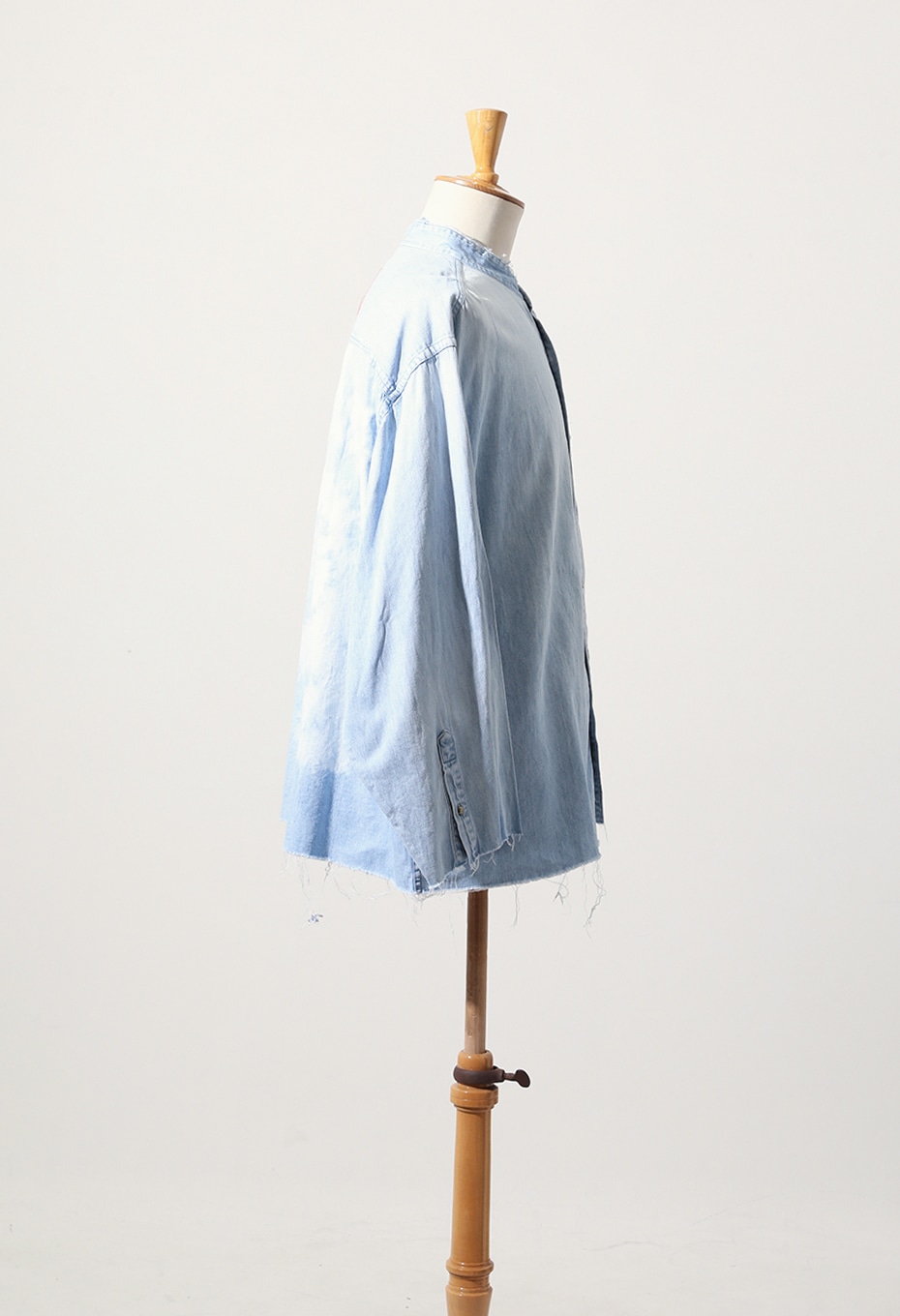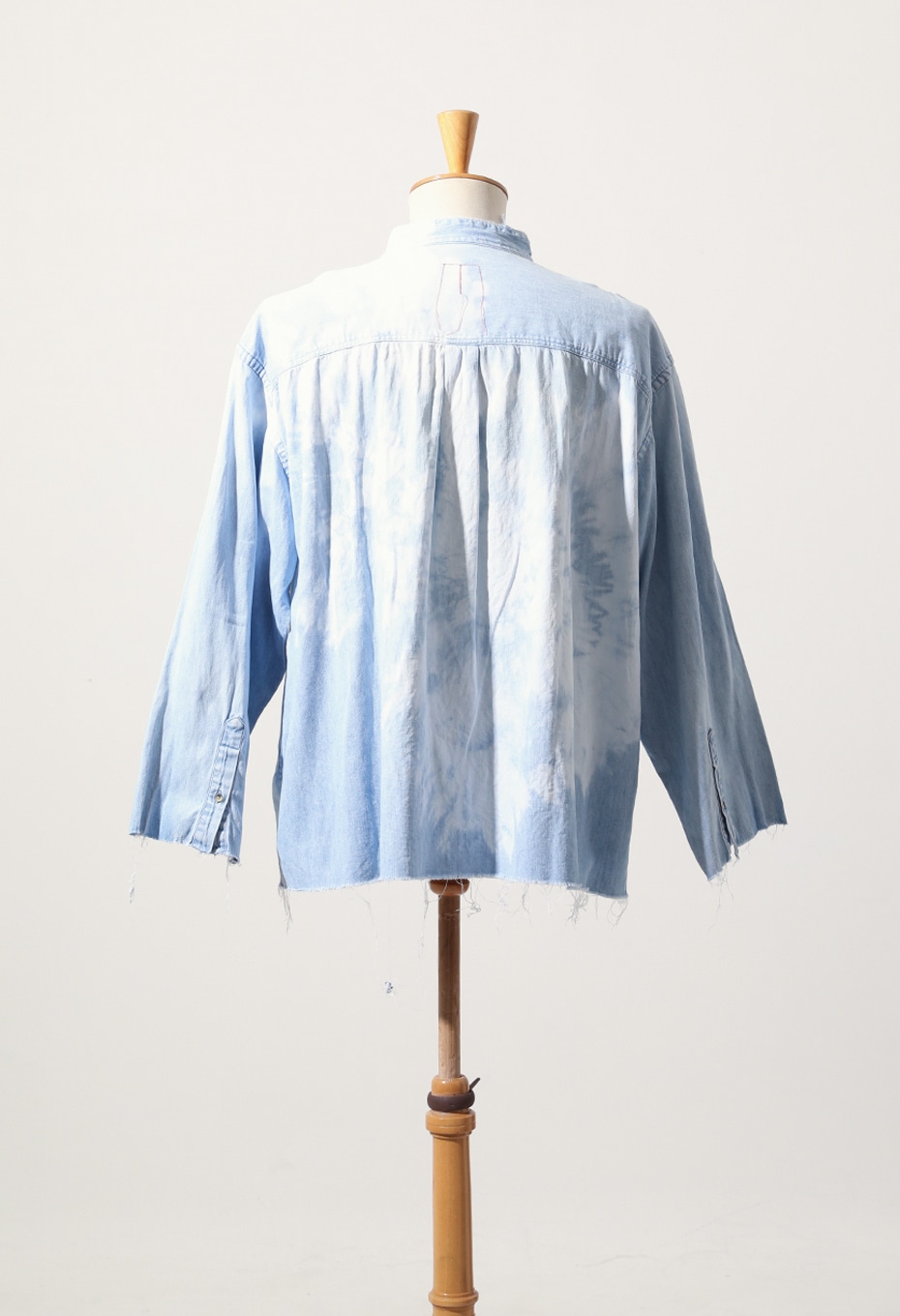 TOLL FREEらしく、店舗スタッフが手作業でブリーチ加工を施した1点ものです。背面をメインにブリーチ加工を施し、大きく渦を巻いたような絞り柄が特徴的なアイテムで、襟、カフス、裾をあえてカットオフにして、ブリーチと相まったダメージ感を演出しています。上襟をカットオフしたことで首元もすっきりとし、ライトジャケット感覚でもお召しいただけます。
