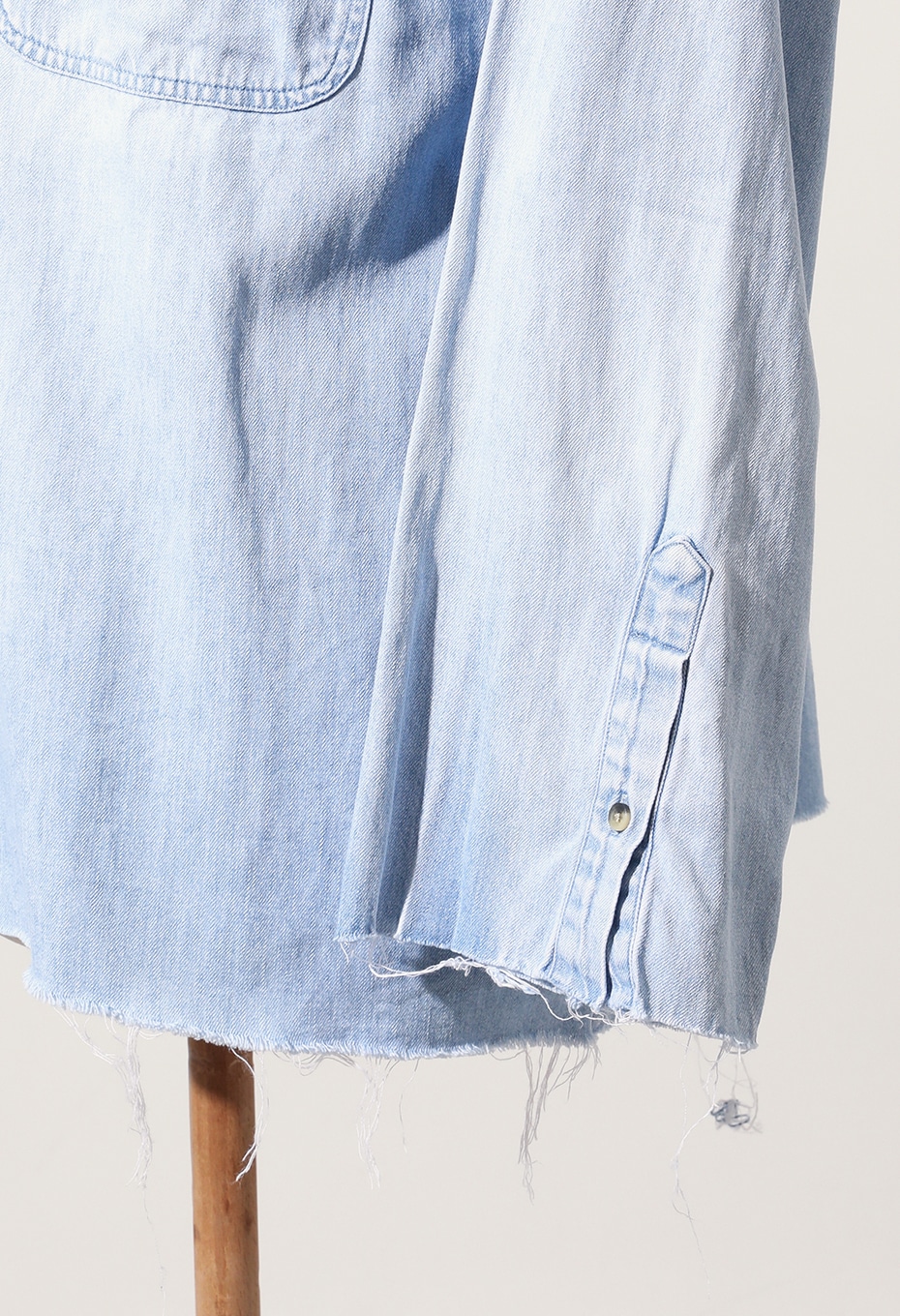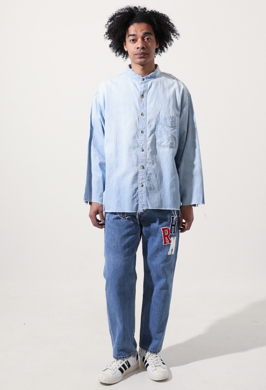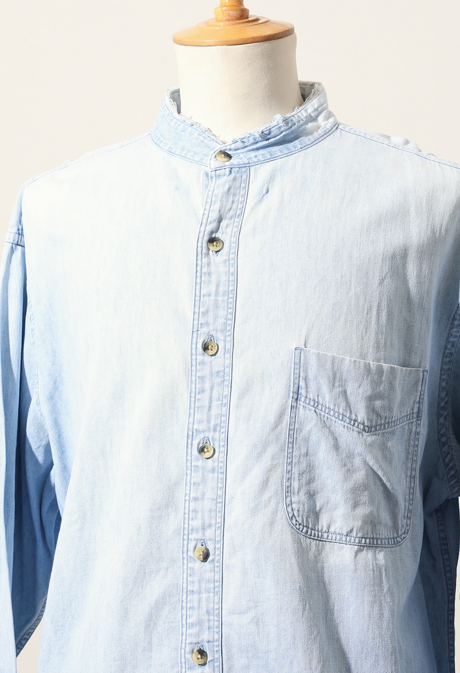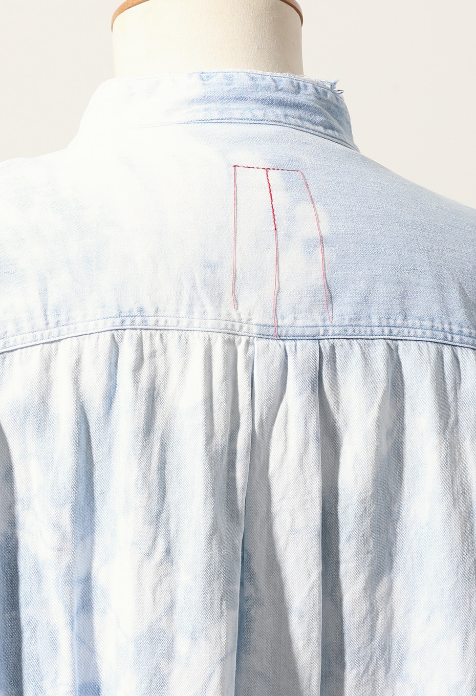 TOLL FREEらしく、店舗スタッフが手作業でブリーチ加工を施した1点ものです。背面をメインにブリーチ加工を施し、大きく渦を巻いたような絞り柄が特徴的なアイテムで、襟、カフス、裾をあえてカットオフにして、ブリーチと相まったダメージ感を演出しています。上襟をカットオフしたことで首元もすっきりとし、ライトジャケット感覚でもお召しいただけます。
