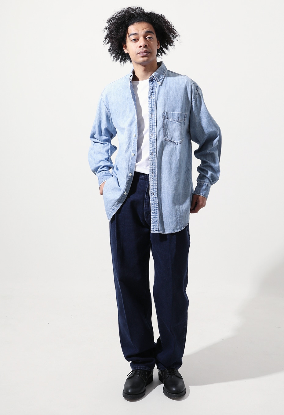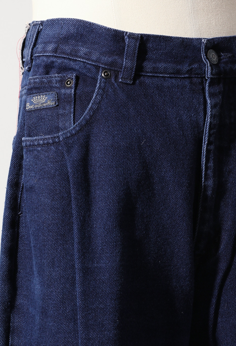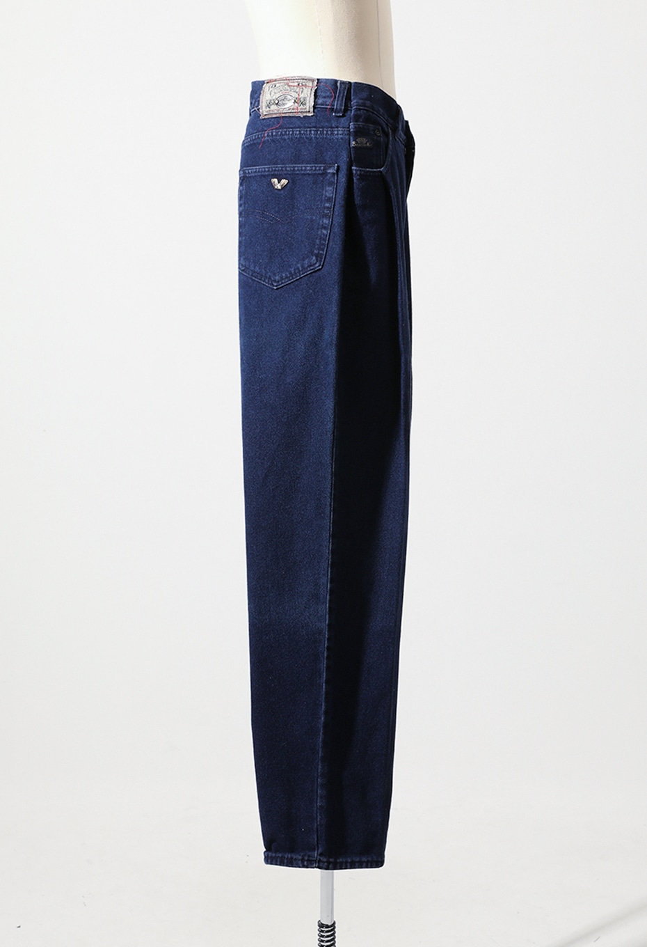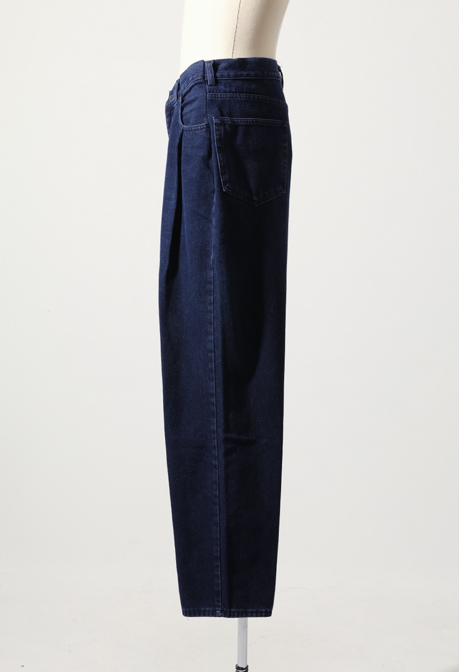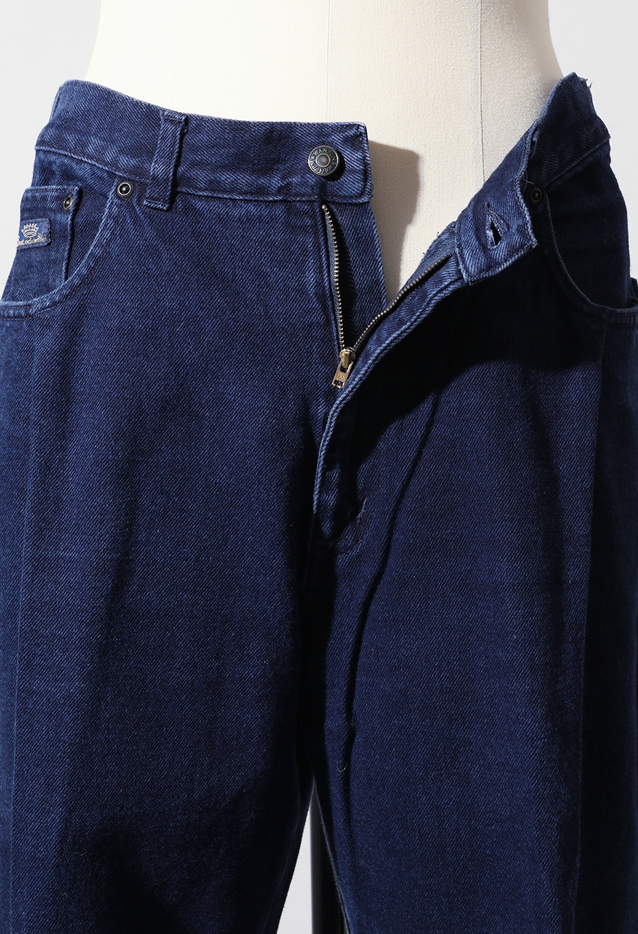 ベースはウエストサイズの大きなテーパードシルエットでしたが、サイド部分を折り畳んでウエストサイズを調整したうえで、腰回りの丸みを強調したシルエットに仕上げました。また、ポケット口も折り畳み、そのまま裾に向かってプレスをかけてスラックスのようにクリースを入れることで、デニムパンツながらスラックスのような端正な見え方になっています。濃紺のデニムで、きれいめのスタイリングにもお使いいただける特別な1本に仕上がりました。