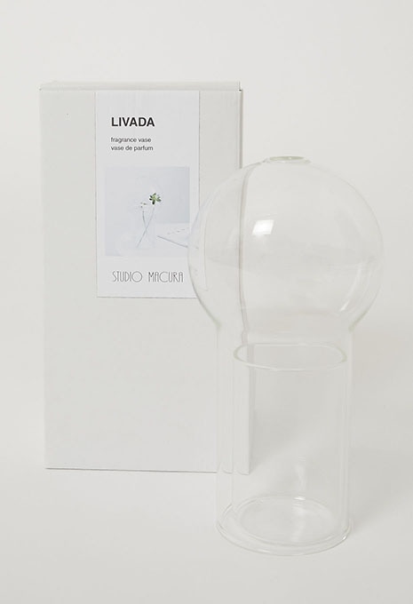 - STUDIO MACURA(スタジオ・マクラ)は、オランダを拠点とするホームアクセサリーとユニークなギフトのグローバルなデザイナーブランドです。LIVADAは、花やハーブの小さな花束のためのガラスの花瓶で、2つのガラス片、小さな円筒形のガラス容器と、花束を囲む小さなガラスの上を覆うガラスの鐘のようなカバーで構成されています。ガラスの鐘の上部には15mmの穴が開けられており、濃縮された香りがゆっくりと出てきます。日常に自然を感じられるスペースを提供してくれます。
