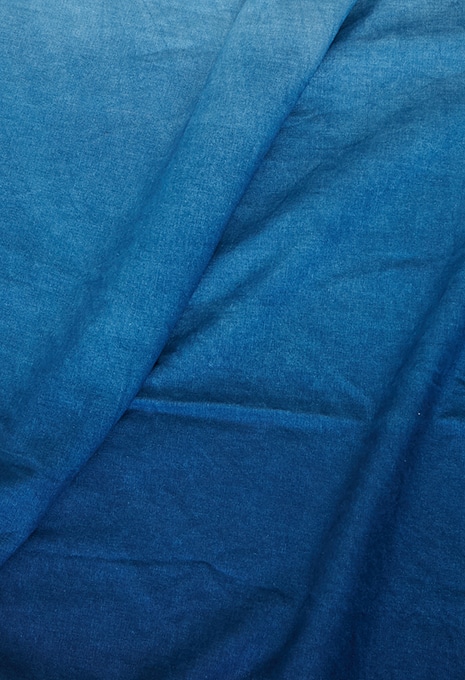 - 「本藍」でグラデーションに染め上げた美しい色合いが魅力の更紗(さらさ)。一枚一枚、ていねいな手作業で仕上げており、一点物としても楽しんでいただけます。また、「本藍」は使い込むことで冴えた色合いが現れ、さらに味わい深さが増していきます。