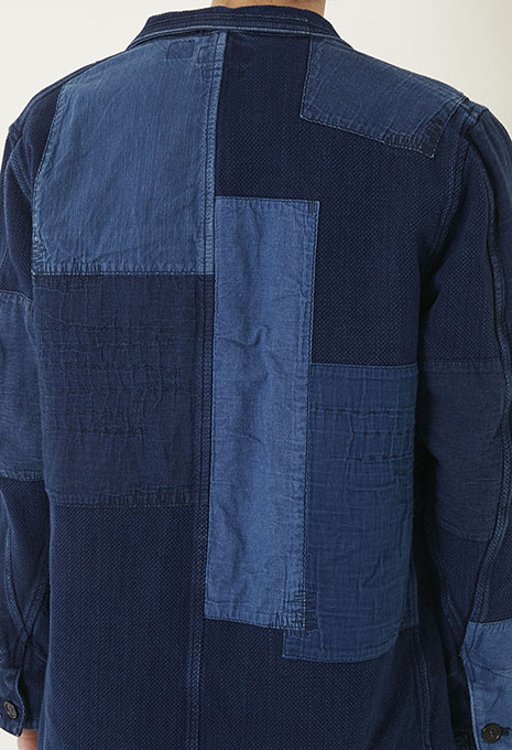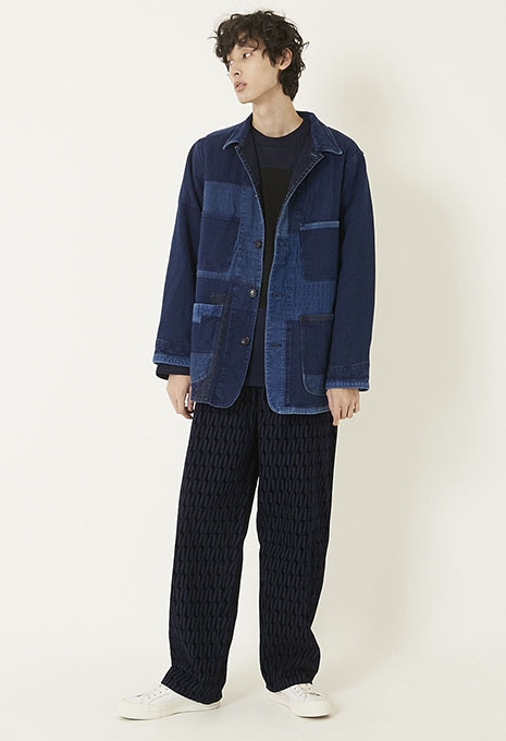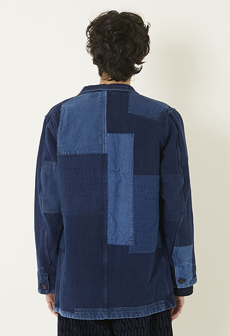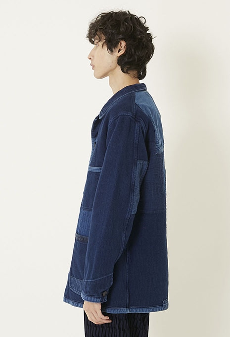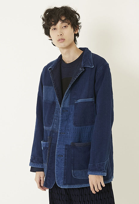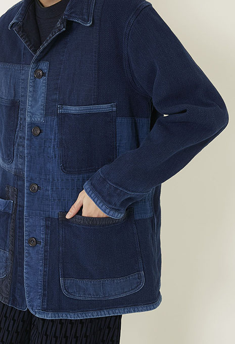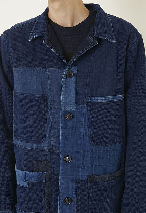 - 本藍かせ染めの糸で織り上げた刺子生地を使用しています。様々なインディゴの生地をあて手刺しを施し、長い間大切に着込んだような風合いを表現しています。生地によって変化の仕方も違い、様々なインディゴの青を楽しめるところも醍醐味です。大きなポケットや低めに位置した胸ポケットなど、ワークスタイルのディテールを取り入れています。ゆったりとしたサイズ感のカバーオールは中にたくさん着込んでコートのように着ていただくのもおすすめです。