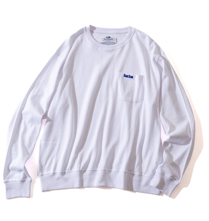 FRUIT OF THE LOOMが誇る着心地の良さと、BLUE BLUEのシンプルで洗練されたデザインが融合した別注のロングスリーブニットソーです。胸元にはBLUE BLUEのロゴ刺しゅうを施しています。柔らかで肌触りの良い生地は、カジュアルながらもどこか上品な雰囲気を演出します。ベーシックなデザインだからこそ、シルエットやディテールにこだわっています。