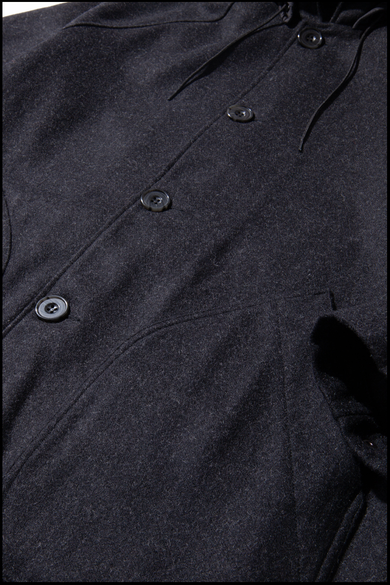 高密度で肉厚のウール地を使用した、ミディアムレングスのコートでゆったりとした作りのコート。