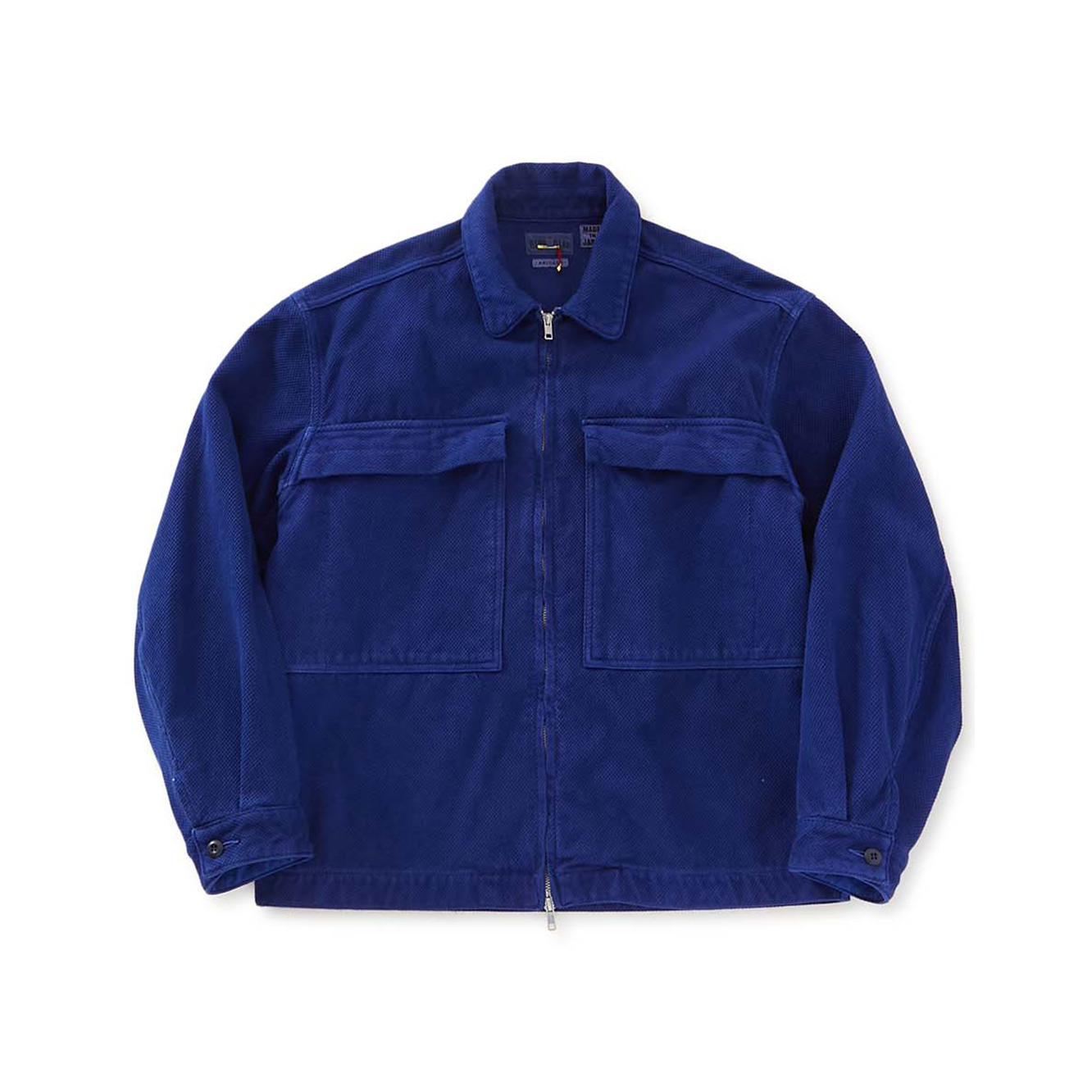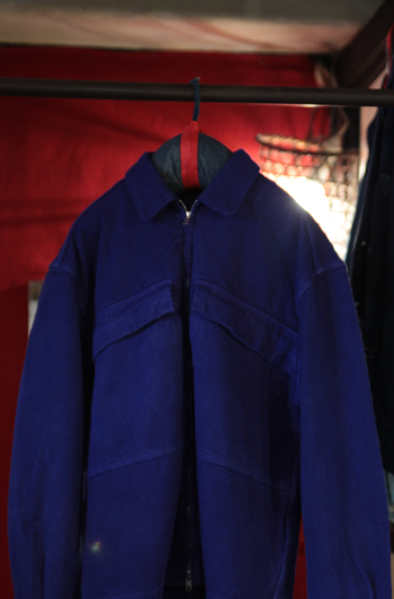 ド生成りの生地を製品に仕立てた後、職人の手で一点ずつユーロワークブルーのインディゴに染め上げています。