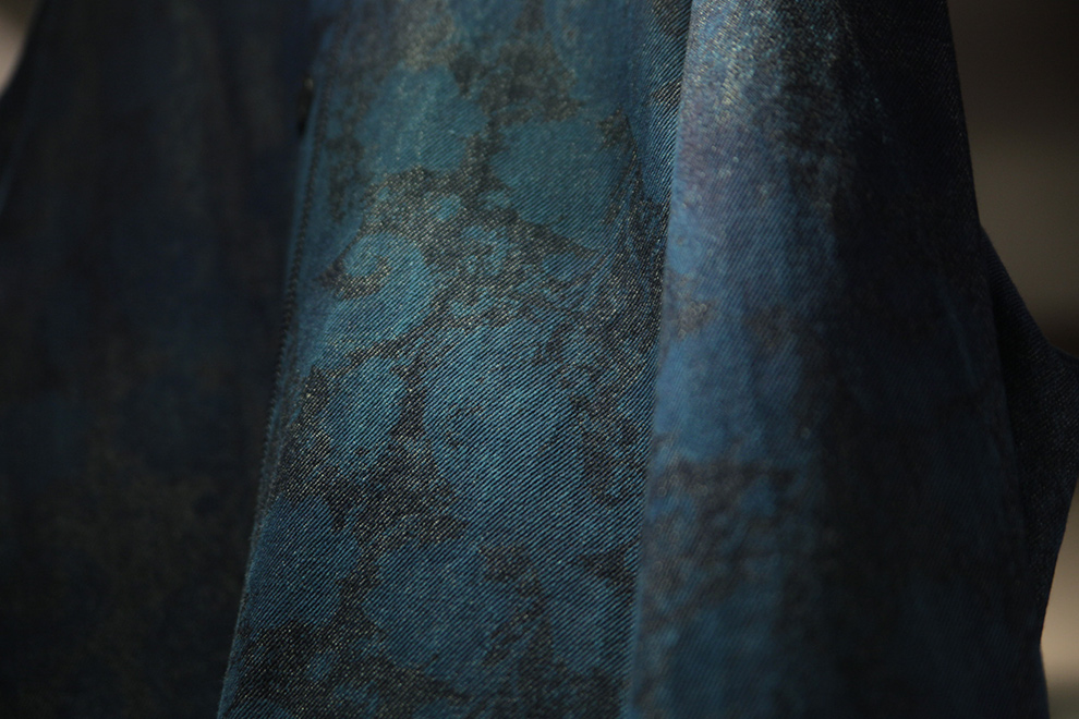 ドビー組織を使い、深い紺色にゴールドカラーが散りばめられたような奥行きのある表情を演出しています。