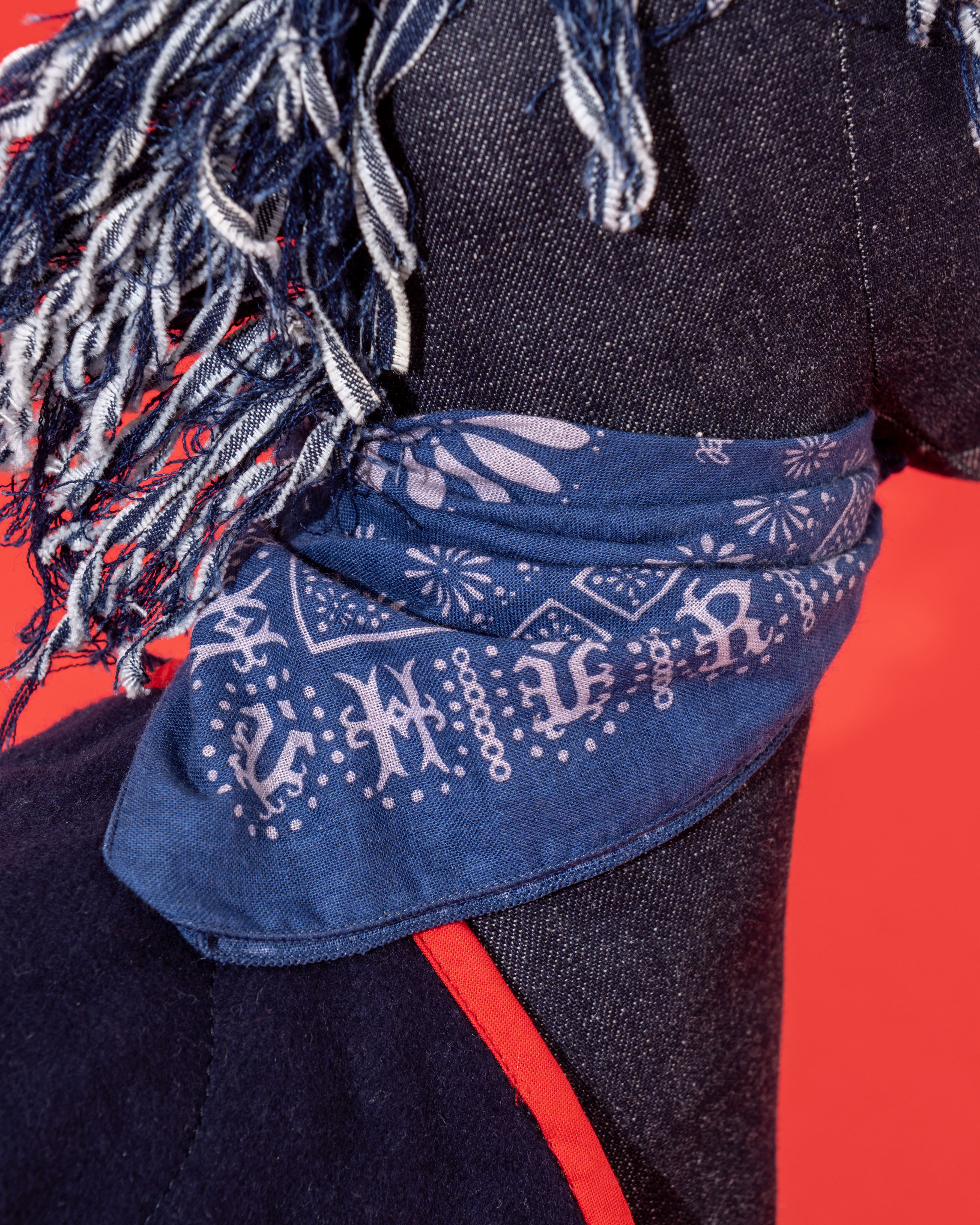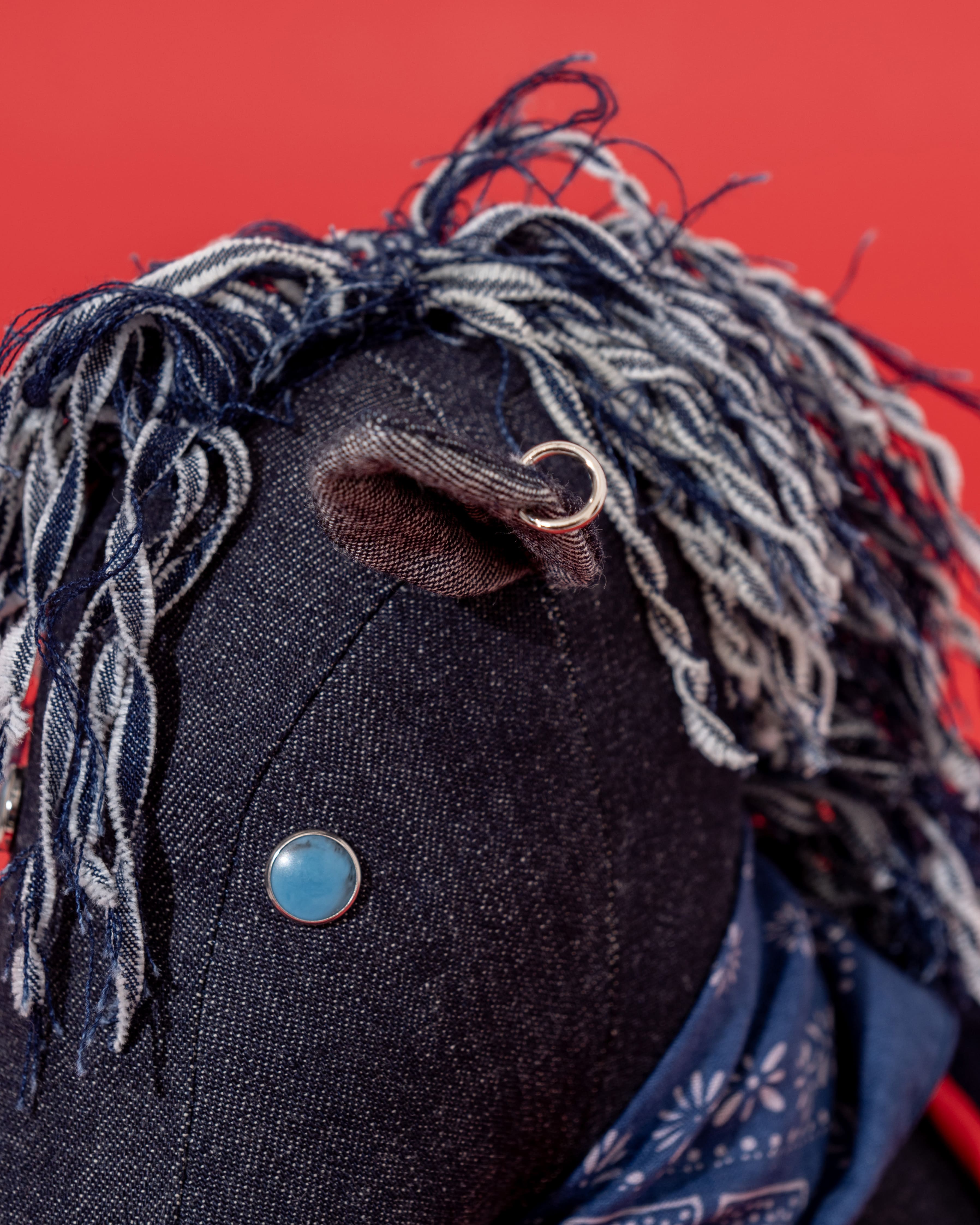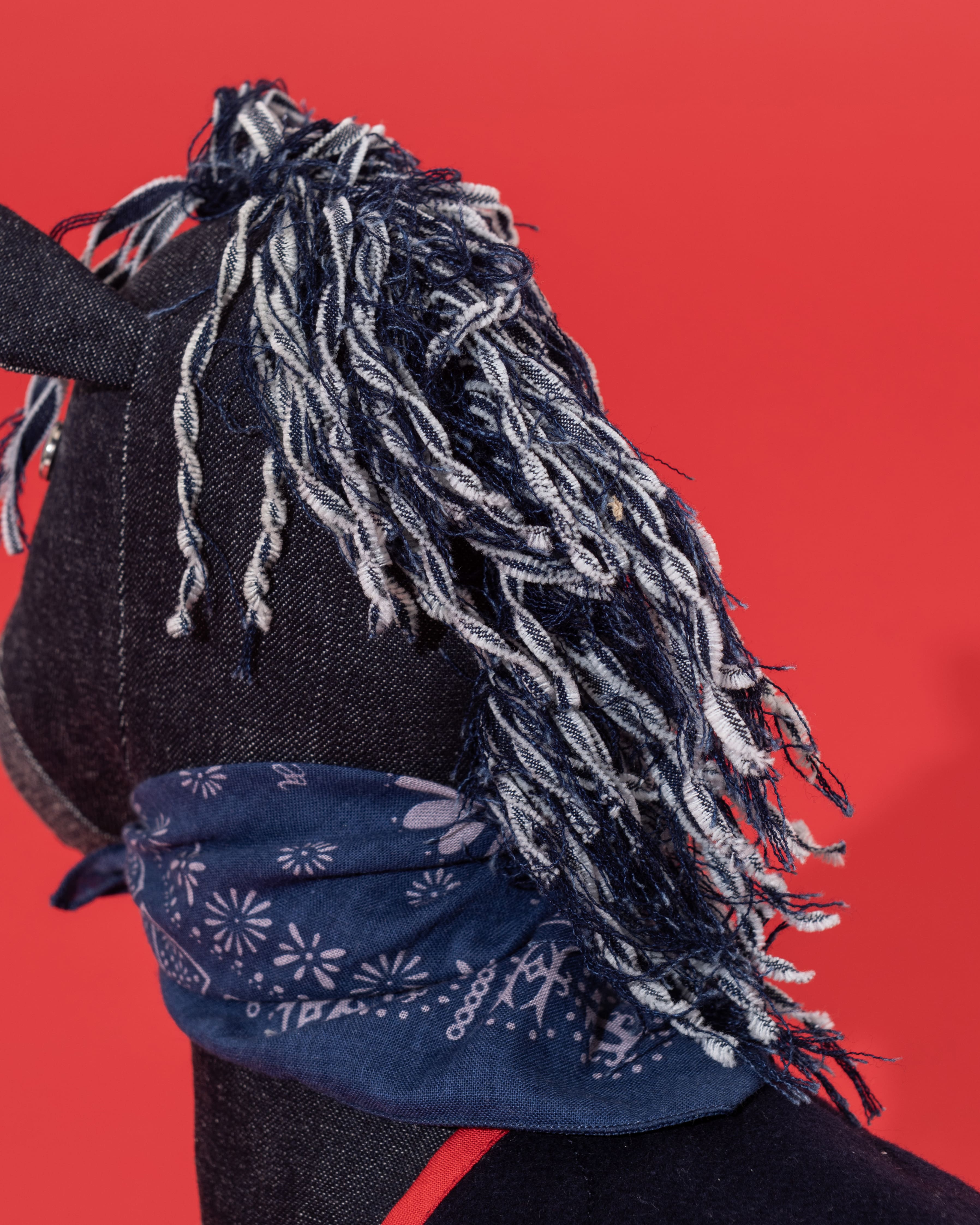 1点1点異なるデニムの切れ端をパッチワークし、たてがみと尻尾もデニムの残生地を裂いて表現しています。