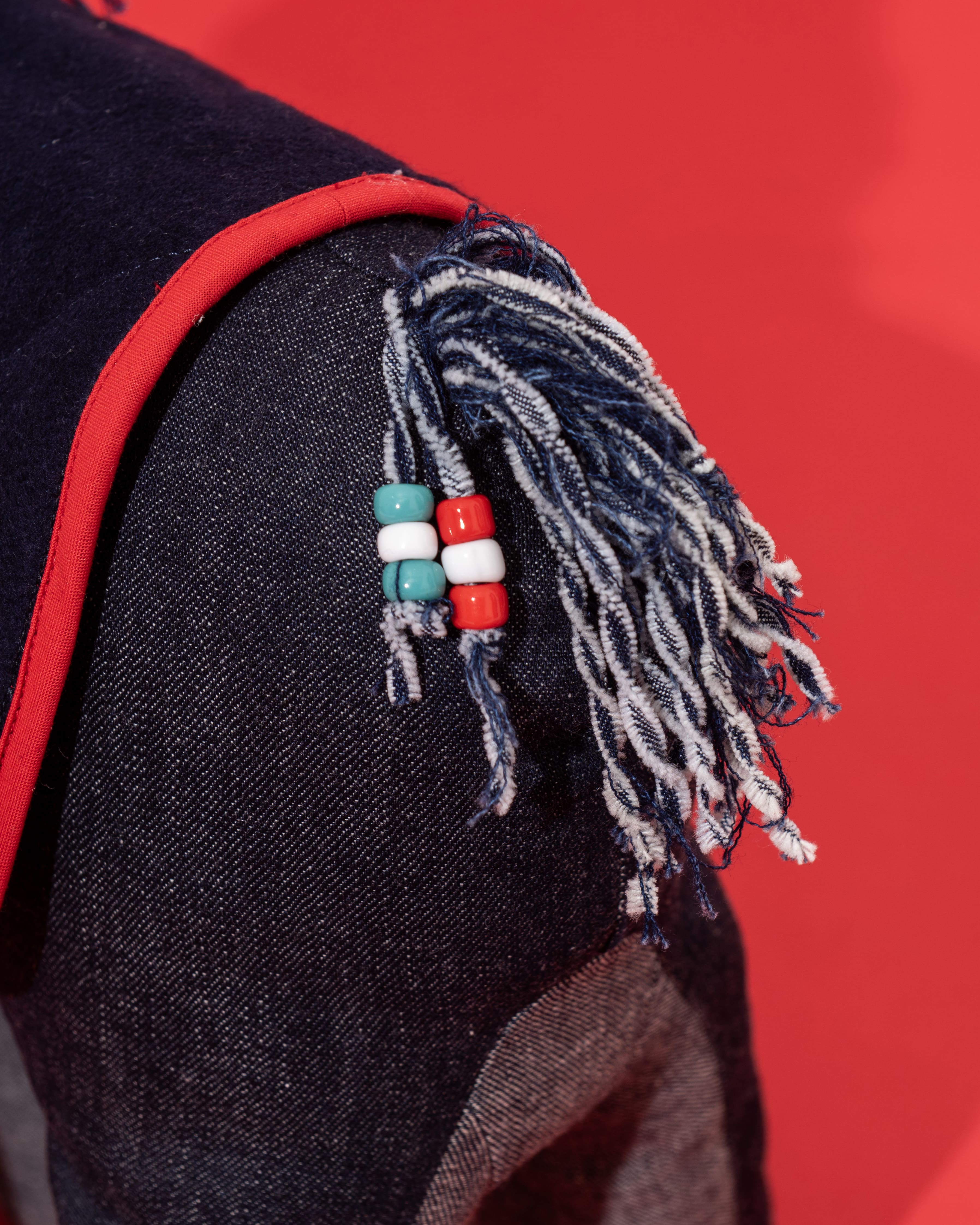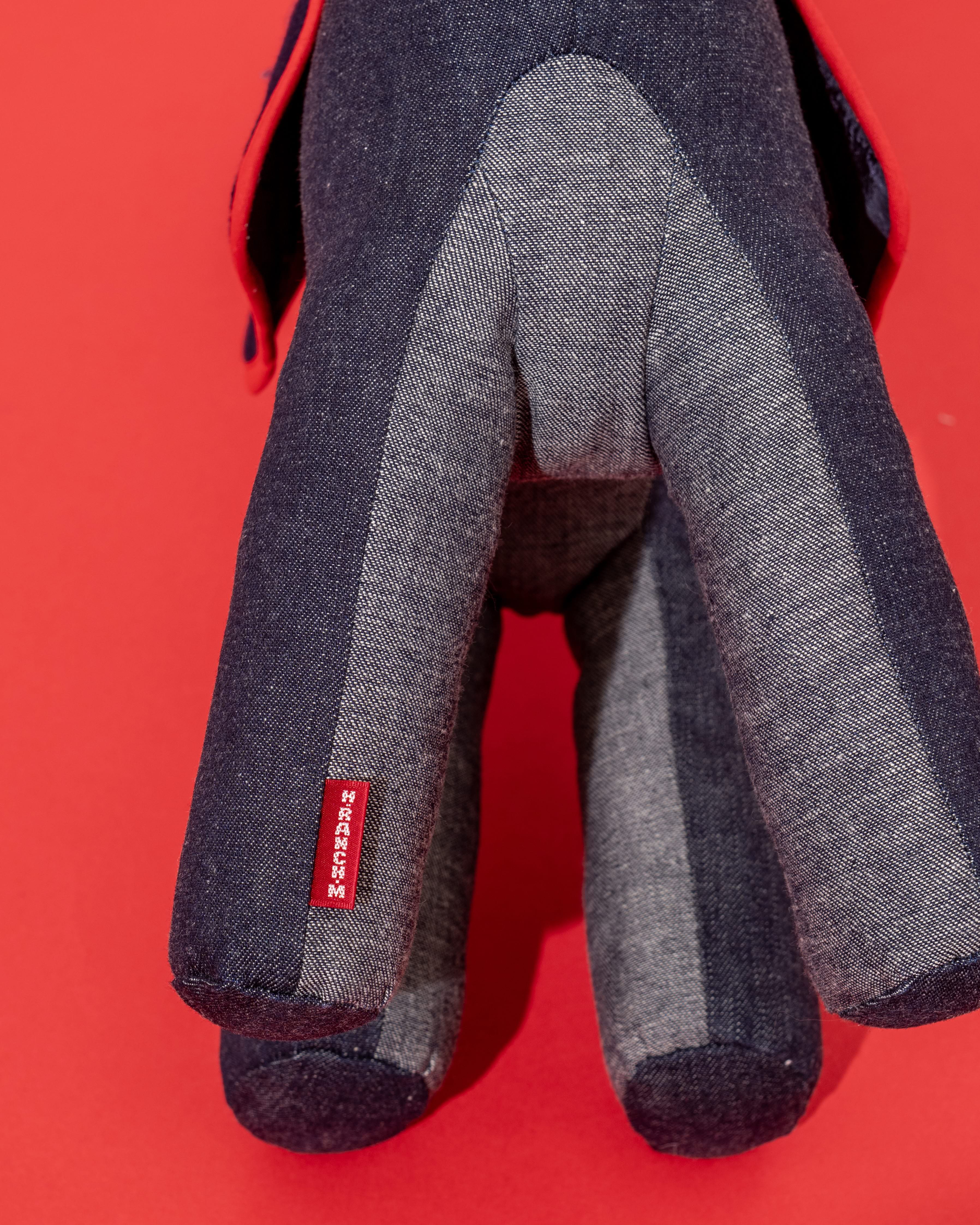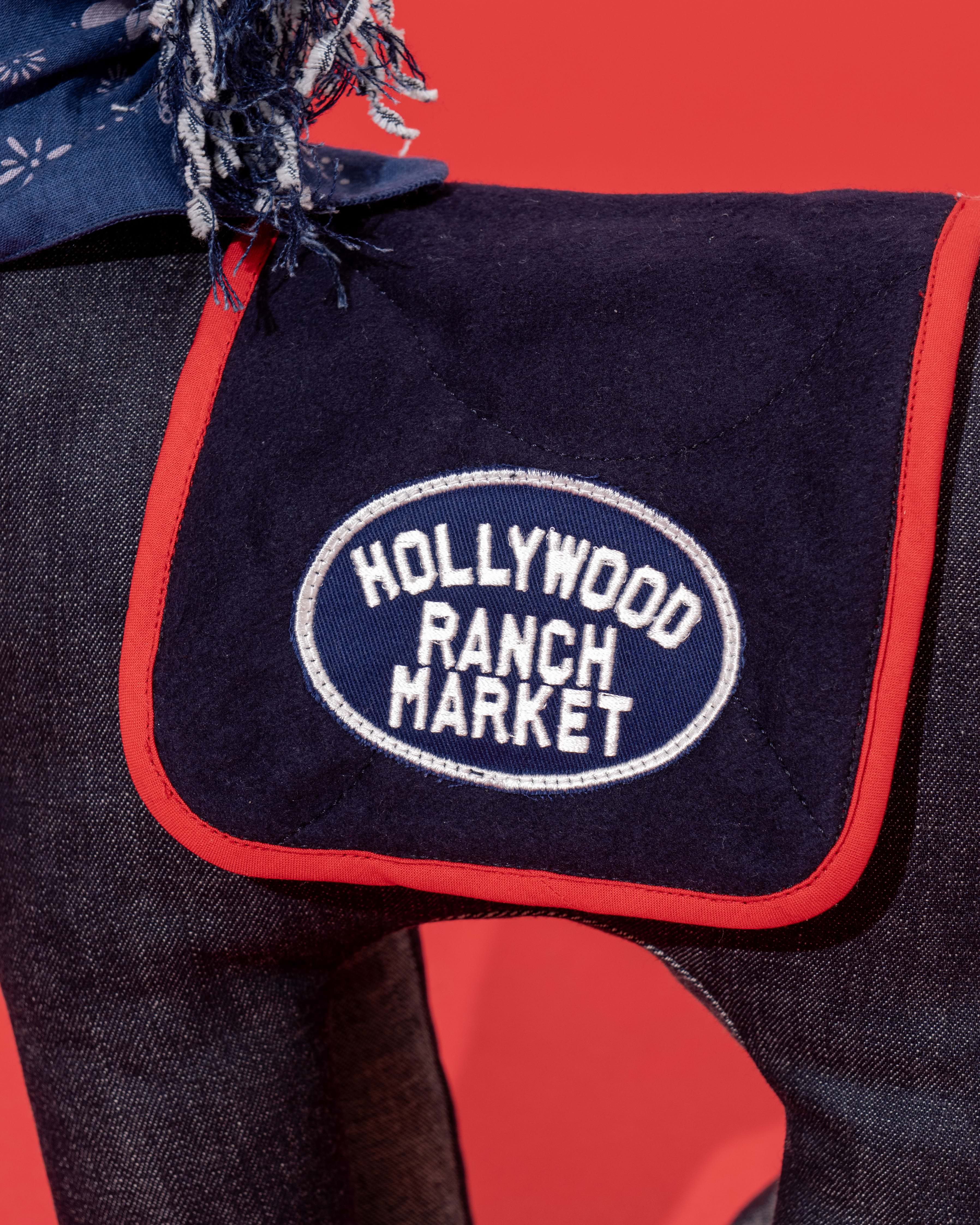 1点1点異なるデニムの切れ端をパッチワークし、たてがみと尻尾もデニムの残生地を裂いて表現しています。
