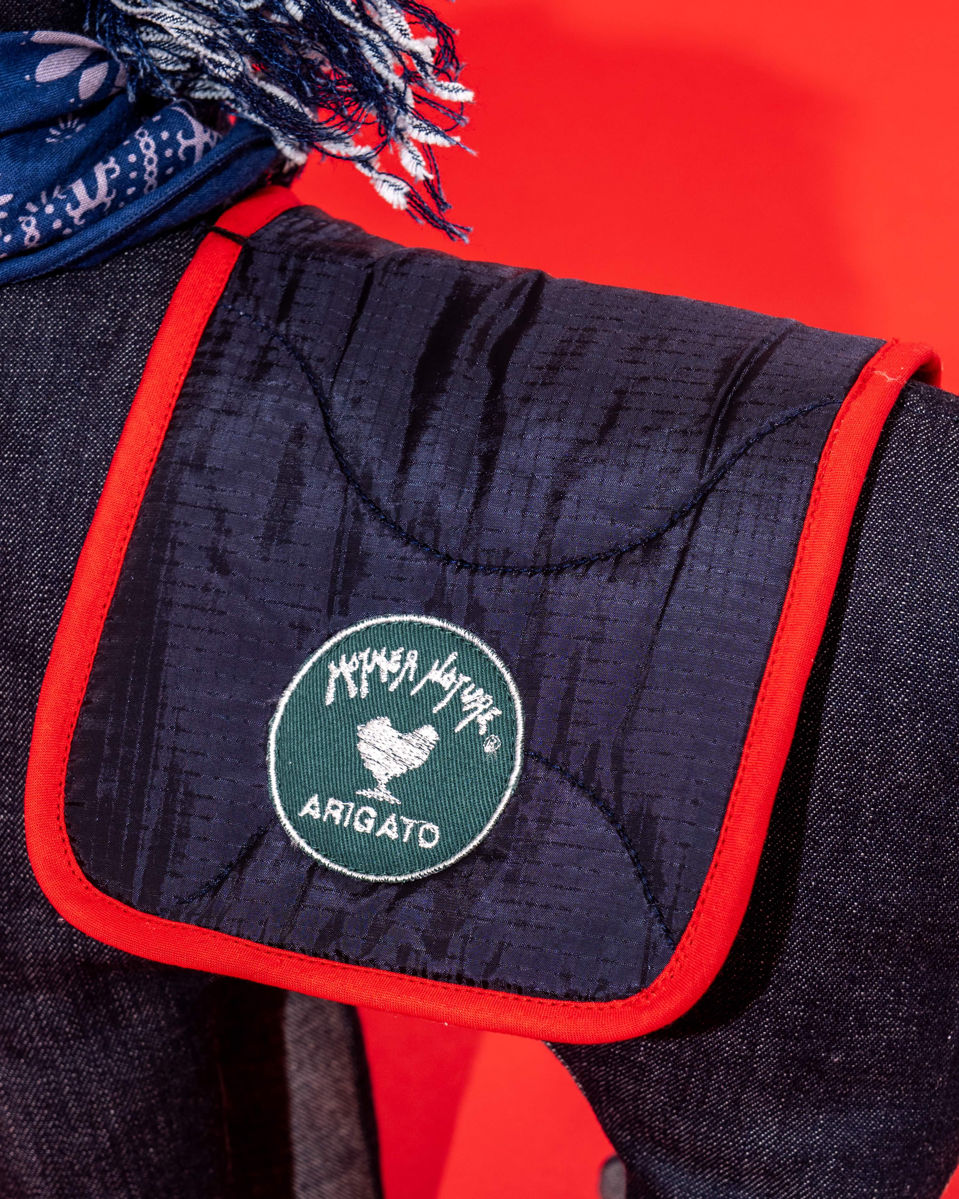 両面にオリジナルのワッペンをあしらい、キルティング面・メルトン面のどちらでもアクセントになるリバーシブル仕立てで、着せ替えを楽しめるようにしました。