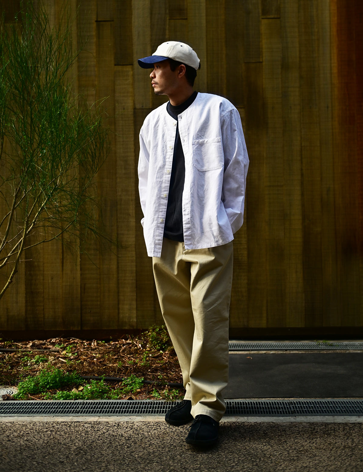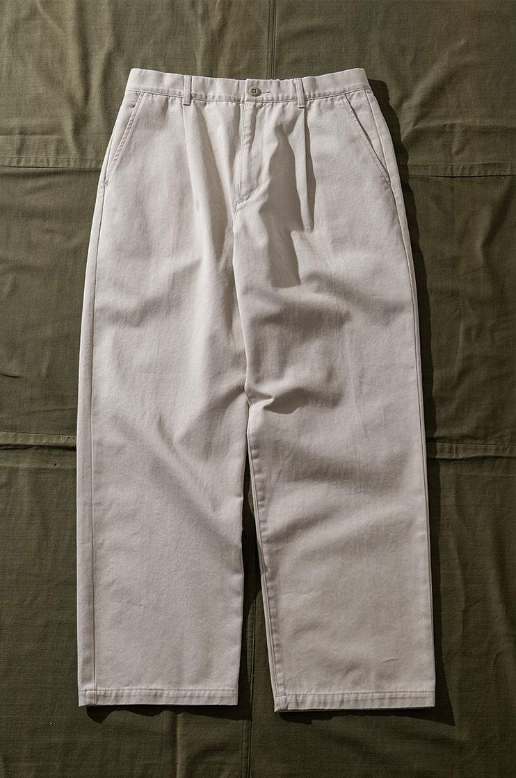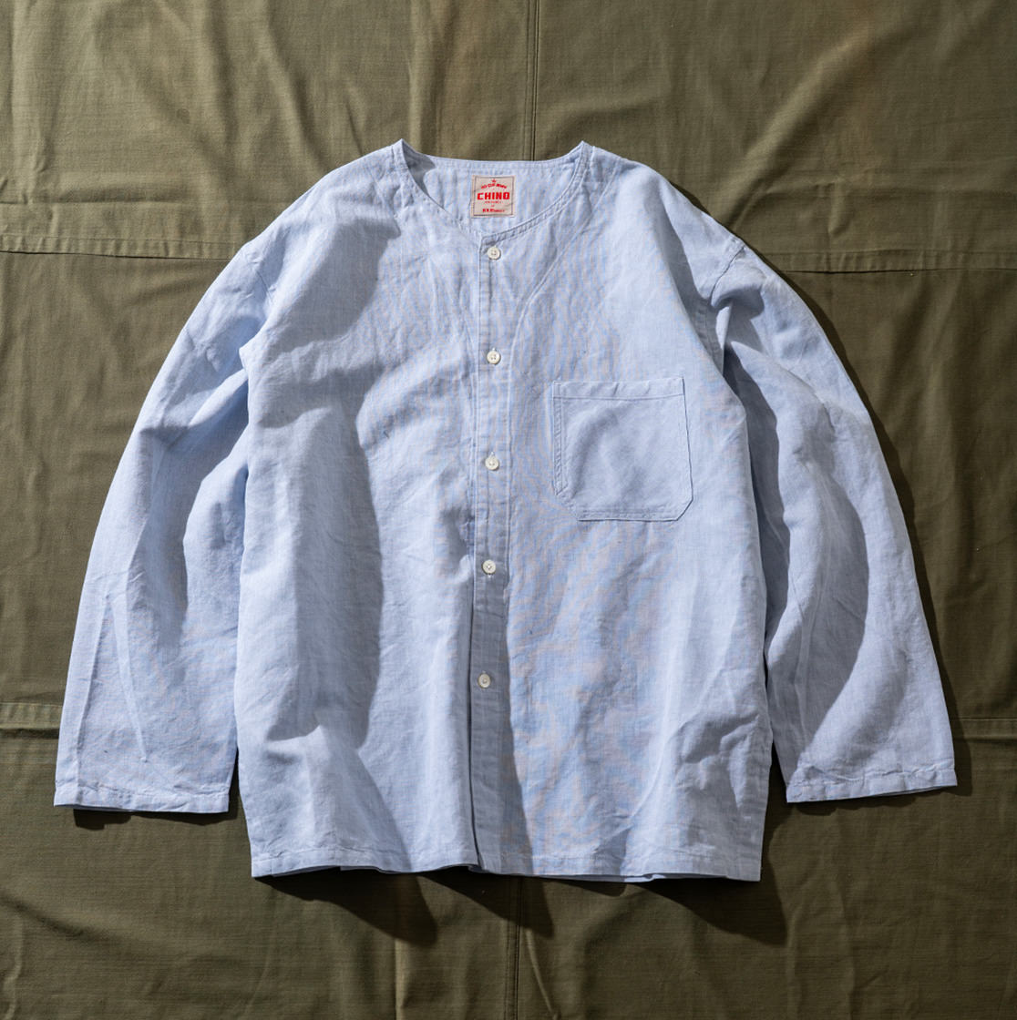 そのシリーズの復刻という流れで作成されたのが今作「ワンタックイージーチノトラウザーズ」です。シャツは実はイメージで、「アジアの人がこのチノパンをリアルに街着で着合わせるなら・・・」と作成された、このチノパンのために作られた特別なノーカラーシャツなのです。