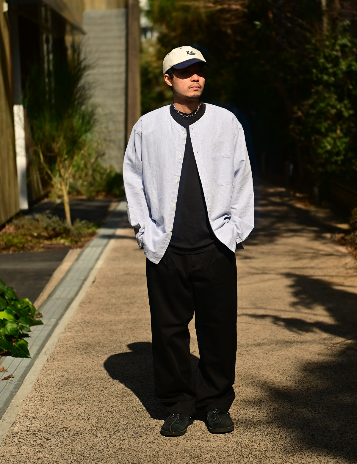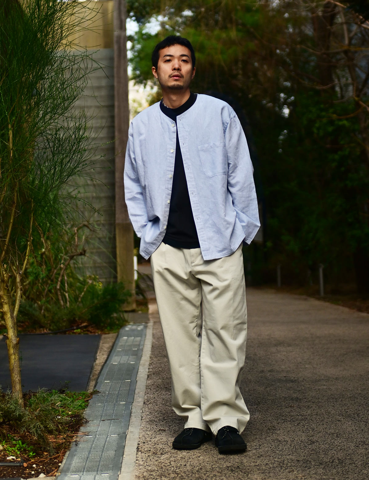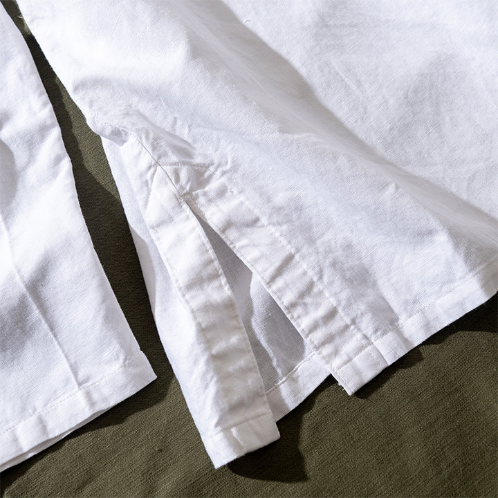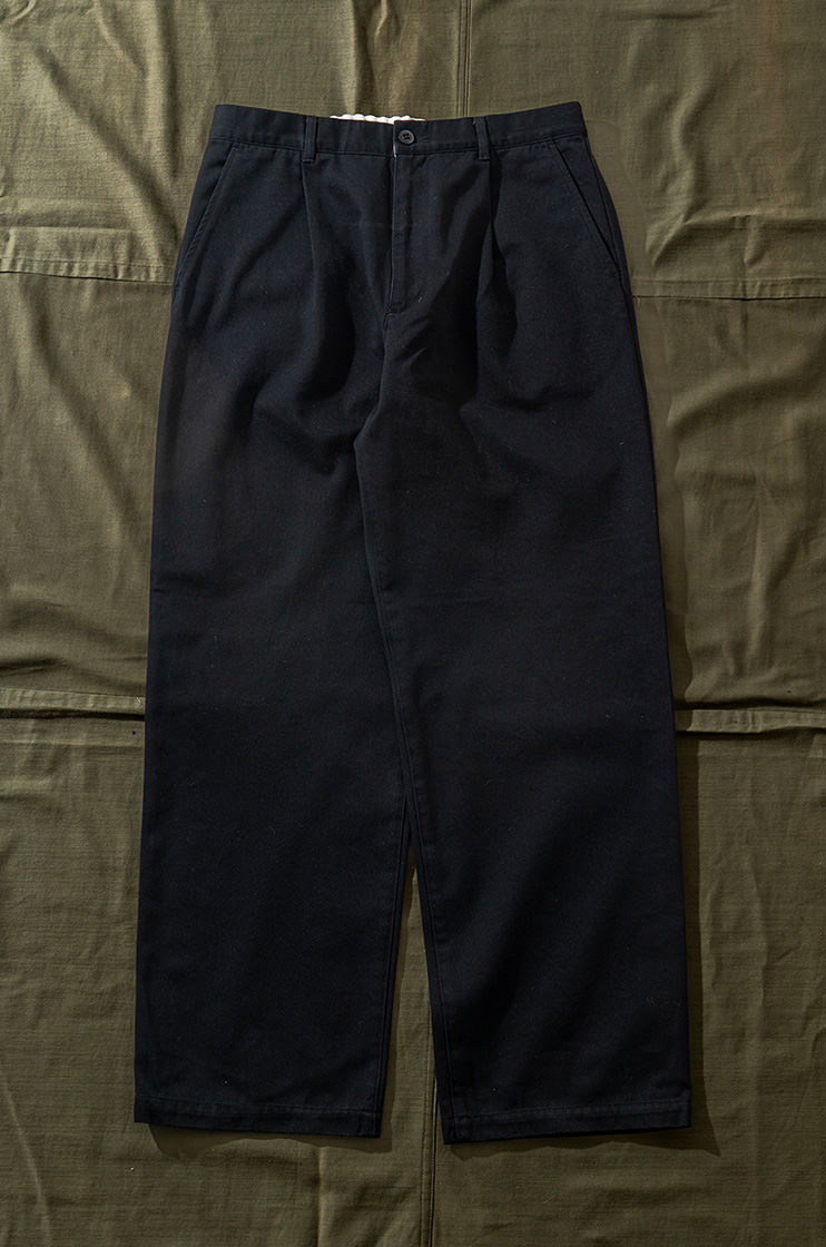 そのシリーズの復刻という流れで作成されたのが今作「ワンタックイージーチノトラウザーズ」です。シャツは実はイメージで、「アジアの人がこのチノパンをリアルに街着で着合わせるなら・・・」と作成された、このチノパンのために作られた特別なノーカラーシャツなのです。