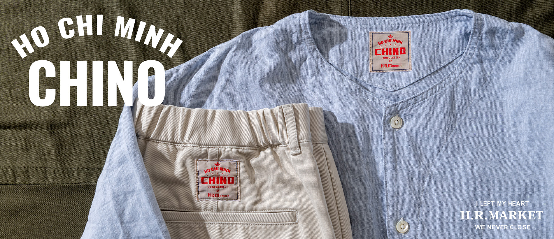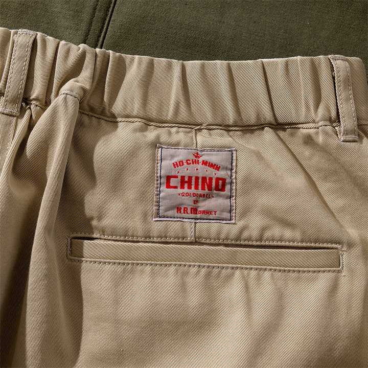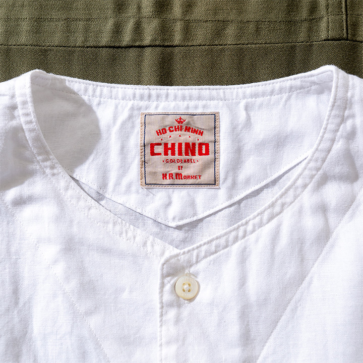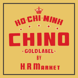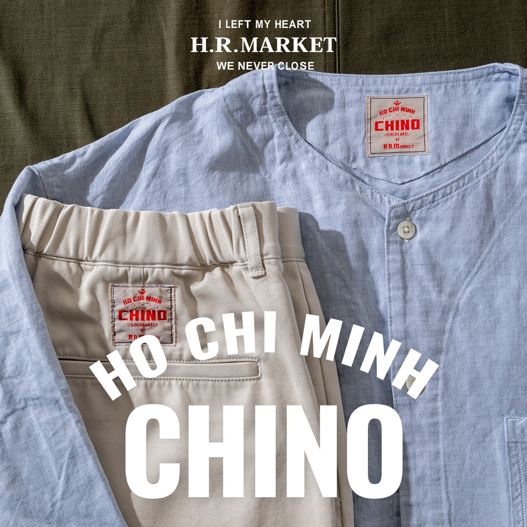 以前、聖林公司のなかで「ホーチミンチノ」をテーマにしたコレクションがありました。5,60年代当時、アメリカのチノ生地はベトナムから入ってくる事もあり、チノ(チノ・クロス)の語源は、スペイン語で「中国」や「中国の」を意味する「chino」に由来するといいます。アジアにゆかりのある生地という事で、ベトナム最大の経済都市である「ホーチミン」からその名をもらい、ユーモアをもって「ホーチミンチノ」と名付けました。アメリカのミリタリーアイテムである「チノ」というイメージを広げて解釈するような意味合いでチノのシリーズにこのネームをつけたといいます。