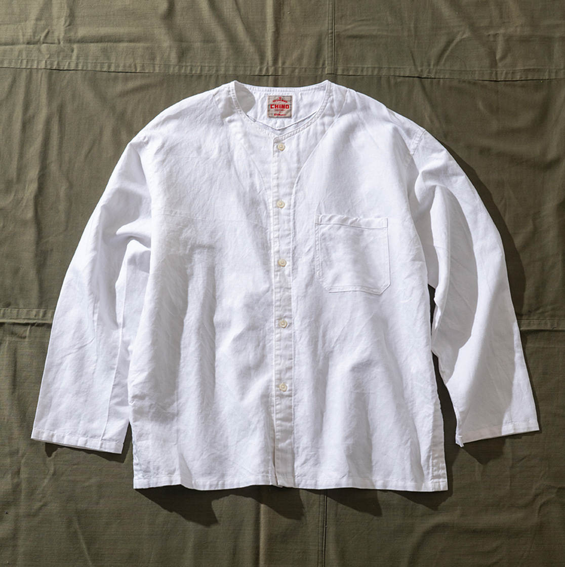 上品で現代的なシルエットのノーカラーシャツ。