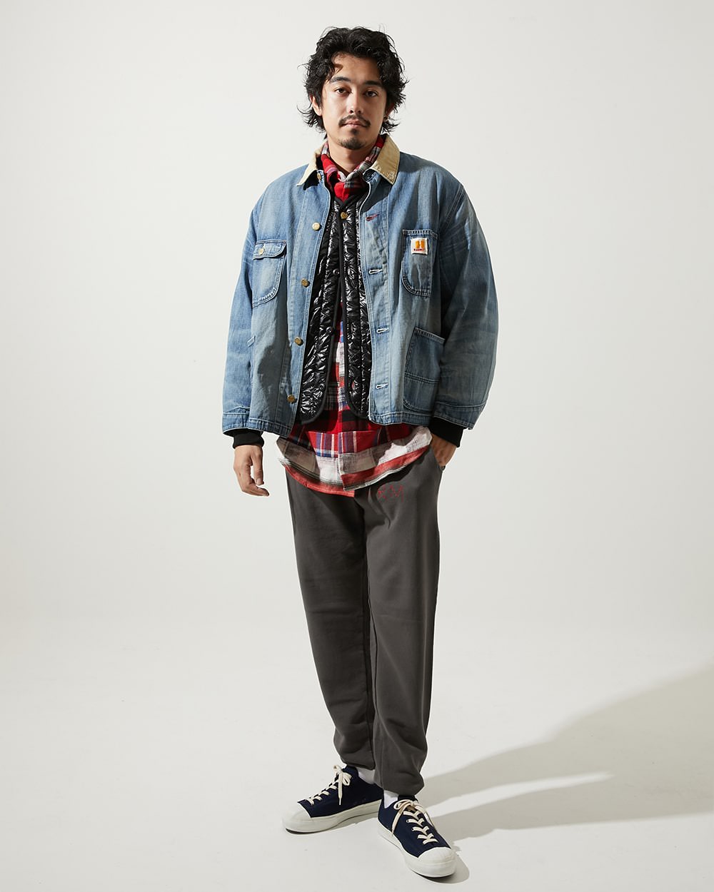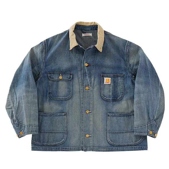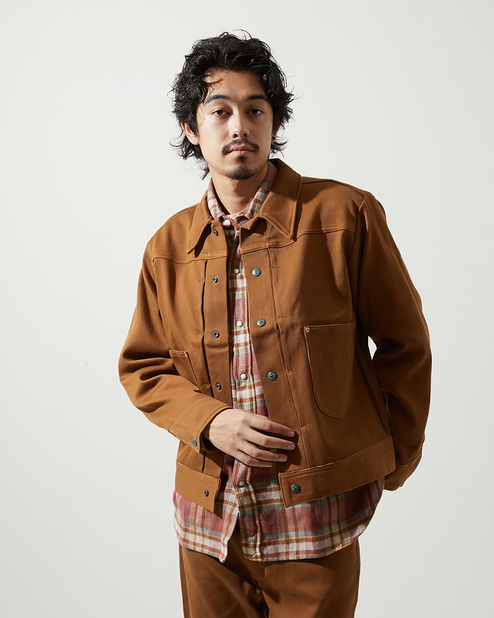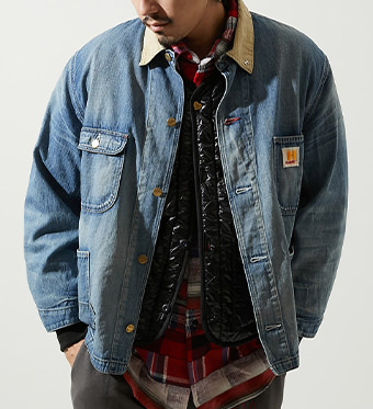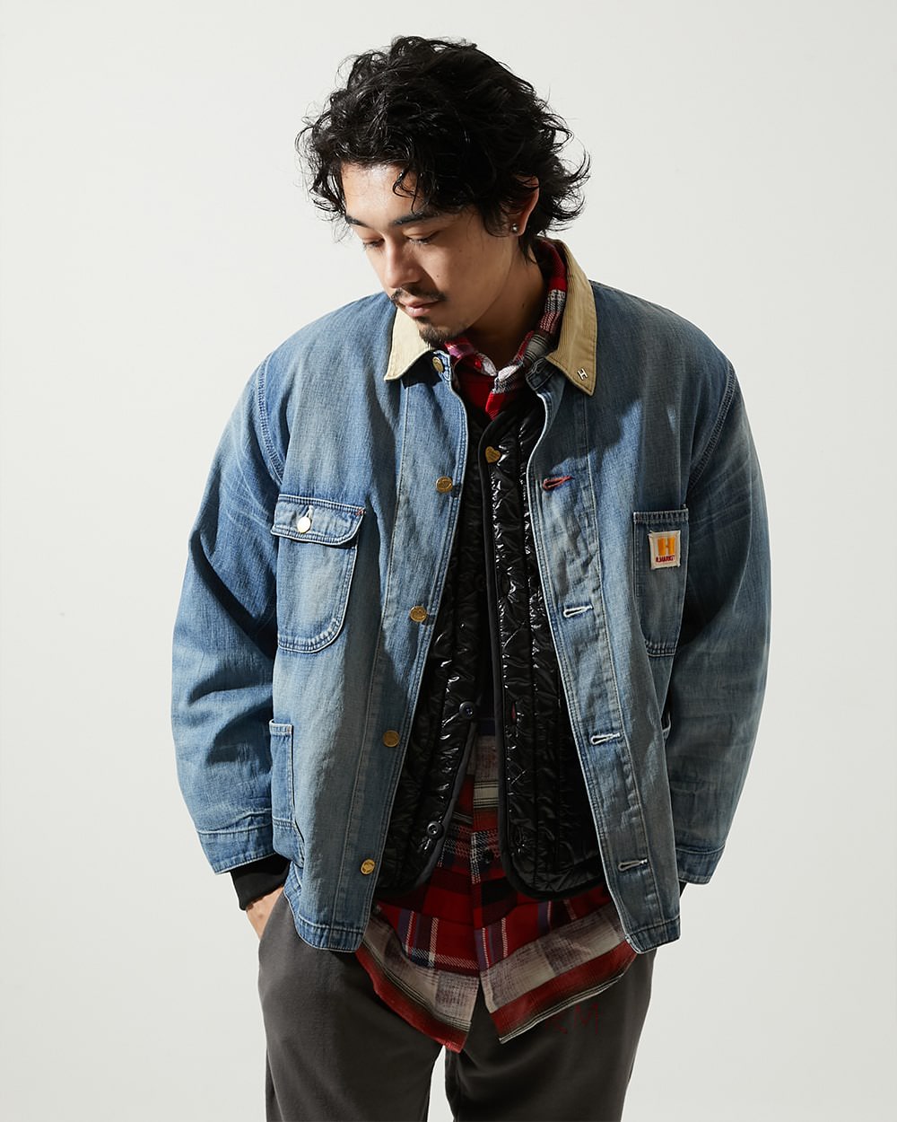 ショートレングスで、身幅にゆとりを持たせたシルエットのカバーオール。長年の着用により経年変化したイメージで、味わいのある加工感を表現しています。デニムの経年変化はもちろん、オリジナルのタックボタンにも経年変化が出ており、奥行きのある表情になっています。