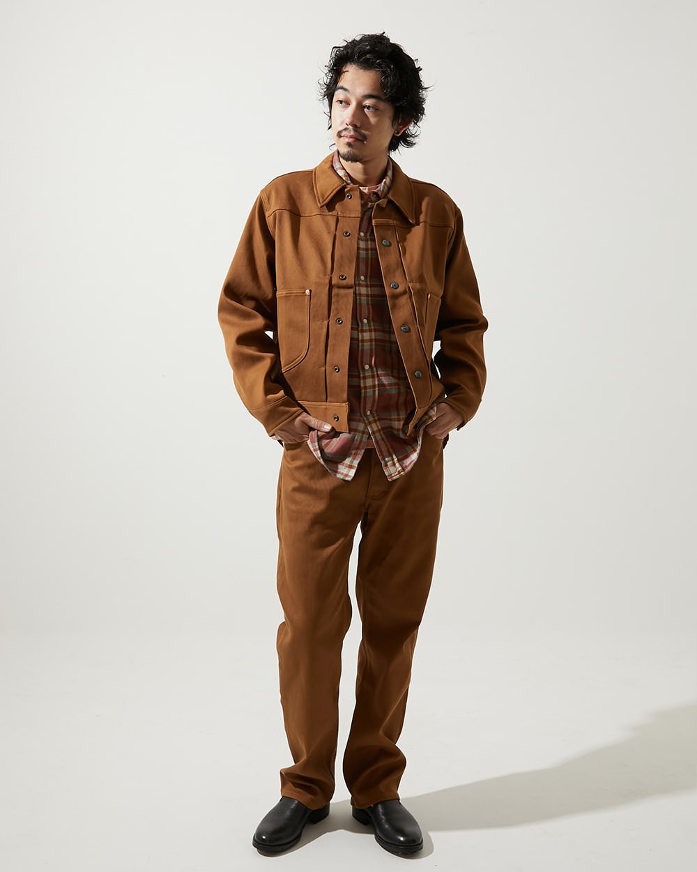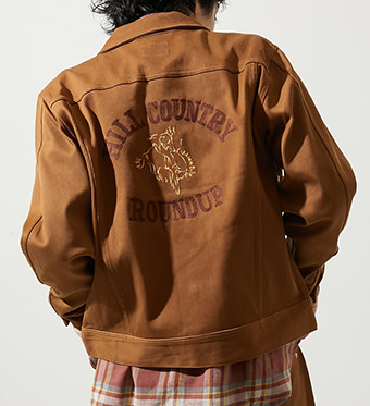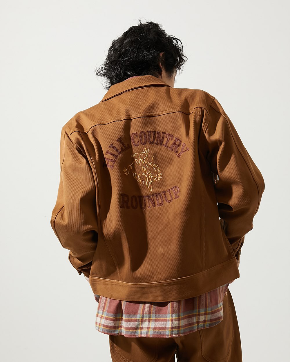 ヴィンテージにインスパイアされた一着。「Hill Country Roundup」のアートワーク刺しゅうがバックに施されています。生地はWytheのお気に入りであるワークウェアファブリックの一つ。非常に丈夫でありながらとても柔らかく、しなやかな日本製のベッドフォードコードを使用した生地です。使い込むほど柔らかくなるため、経年変化もお楽しみいただけます。