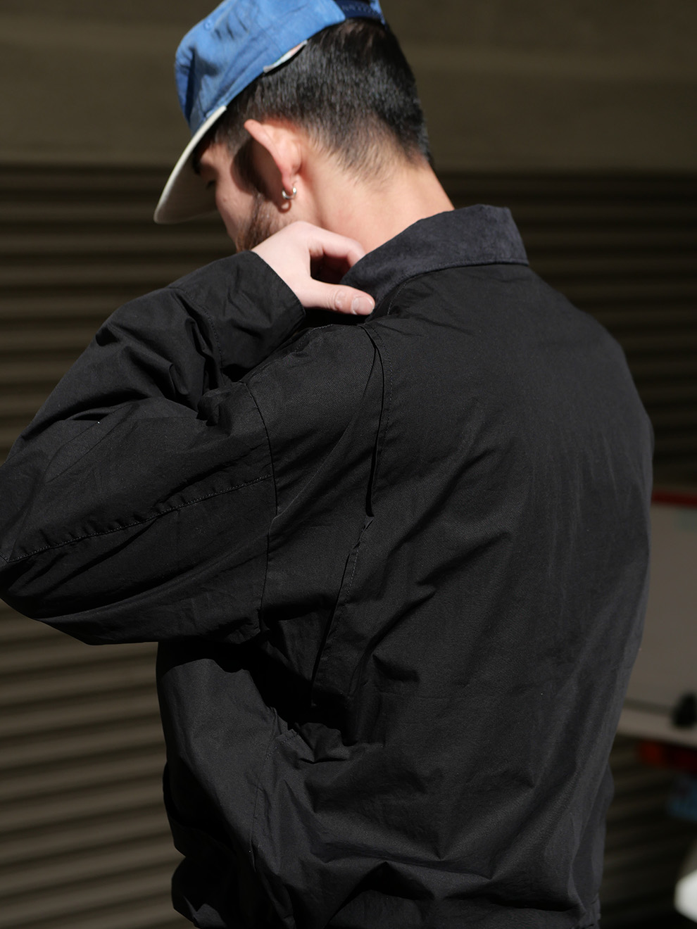 重たくなりすぎないよう襟部分のみ素材替え。両カラーともに黒の襟で仕上げることで、ネイビーは2トーンになります。