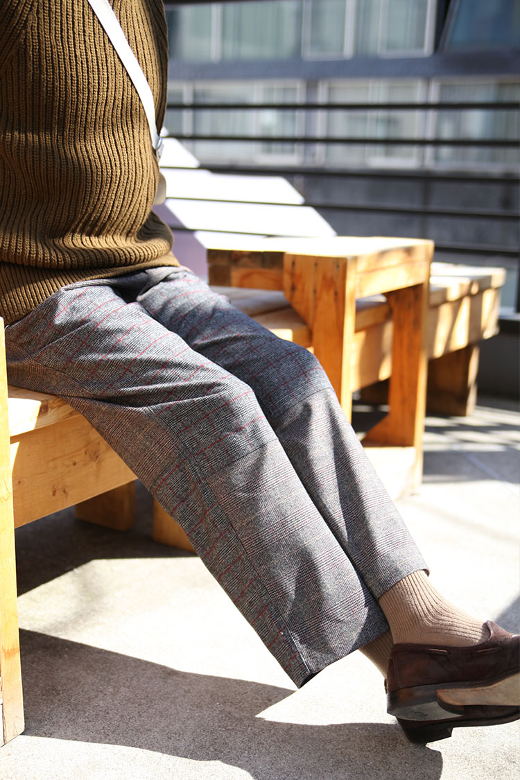 ワンサイズ大きいニットを選んでゆったりめに着ています。ゆるくなりすぎないようにトラウザーズを合わせました。