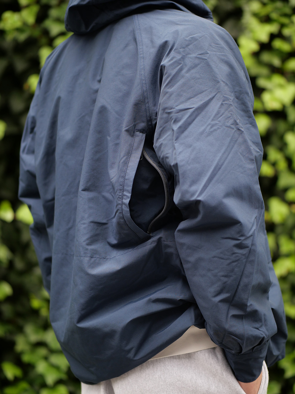ゆったりとした身幅に、お尻に掛かるような少しだけ長めの着丈が特徴。裾のドローコードを用いると、短丈のシルエットで着用することもできます。